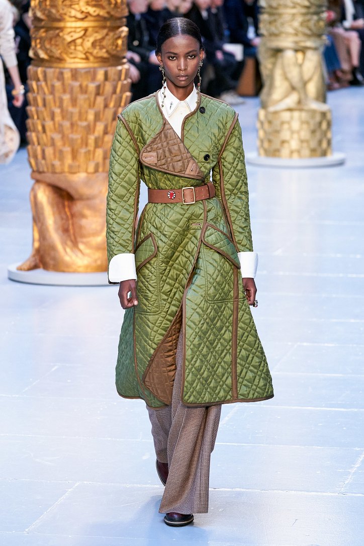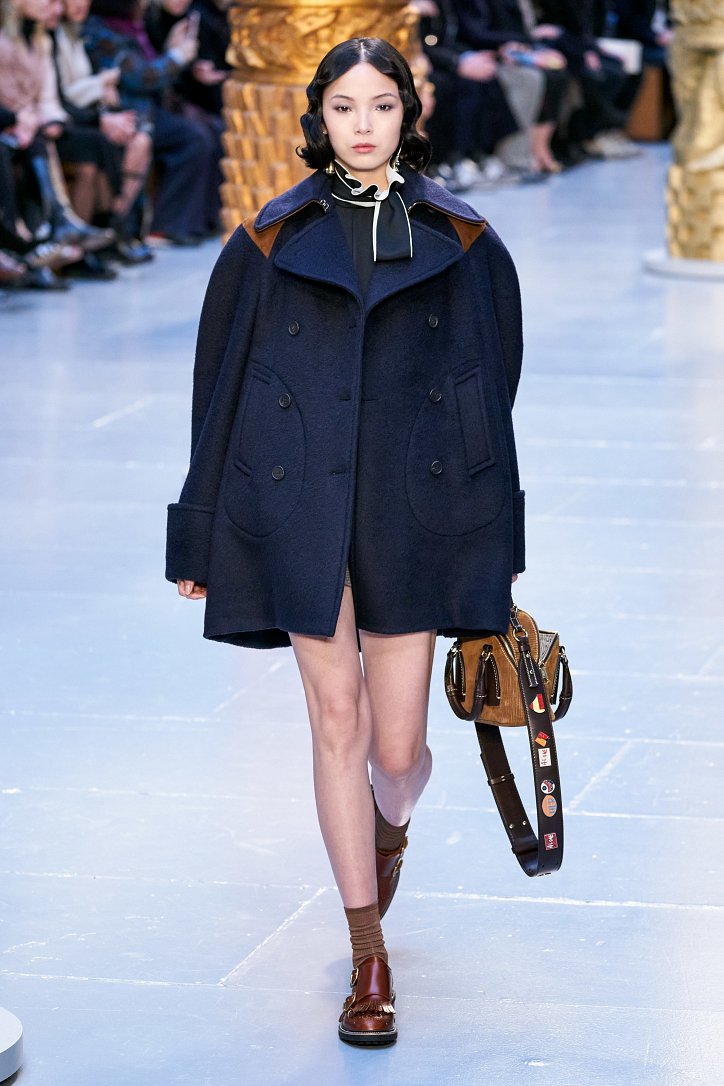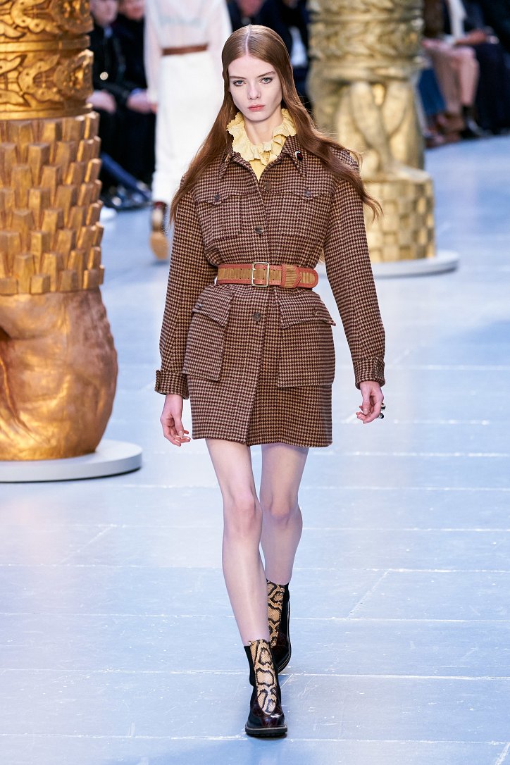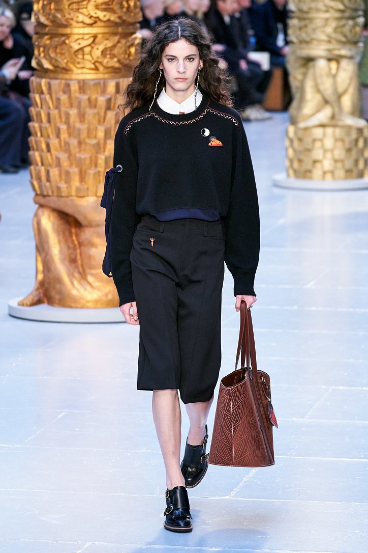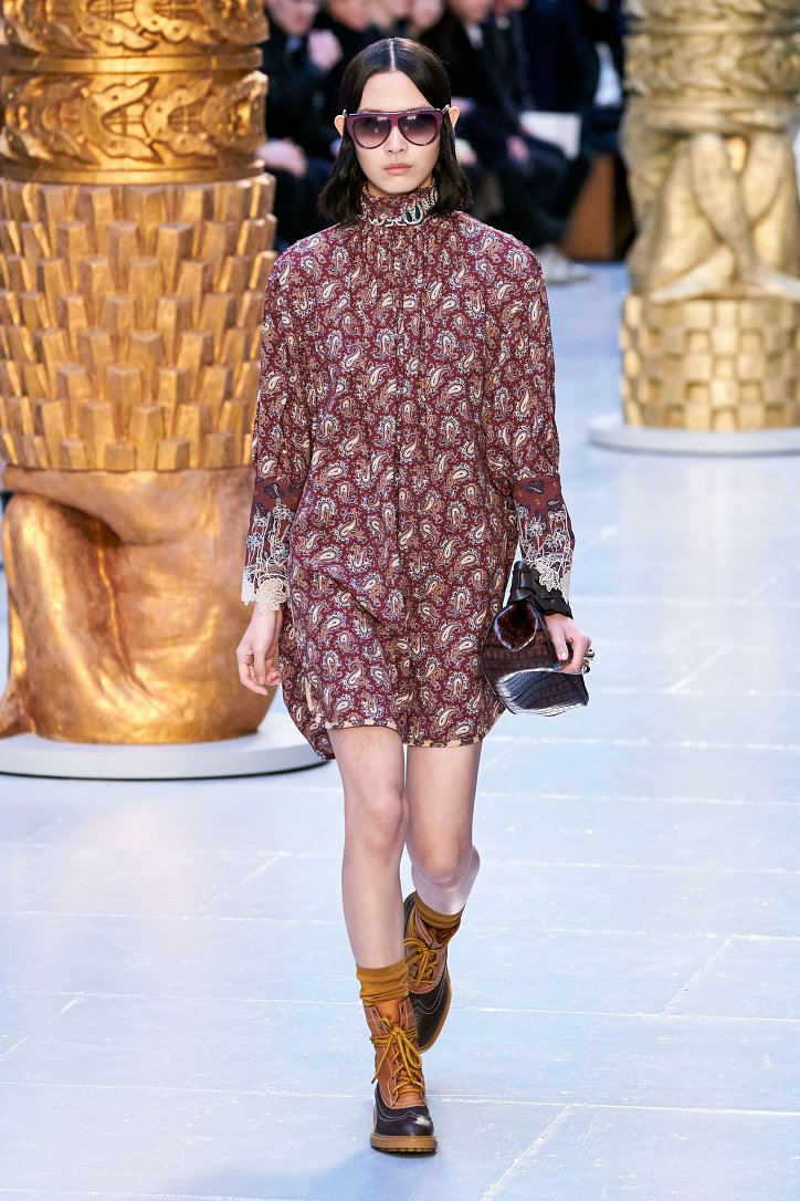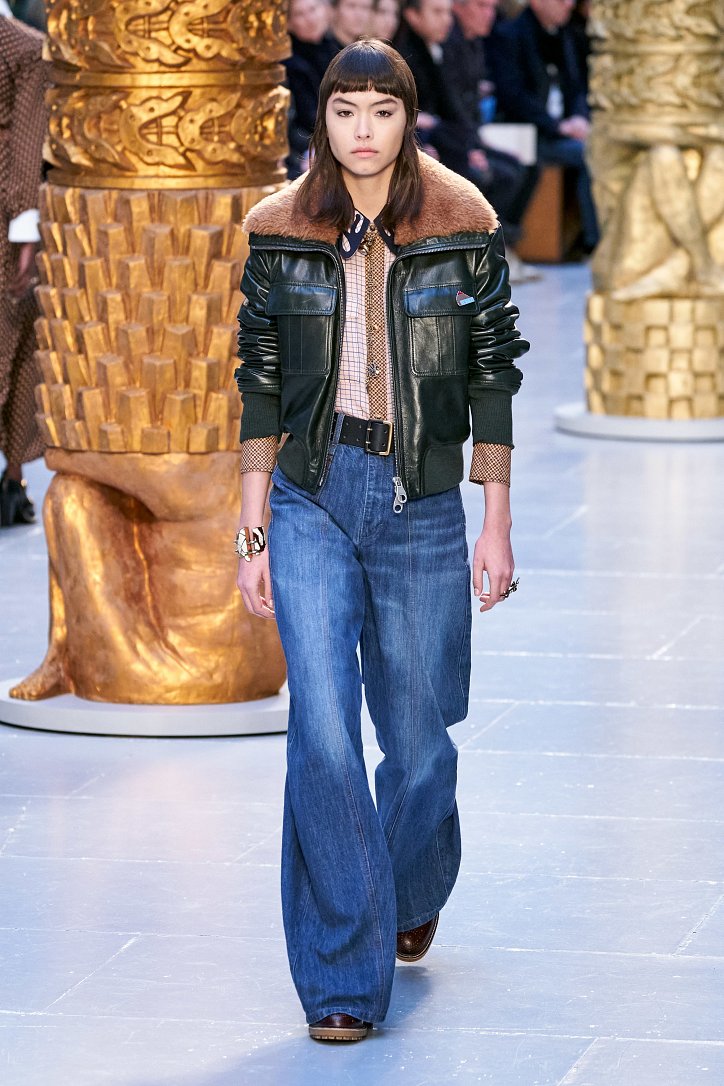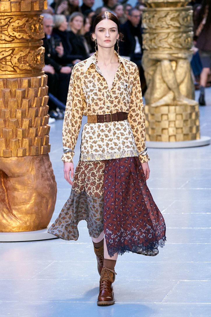 Пропитанная духом 70-ых и атмосферой творчества, новая коллекция Chloé была удивительно теплой и практичной. К будущему сезону Наташа Рамсей-Леви предложила стеганые пальто и дубленки, легкие блузы и клетчатые платья-рубашки, джинсы клеш и юбки из денима, уютный трикотаж и платья свободного силуэта, кожаные брюки и брючные костюмы с легким клешем штанин и закатанными рукавами жакетов.