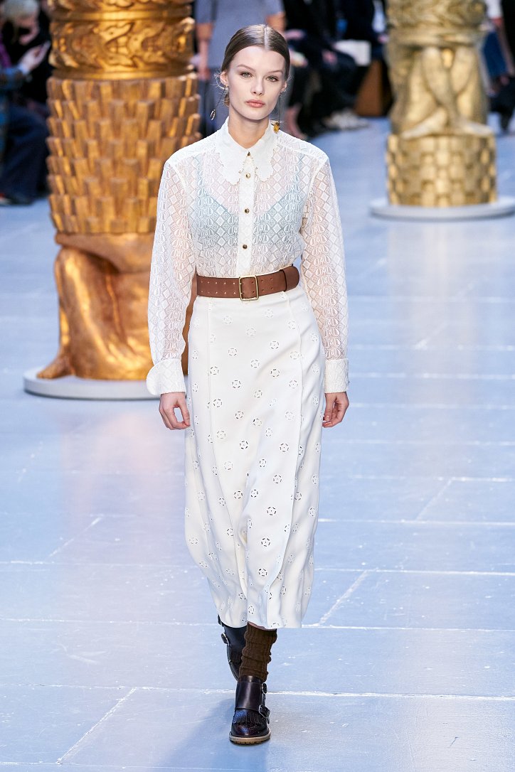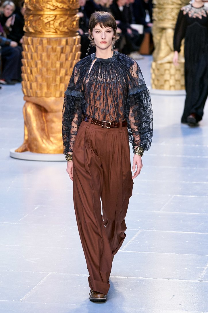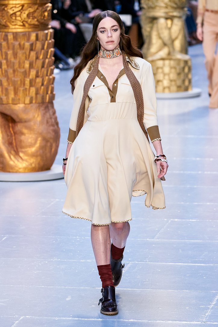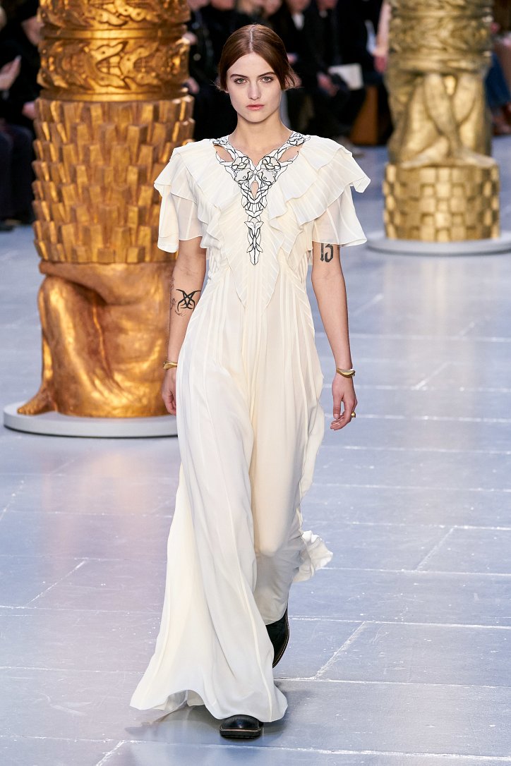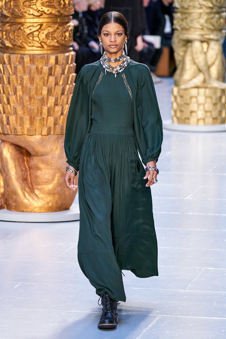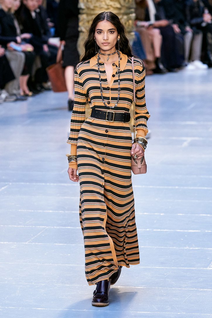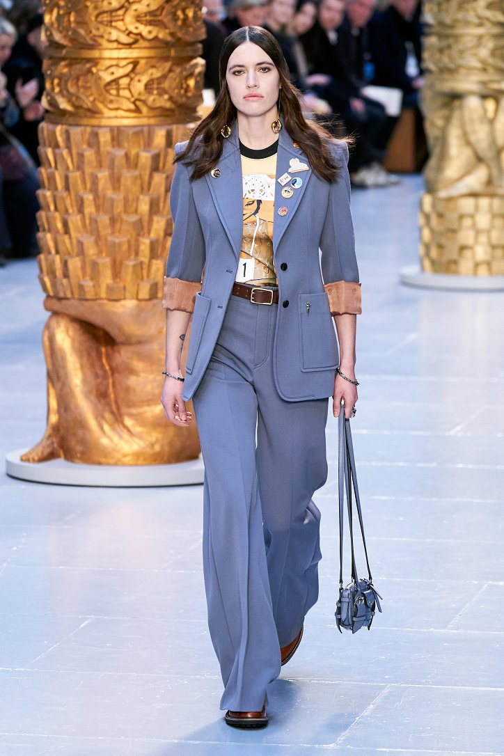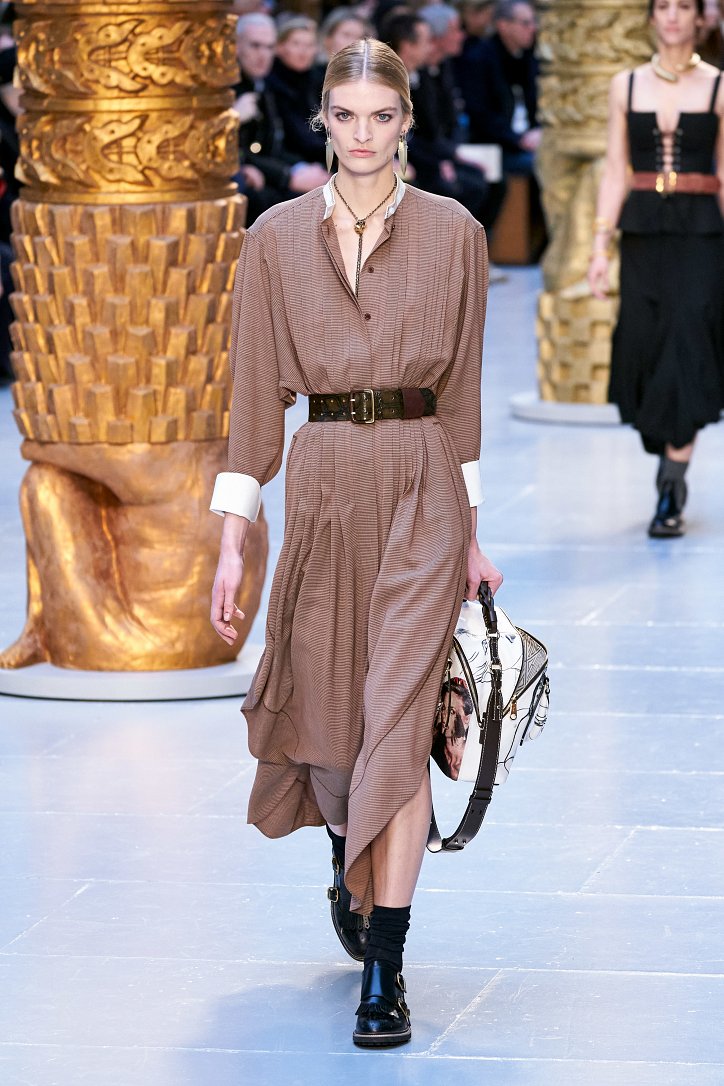 Пропитанная духом 70-ых и атмосферой творчества, новая коллекция Chloé была удивительно теплой и практичной. К будущему сезону Наташа Рамсей-Леви предложила стеганые пальто и дубленки, легкие блузы и клетчатые платья-рубашки, джинсы клеш и юбки из денима, уютный трикотаж и платья свободного силуэта, кожаные брюки и брючные костюмы с легким клешем штанин и закатанными рукавами жакетов.