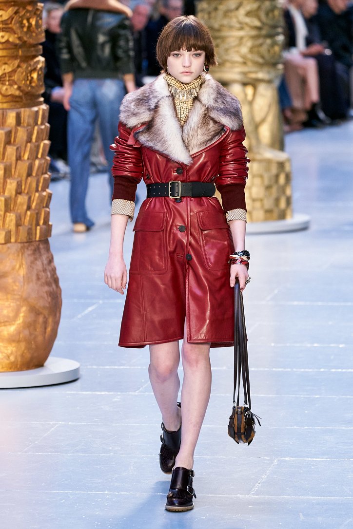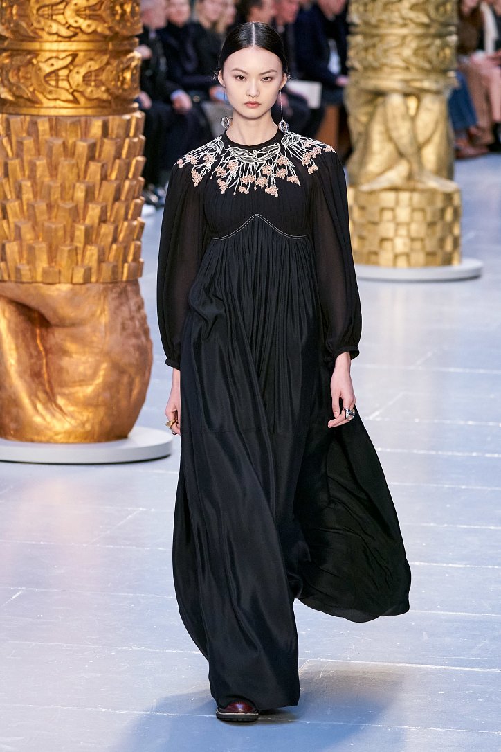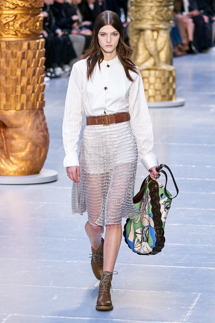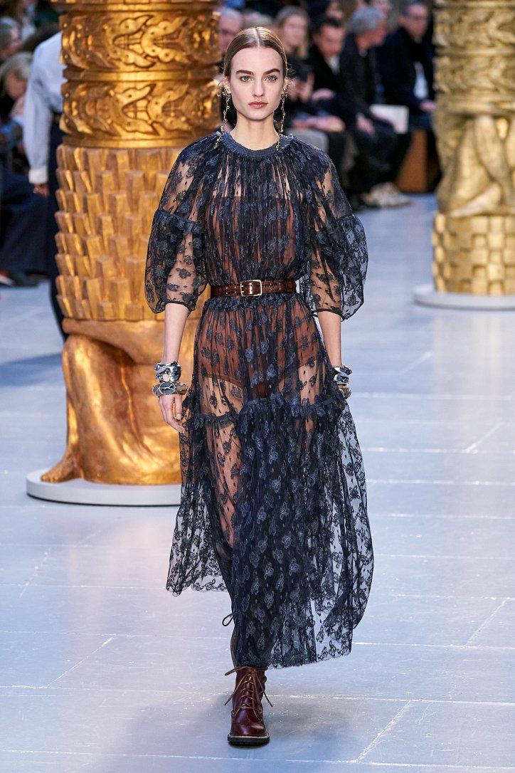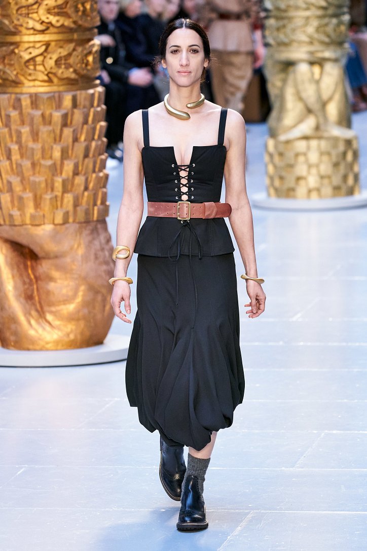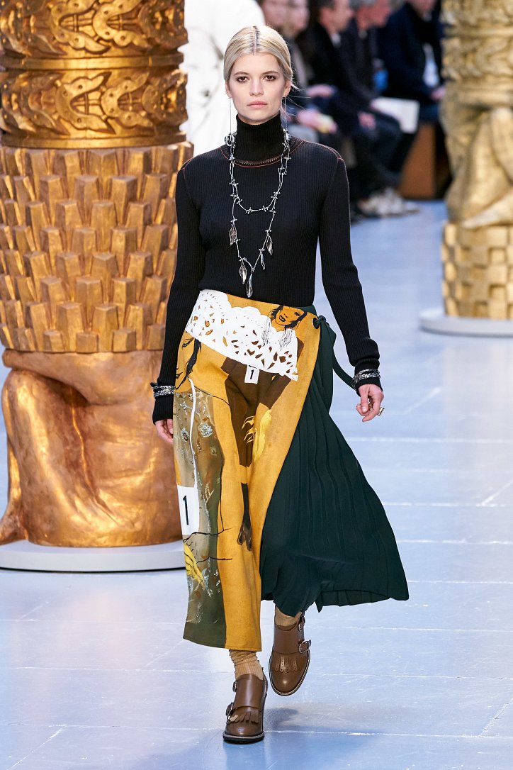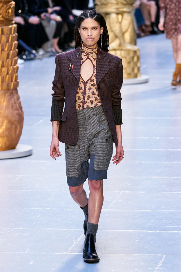 Пропитанная духом 70-ых и атмосферой творчества, новая коллекция Chloé была удивительно теплой и практичной. К будущему сезону Наташа Рамсей-Леви предложила стеганые пальто и дубленки, легкие блузы и клетчатые платья-рубашки, джинсы клеш и юбки из денима, уютный трикотаж и платья свободного силуэта, кожаные брюки и брючные костюмы с легким клешем штанин и закатанными рукавами жакетов.
