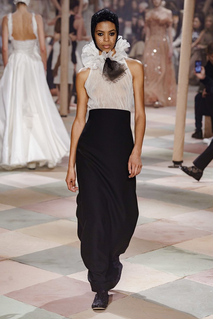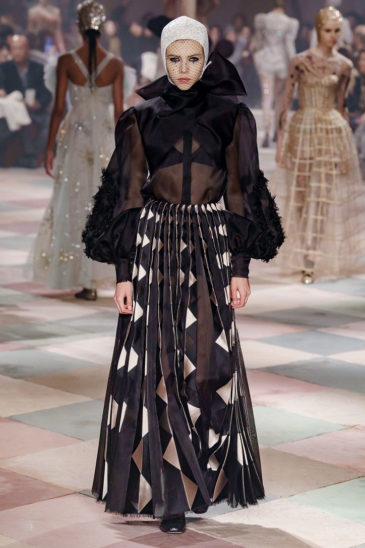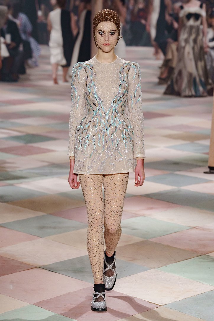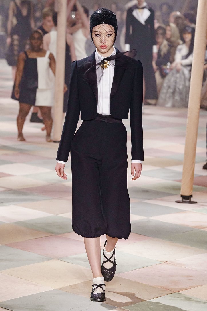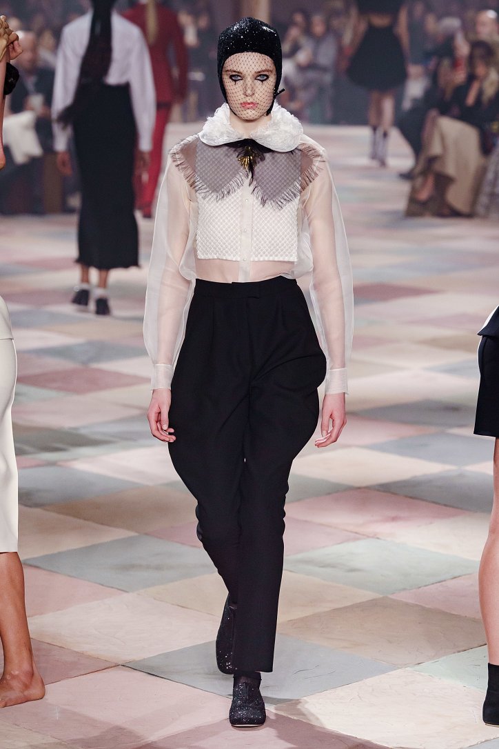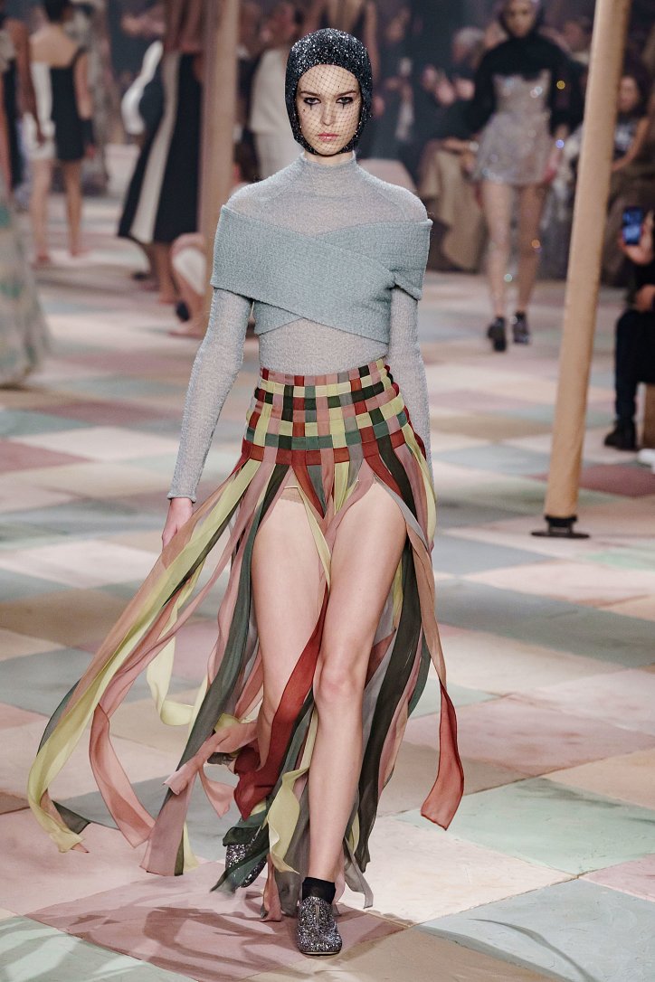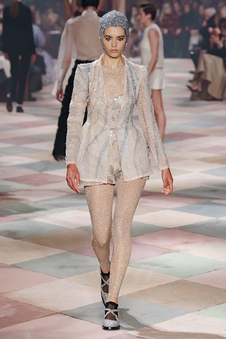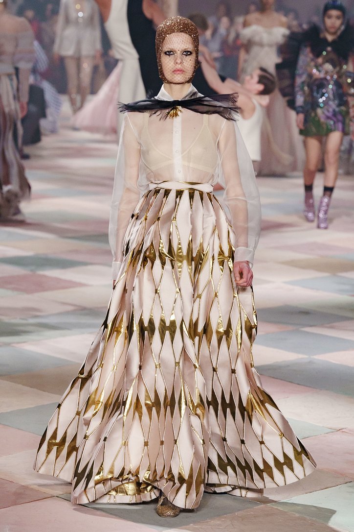 Кутюрная коллекция Christian Dior – словно продолжение весенне-летней коллекции 2019, только в других декорациях. Вместо балета Мария Грация Кьюри решила перенестись на арену цирка, так что вместо балетной труппы «фоном» для показа в этот раз были акробаты и гимнасты. Да и в самой коллекции отчетливо был заметен «цирковой след»: блестки и яркие цвета играли в ней ведущую роль, а в поисках идей дизайнер погрузилась в исследование работ Пабло Пикассо, Синди Шерман, Ричард Аведона и фильмов Жана Кокто.