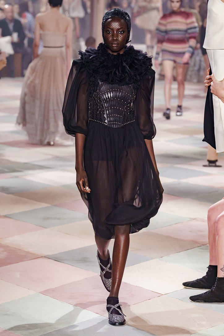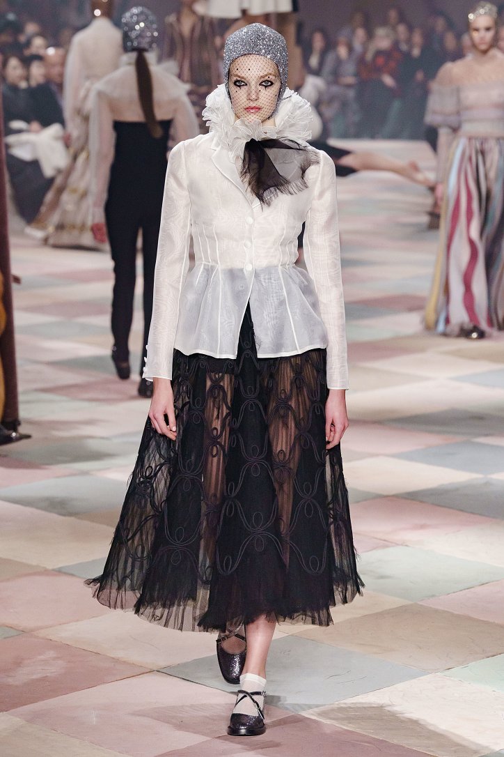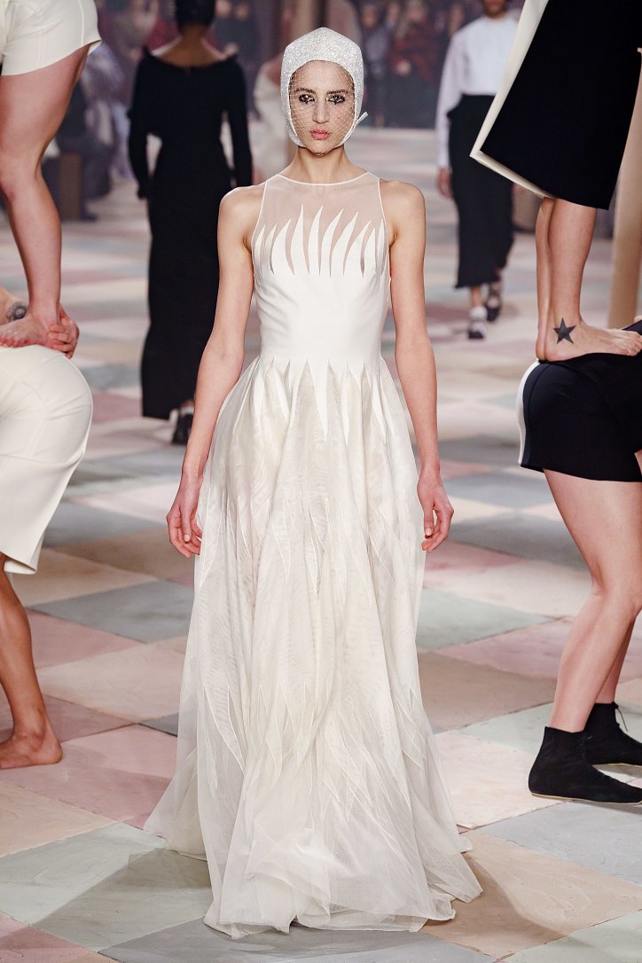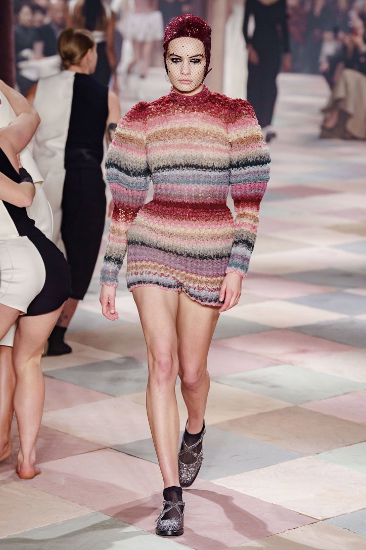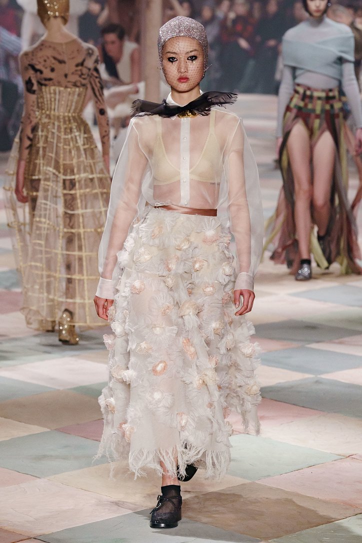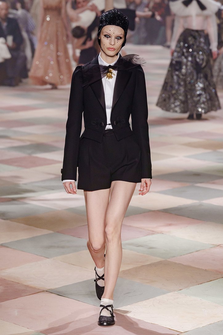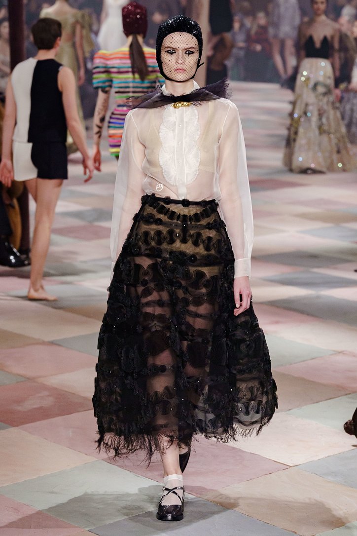 Кутюрная коллекция Christian Dior – словно продолжение весенне-летней коллекции 2019, только в других декорациях. Вместо балета Мария Грация Кьюри решила перенестись на арену цирка, так что вместо балетной труппы «фоном» для показа в этот раз были акробаты и гимнасты. Да и в самой коллекции отчетливо был заметен «цирковой след»: блестки и яркие цвета играли в ней ведущую роль, а в поисках идей дизайнер погрузилась в исследование работ Пабло Пикассо, Синди Шерман, Ричард Аведона и фильмов Жана Кокто.