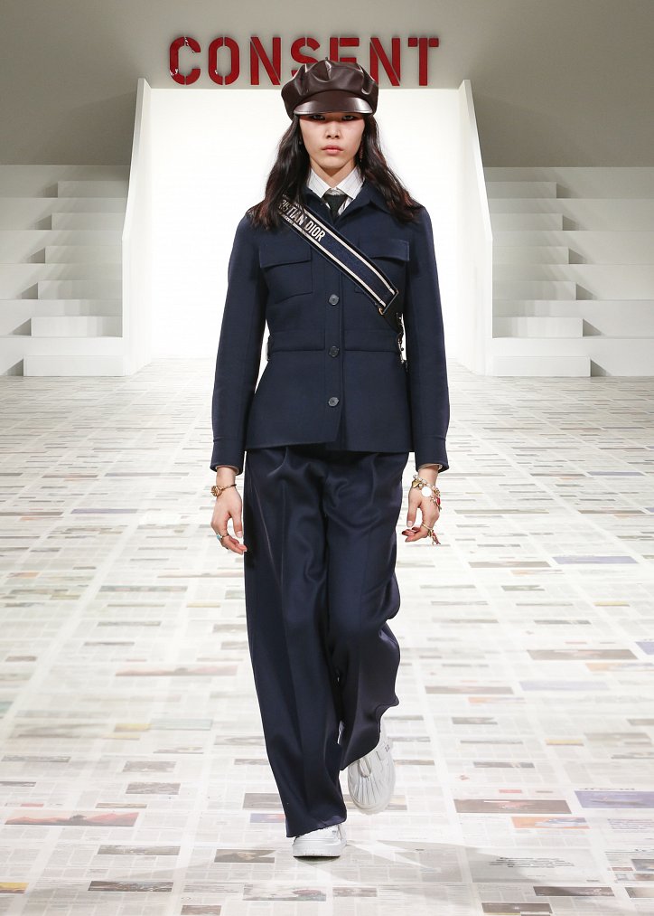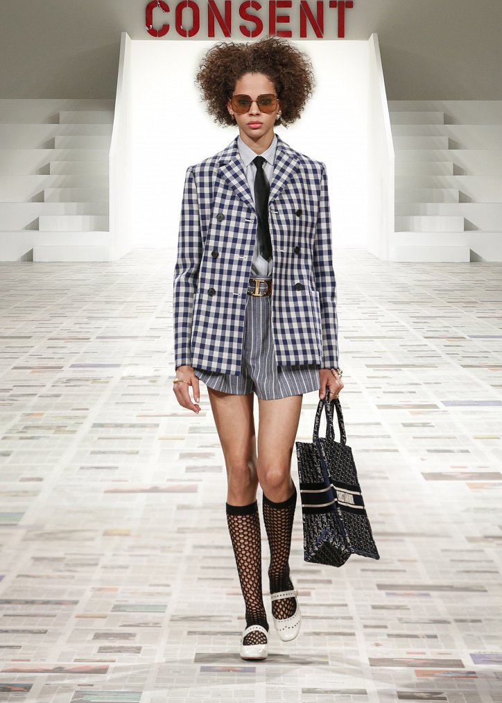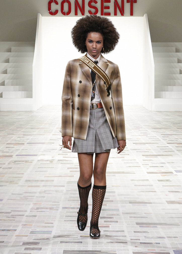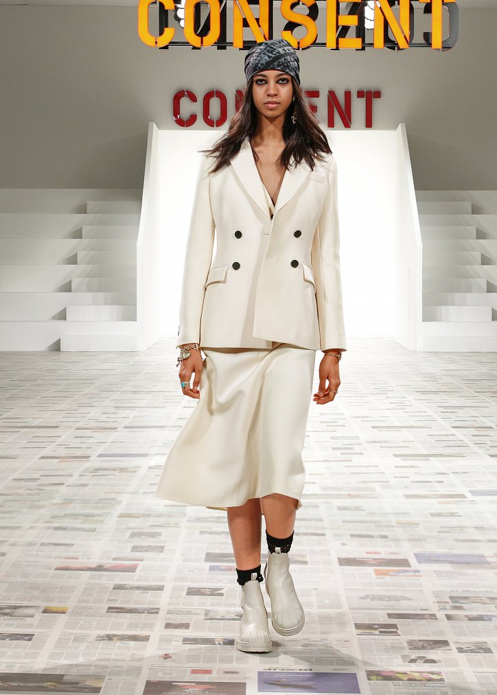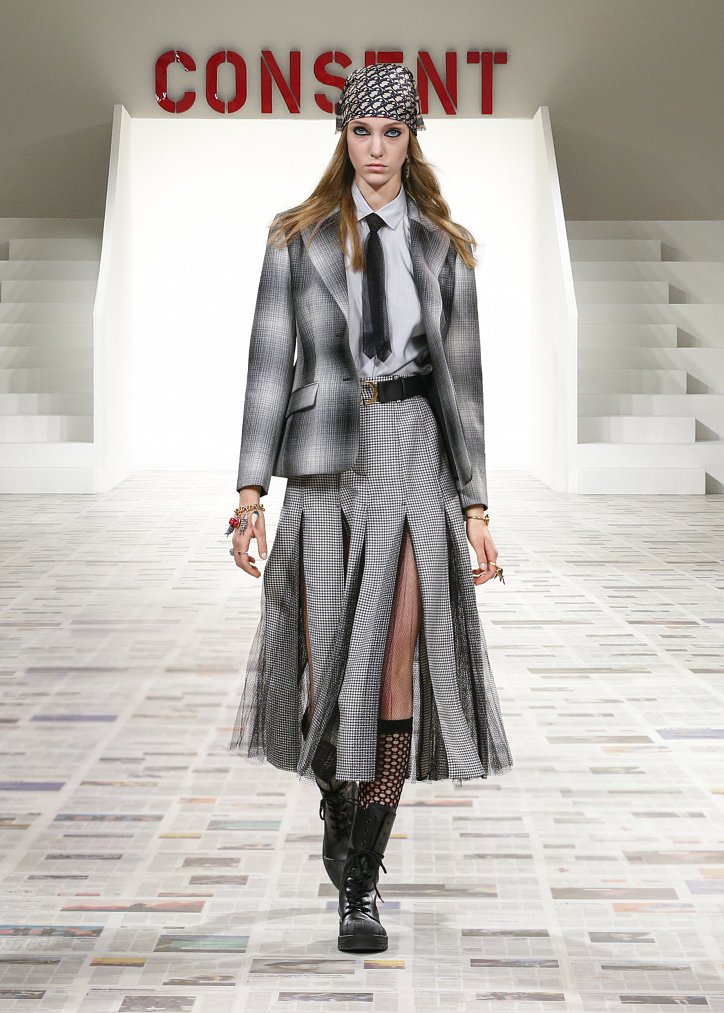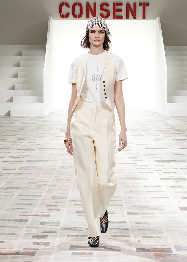 Устланный газетами подиум и сверкающие неоном феминистские лозунги над ним - таким был антураж показа коллекции Christian Dior.