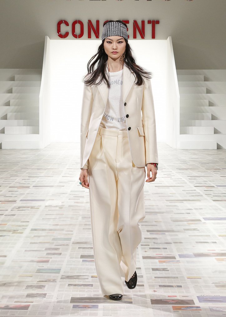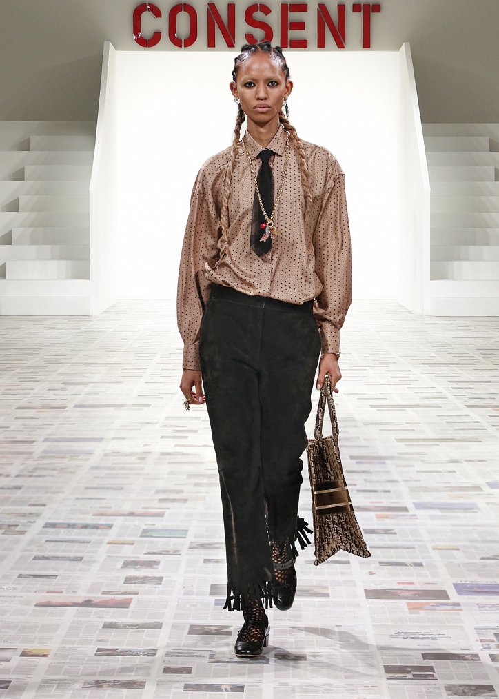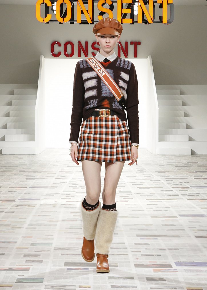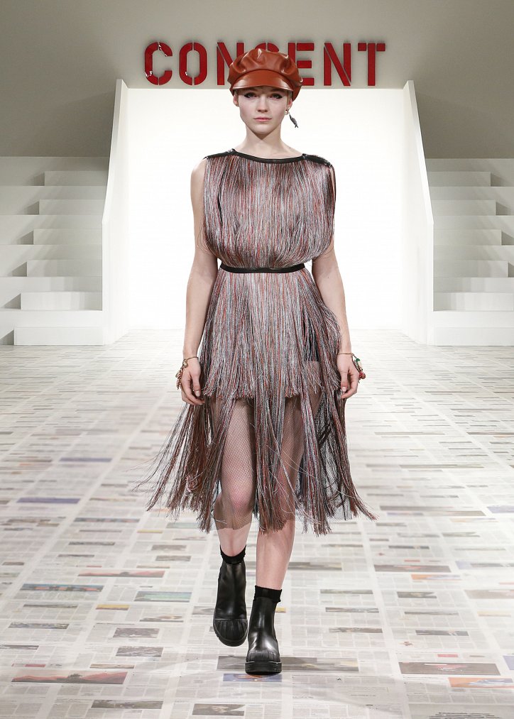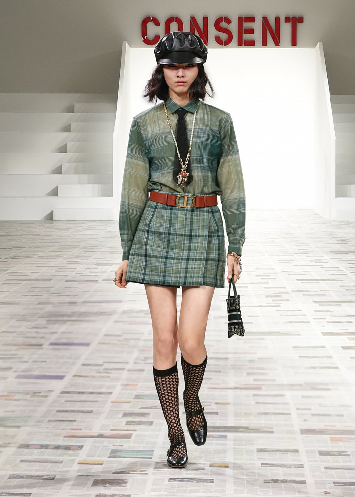 Устланный газетами подиум и сверкающие неоном феминистские лозунги над ним - таким был антураж показа коллекции Christian Dior.