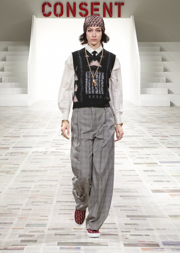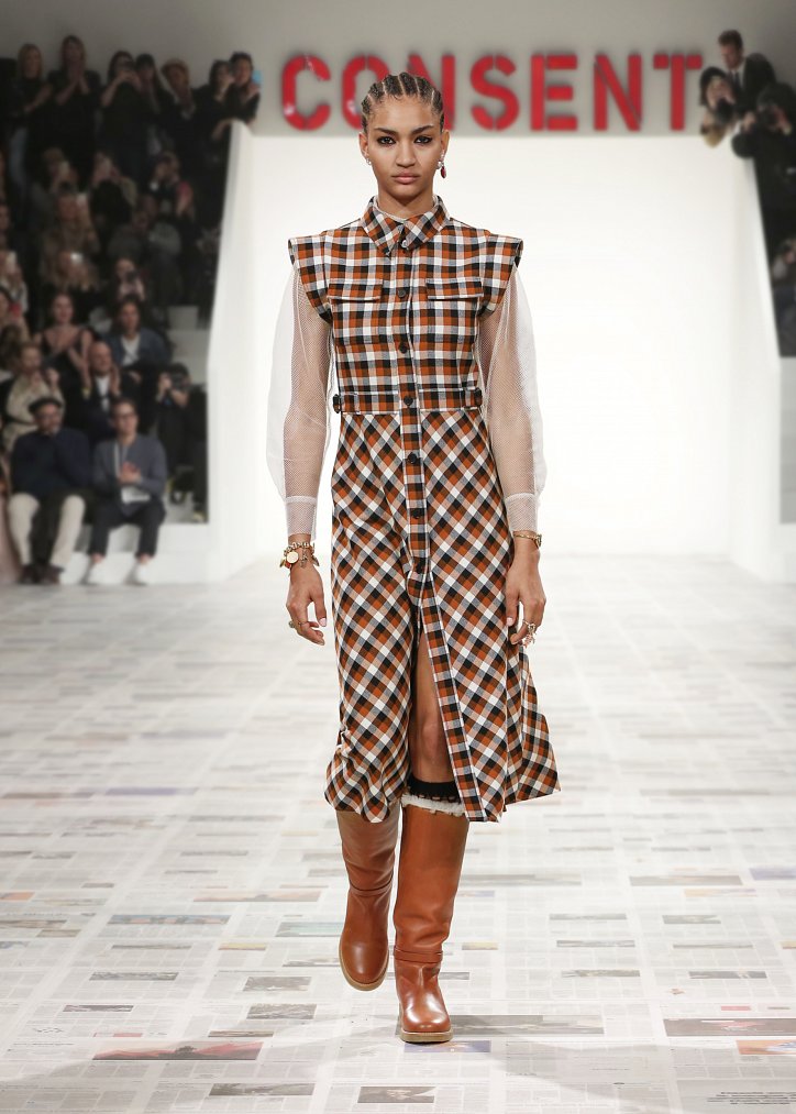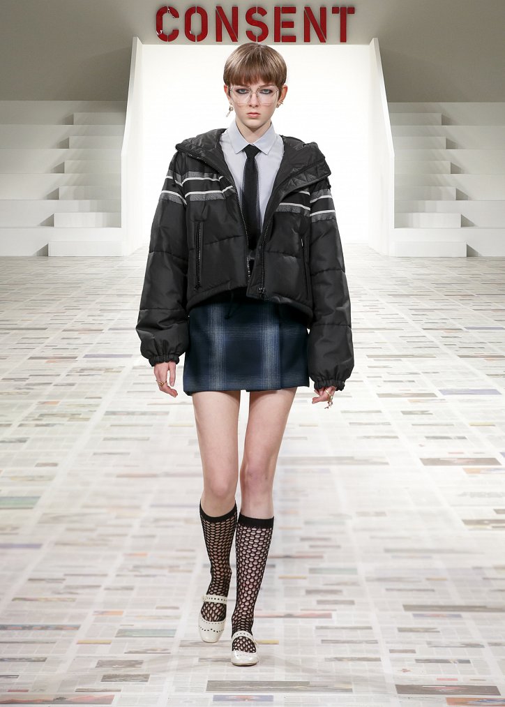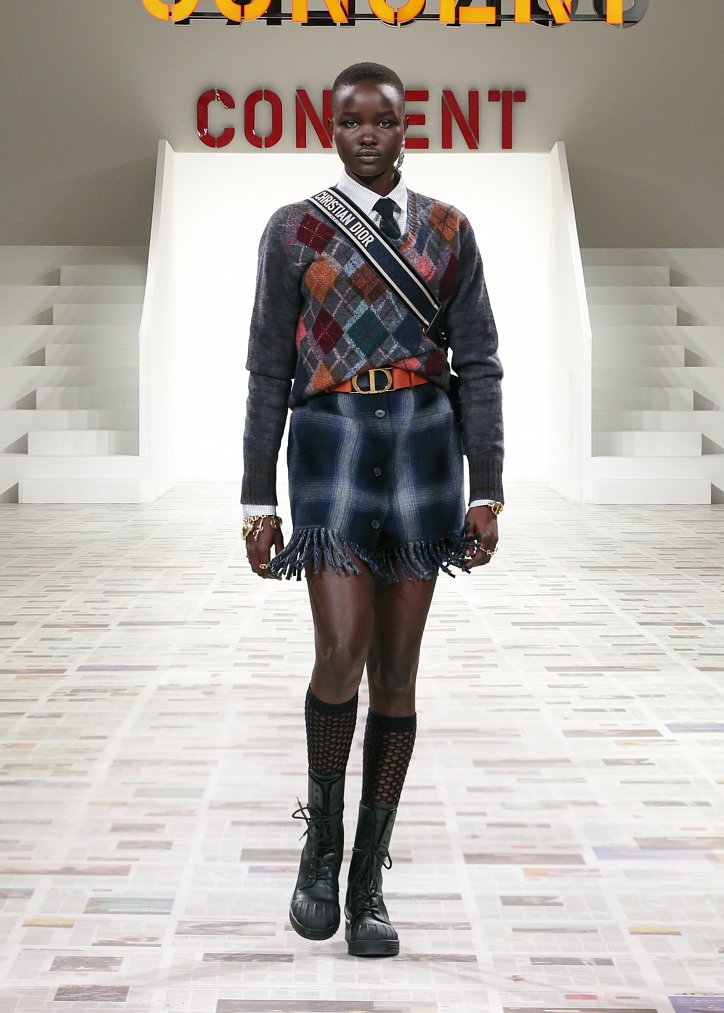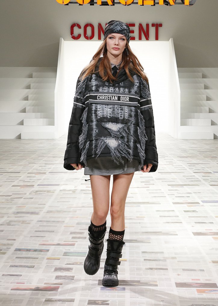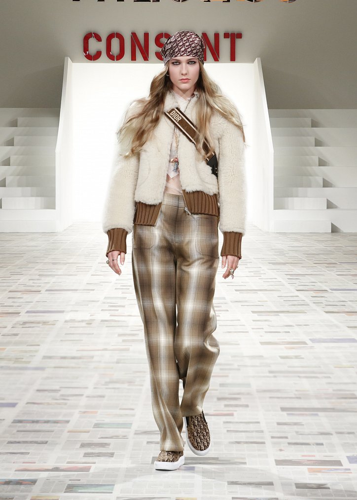 Устланный газетами подиум и сверкающие неоном феминистские лозунги над ним - таким был антураж показа коллекции Christian Dior.