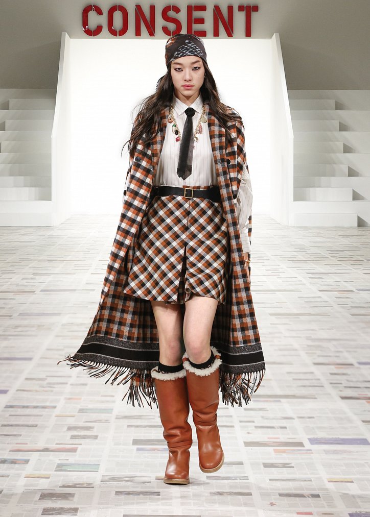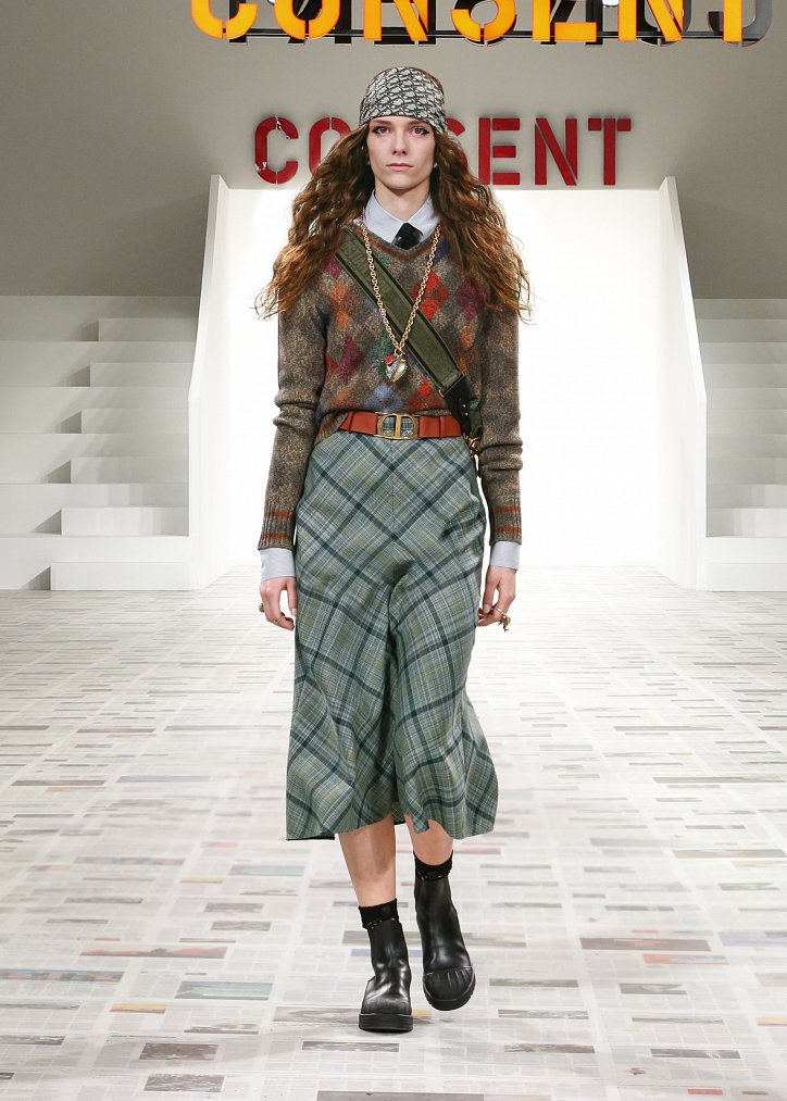 В своеобразном модном визуальном дневнике дизайнера есть юбочные и брючные костюмы со знаменитым жакетом Bar, много клетки и денима, комбинезоны из кожи и хлопка, дутые куртки и пуловеры с узором аргайл, вечерние платья из прозрачных материалов и модели с длинной бахромой. По словам дизайнера, отправной точкой для создания коллекции стал период работы в доме моды Диор дизайнера Марка Боана, который и одел женщин, выбравших новый, более свободный стиль жизни.
