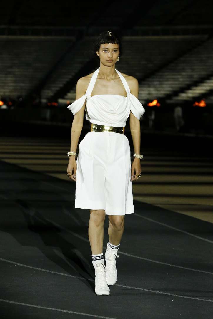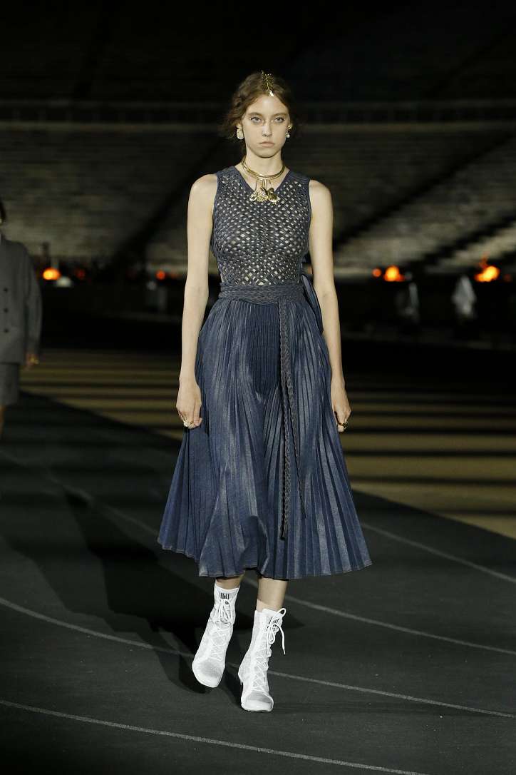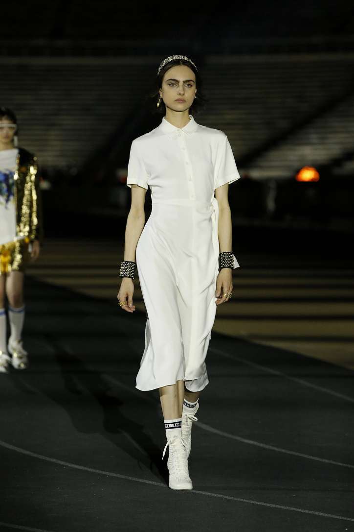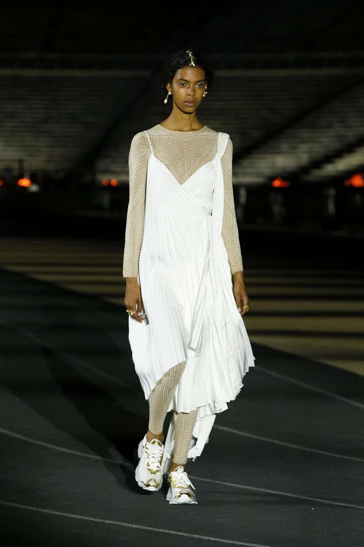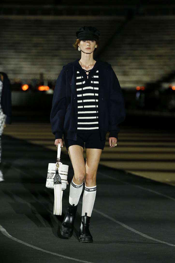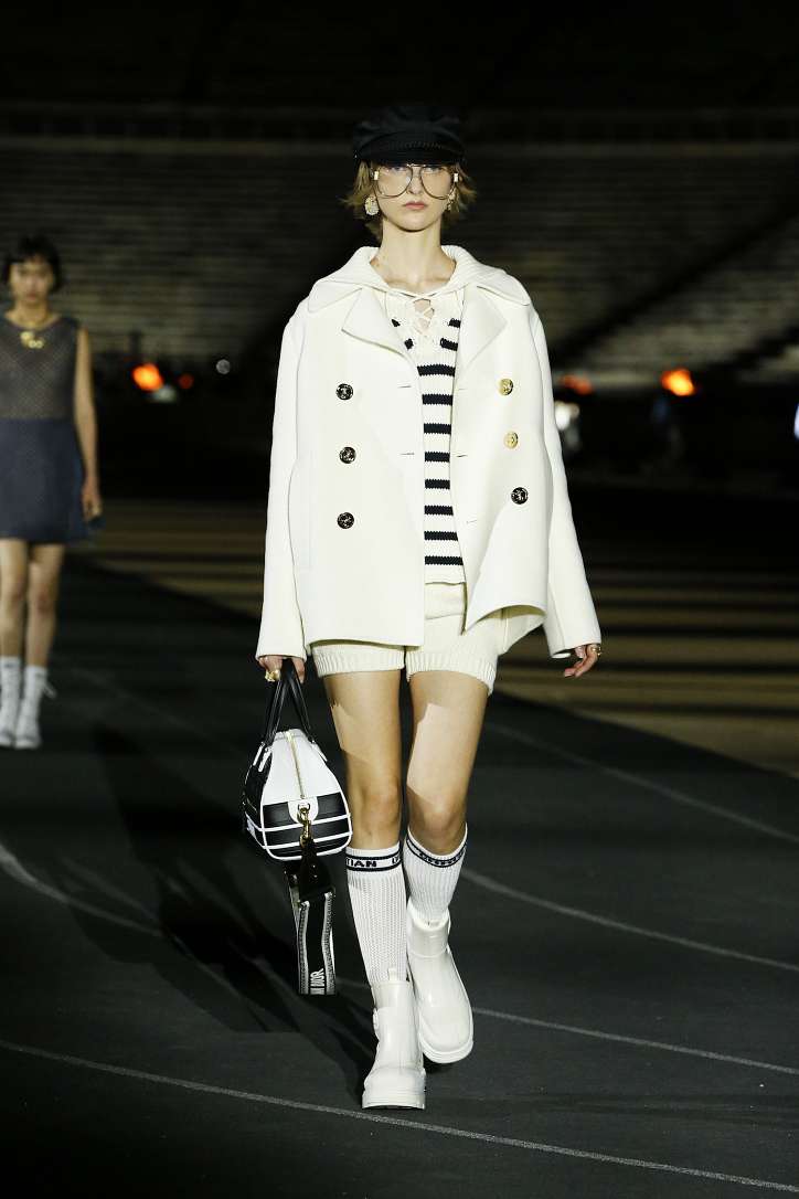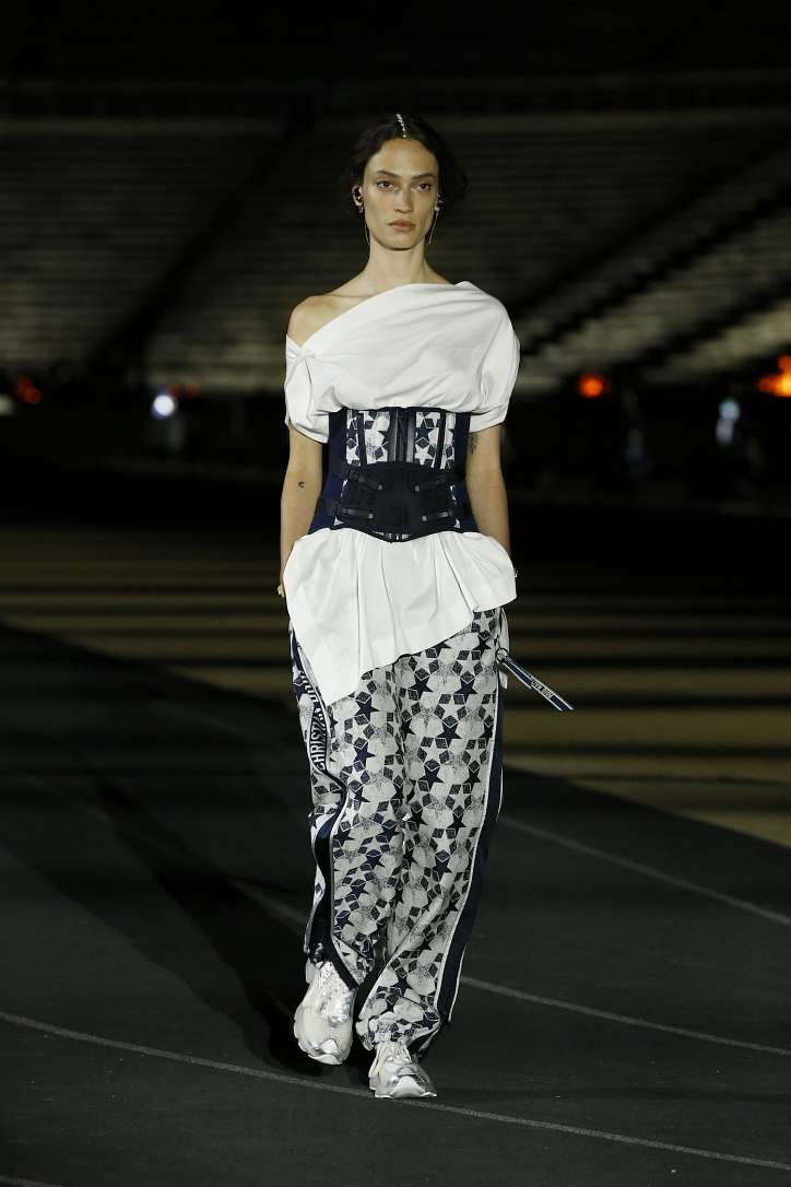 На фоне беломраморных трибун дизайнер продемонстрировала, как спорт может сочетаться и с модными трендами, и с кодами французского дома моды. Светлые кремовые тона изредка прерывались яркими абстрактными принтами, классический Bar Jacket приобрёл атлетический вид, белый костюм Марлен Дитрих соседствовал с анораками, а платья а ля пеплос – с кроссовками.