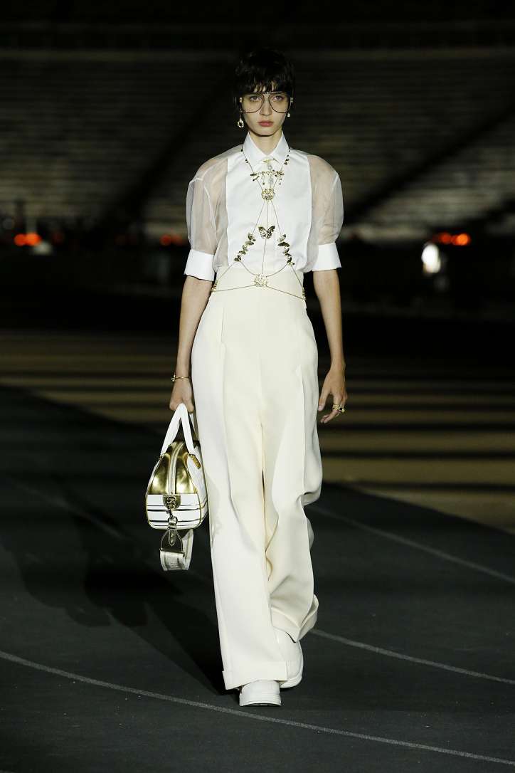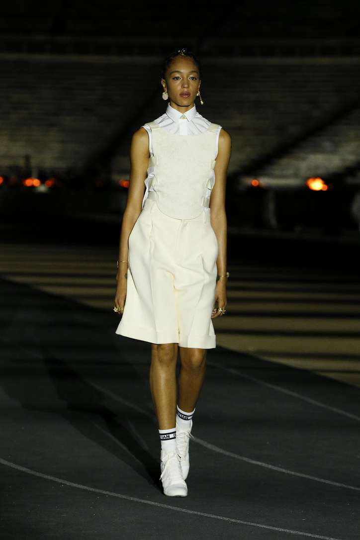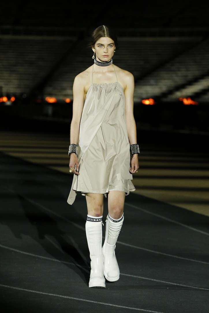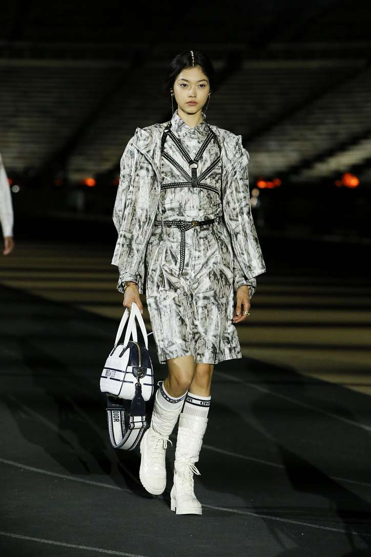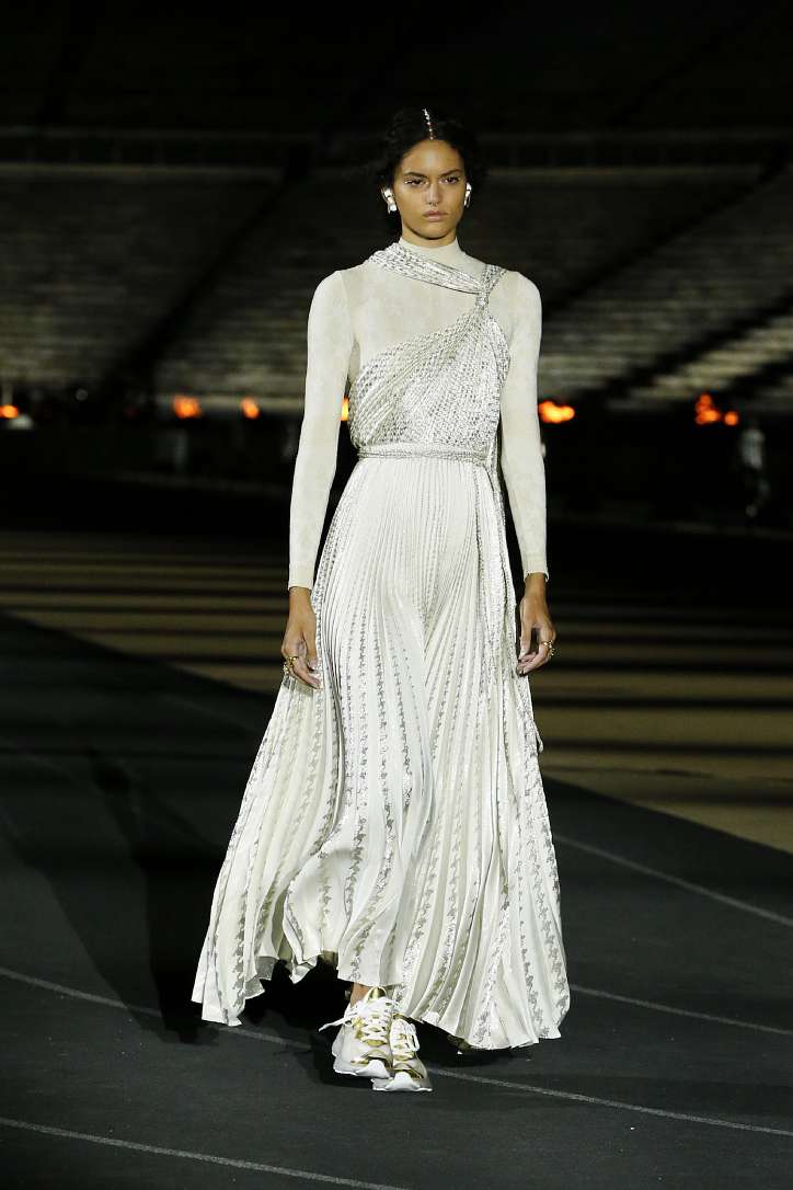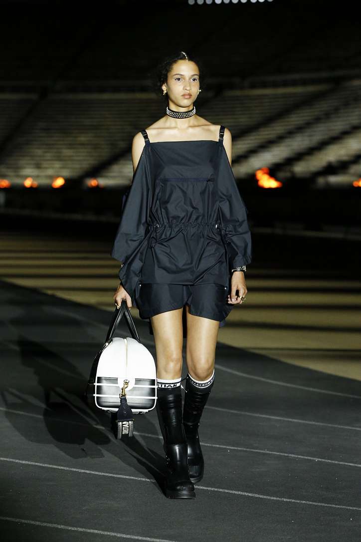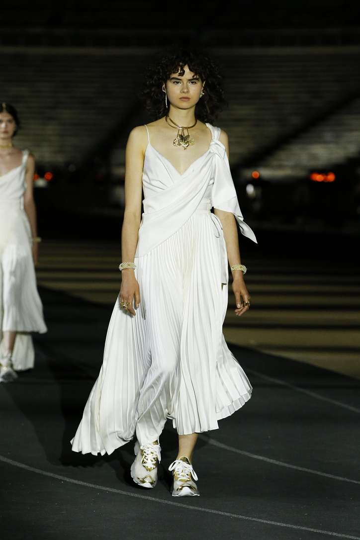 На фоне беломраморных трибун дизайнер продемонстрировала, как спорт может сочетаться и с модными трендами, и с кодами французского дома моды. Светлые кремовые тона изредка прерывались яркими абстрактными принтами, классический Bar Jacket приобрёл атлетический вид, белый костюм Марлен Дитрих соседствовал с анораками, а платья а ля пеплос – с кроссовками.