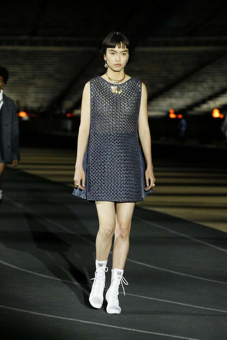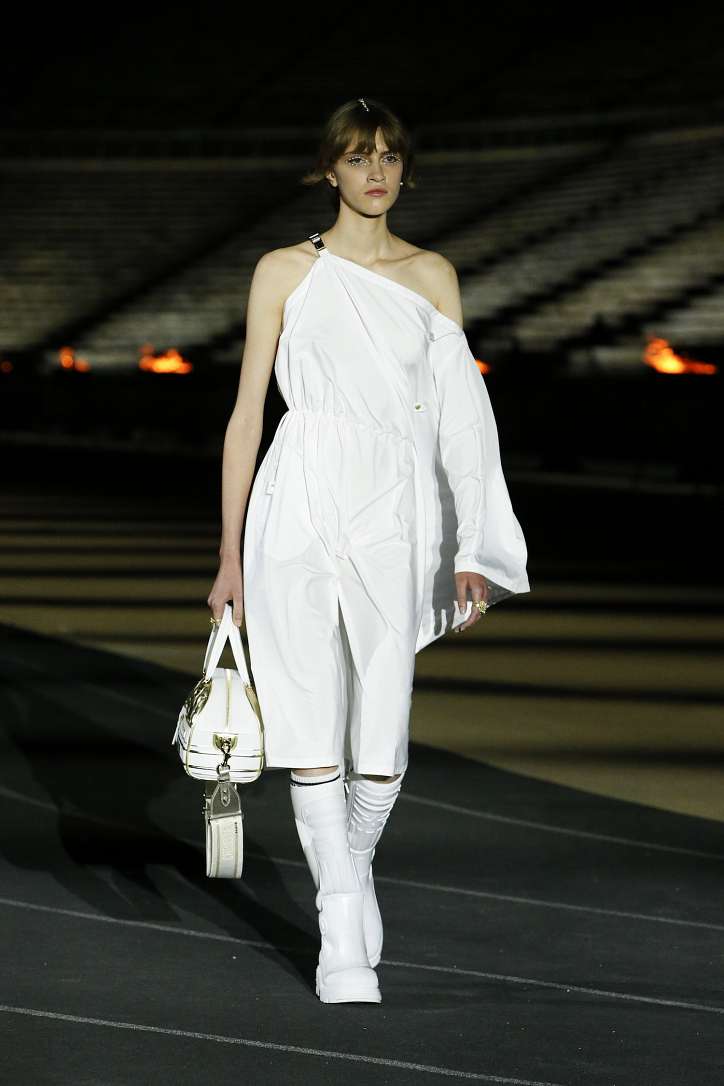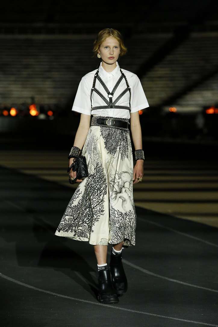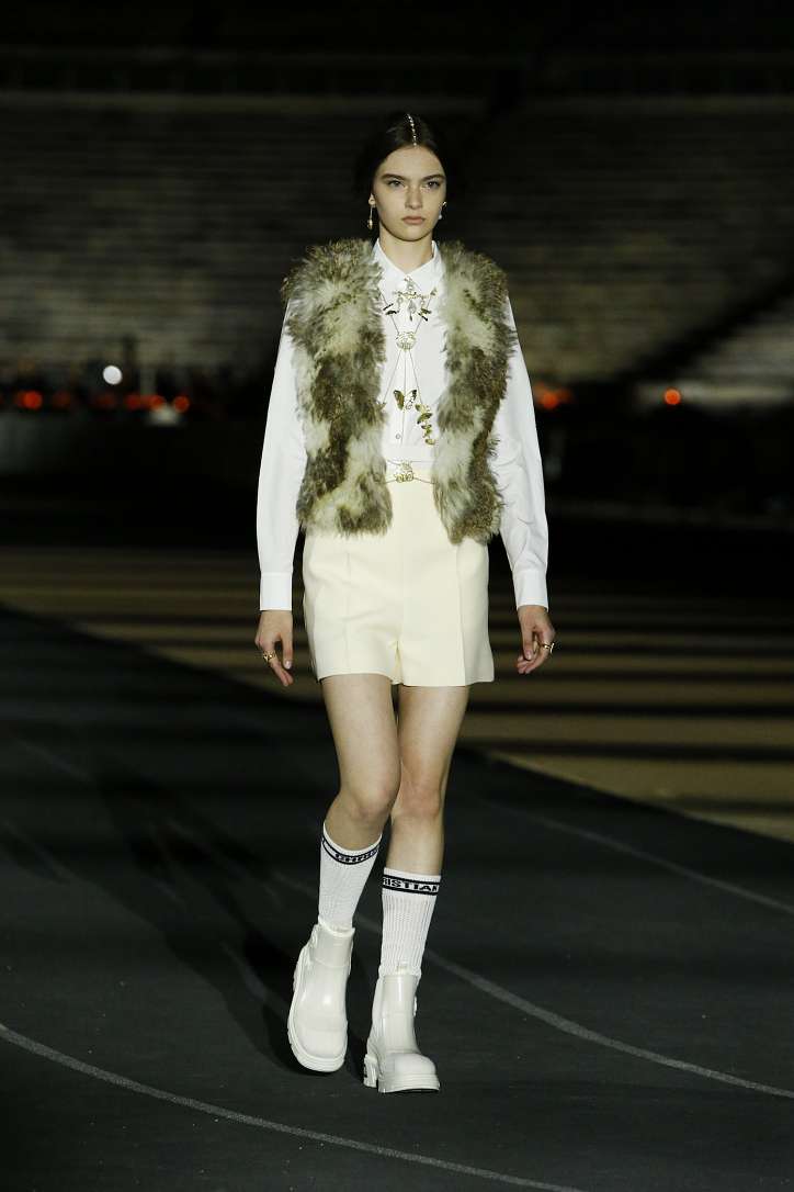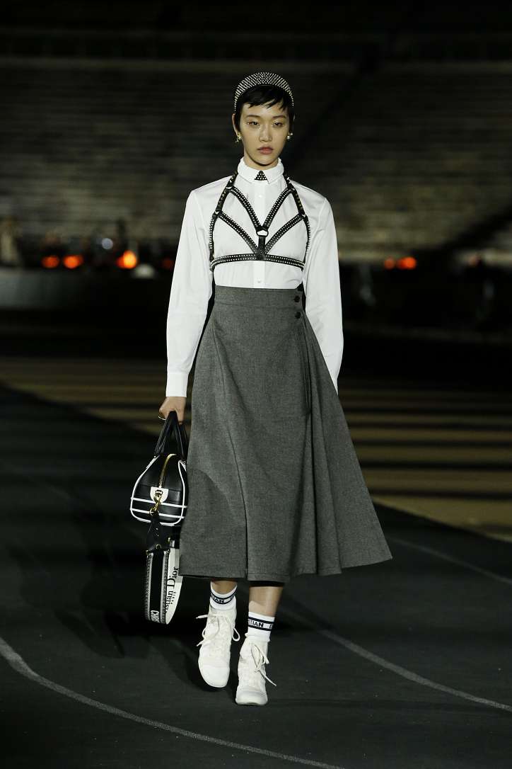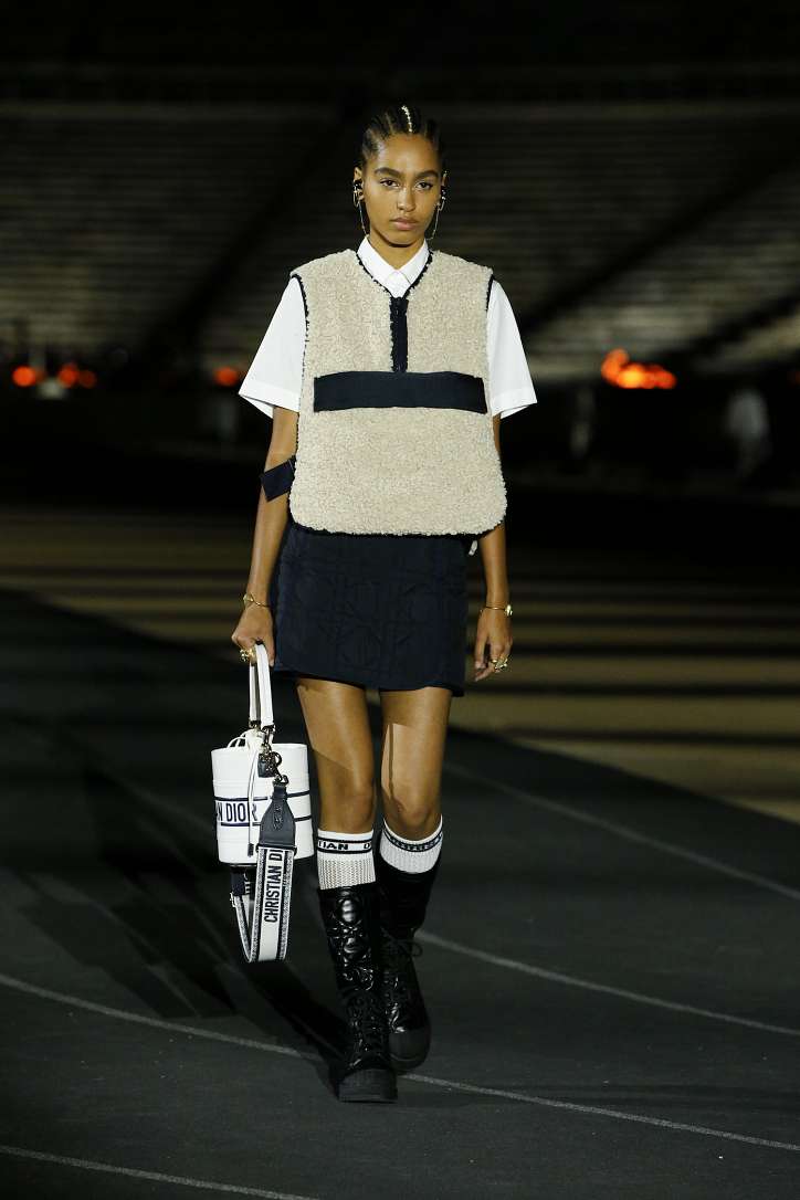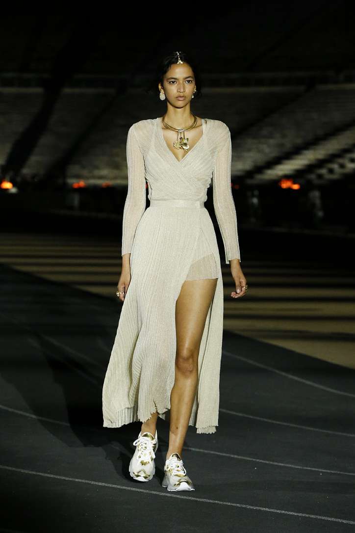 На фоне беломраморных трибун дизайнер продемонстрировала, как спорт может сочетаться и с модными трендами, и с кодами французского дома моды. Светлые кремовые тона изредка прерывались яркими абстрактными принтами, классический Bar Jacket приобрёл атлетический вид, белый костюм Марлен Дитрих соседствовал с анораками, а платья а ля пеплос – с кроссовками.