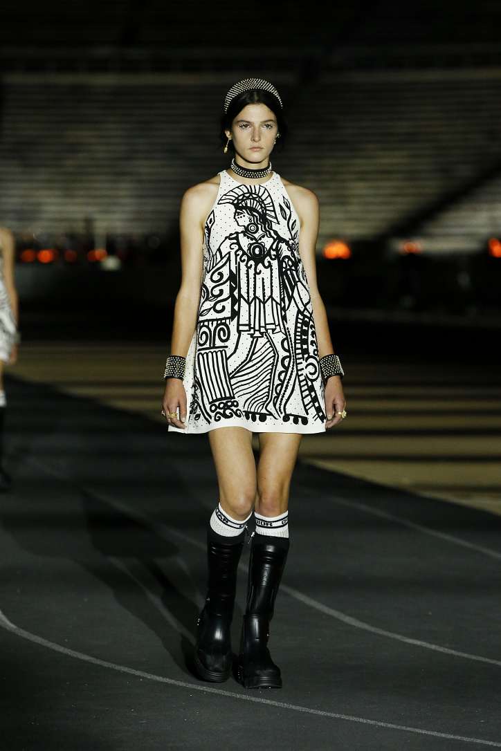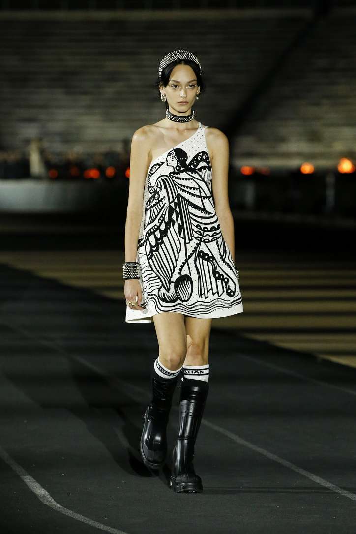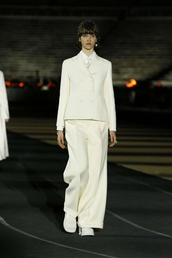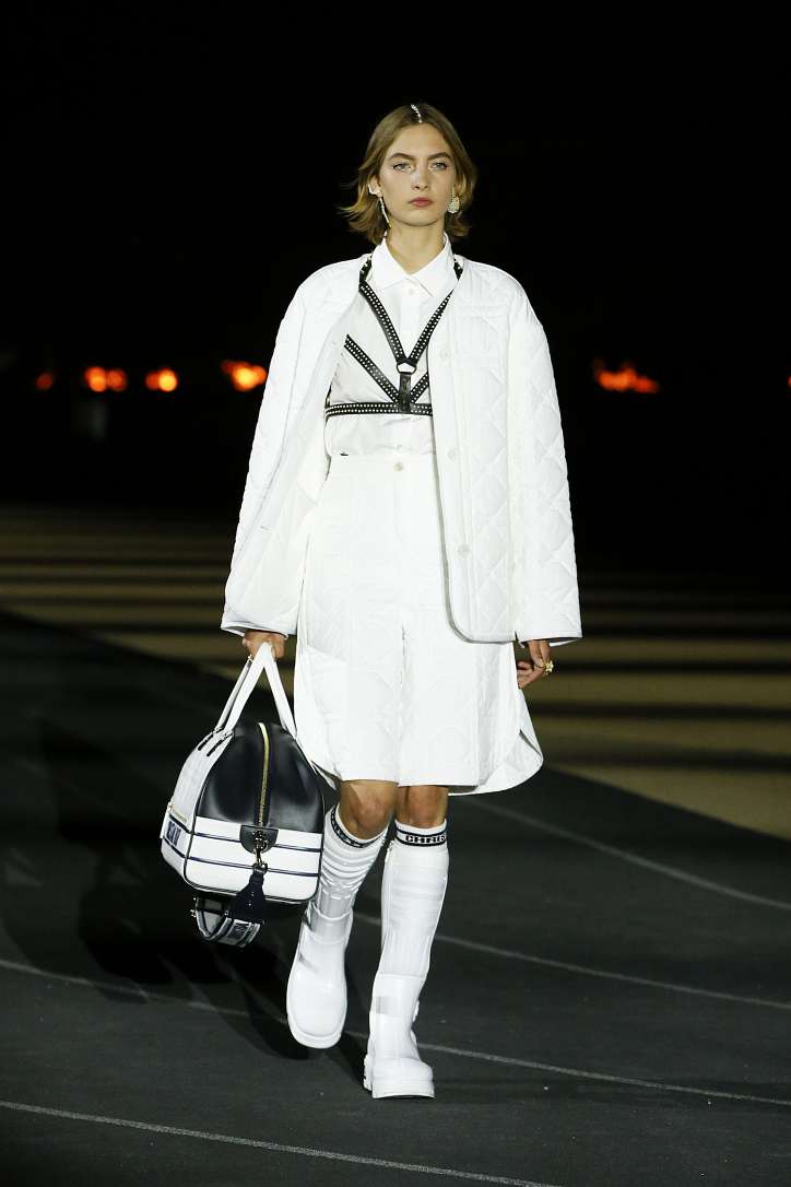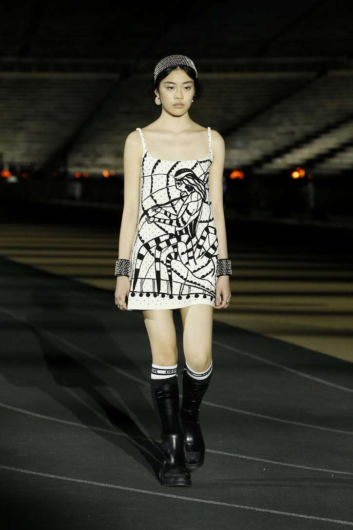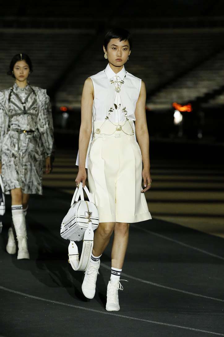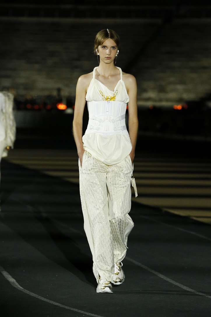На фоне беломраморных трибун дизайнер продемонстрировала, как спорт может сочетаться и с модными трендами, и с кодами французского дома моды. Светлые кремовые тона изредка прерывались яркими абстрактными принтами, классический Bar Jacket приобрёл атлетический вид, белый костюм Марлен Дитрих соседствовал с анораками, а платья а ля пеплос – с кроссовками.