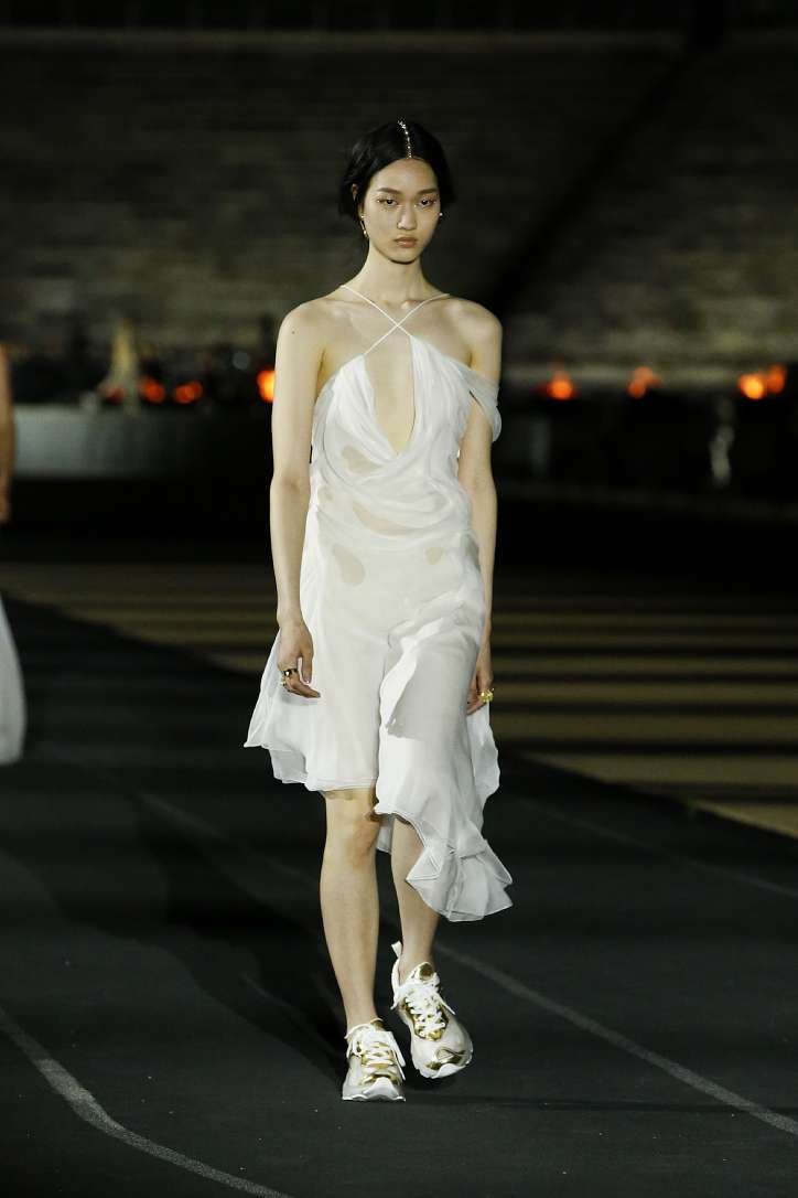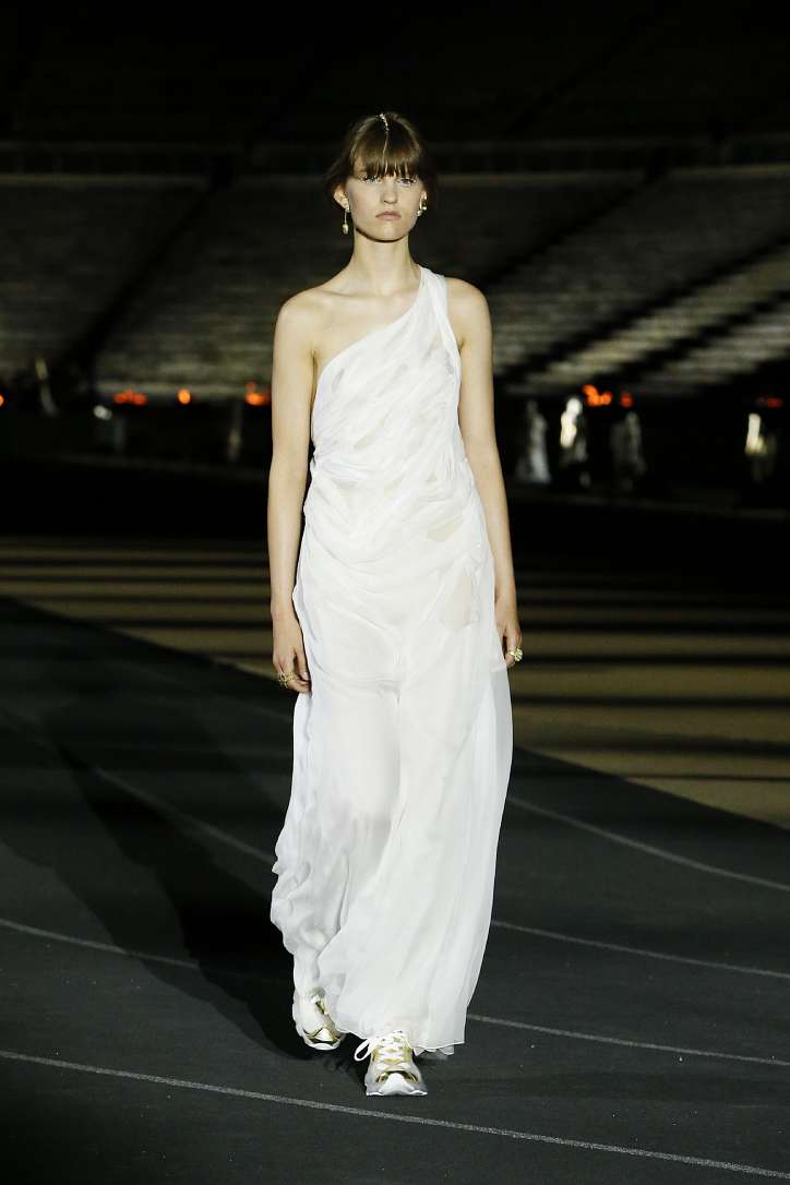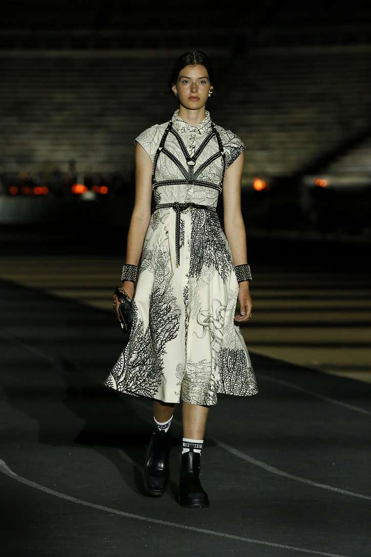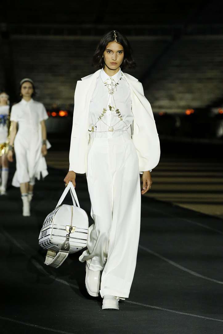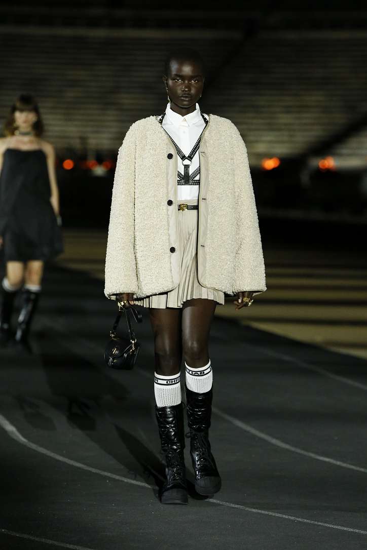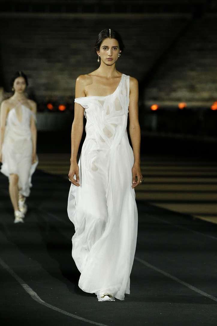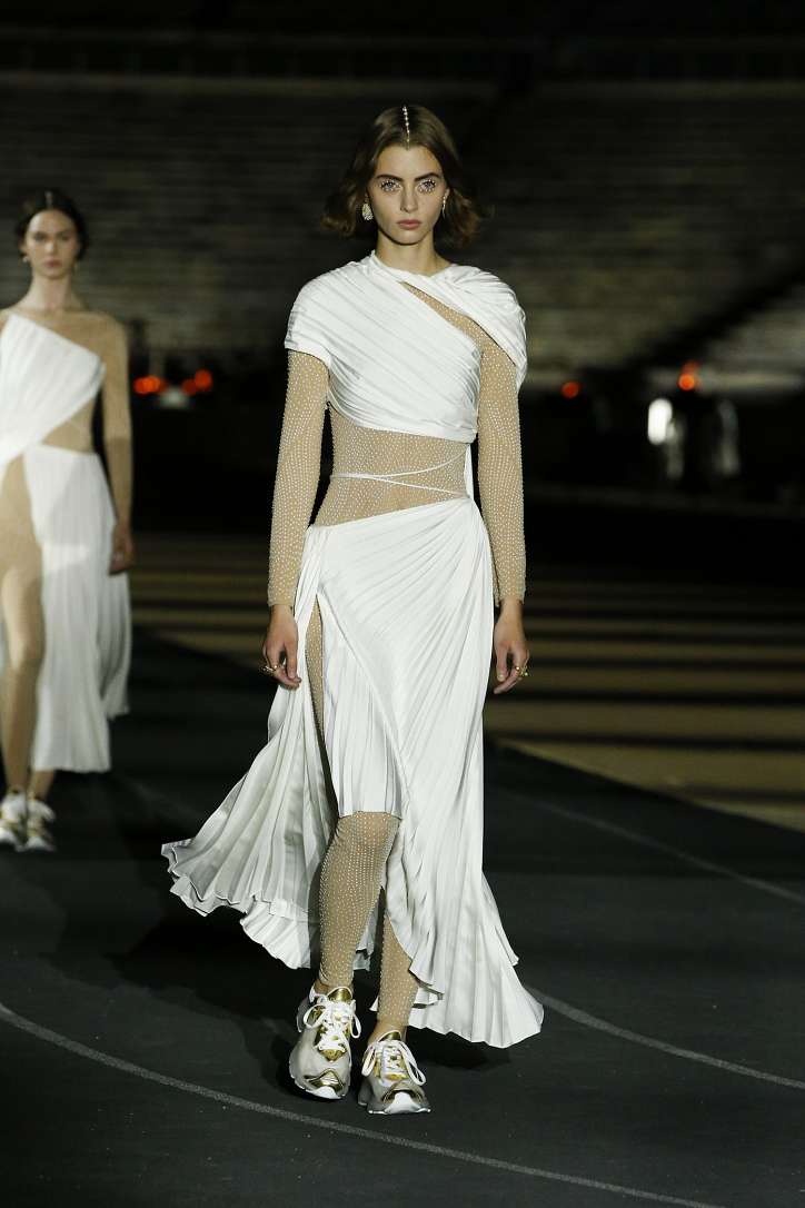 На фоне беломраморных трибун дизайнер продемонстрировала, как спорт может сочетаться и с модными трендами, и с кодами французского дома моды. Светлые кремовые тона изредка прерывались яркими абстрактными принтами, классический Bar Jacket приобрёл атлетический вид, белый костюм Марлен Дитрих соседствовал с анораками, а платья а ля пеплос – с кроссовками.