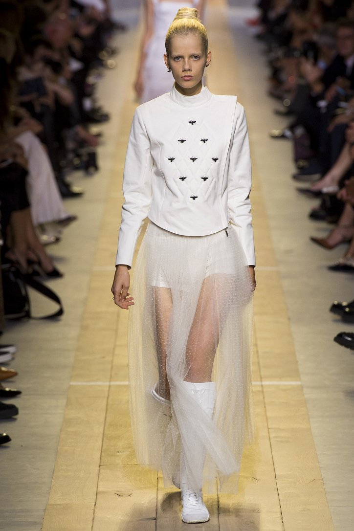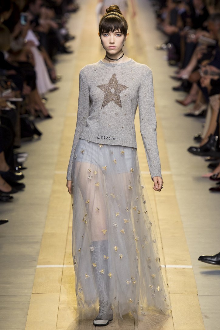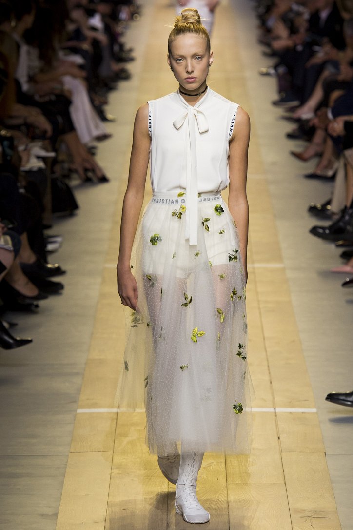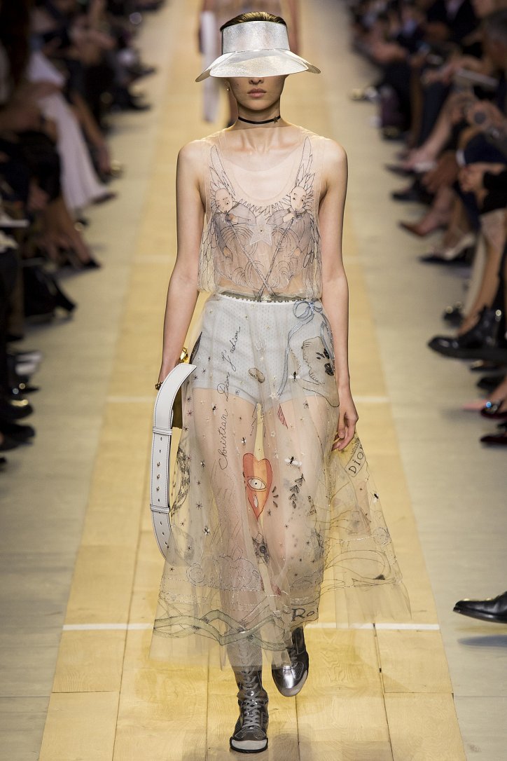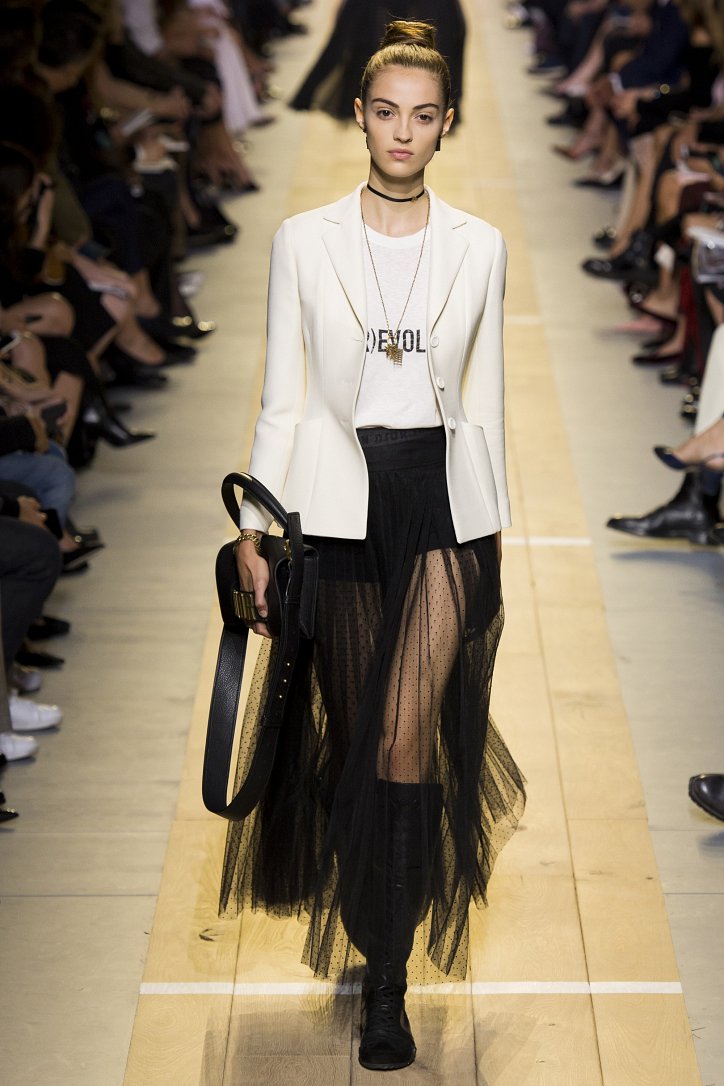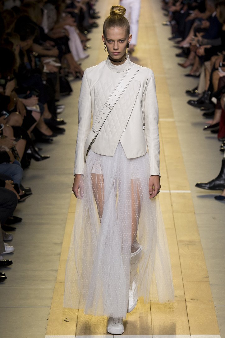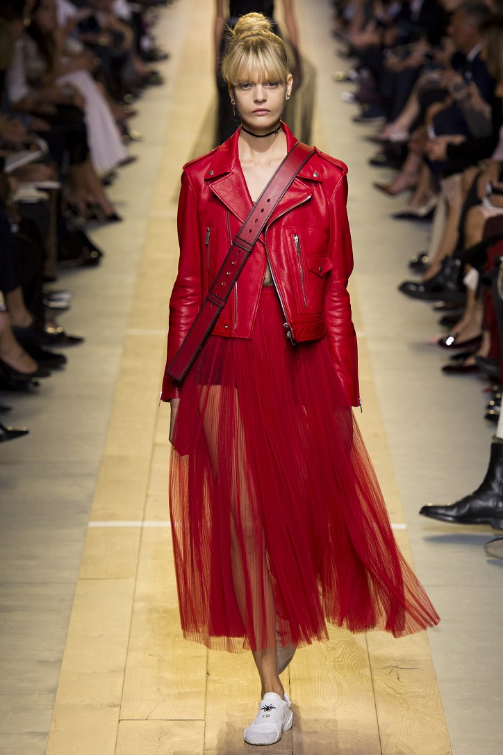 Легендарный «диоровский» силуэт New Look и жакет bar, превратившийся в белую фехтовальную курточку, красные «косухи», пуловеры, строгие жакеты и белые футболки в сочетании с шифоновыми юбками-миди, стилизованные «детские» принты на откровенно-прозрачных платьях, классический тренч и роскошное кружево – в новой коллекции женственность и хрупкость переплелись с практичностью и спортивным стилем.