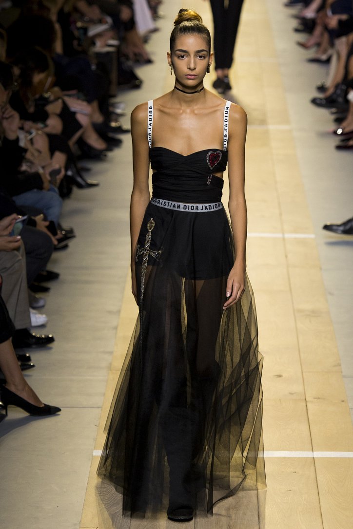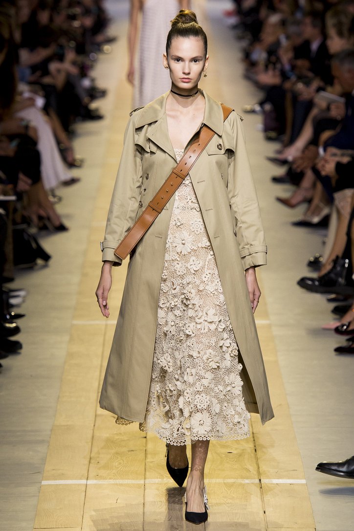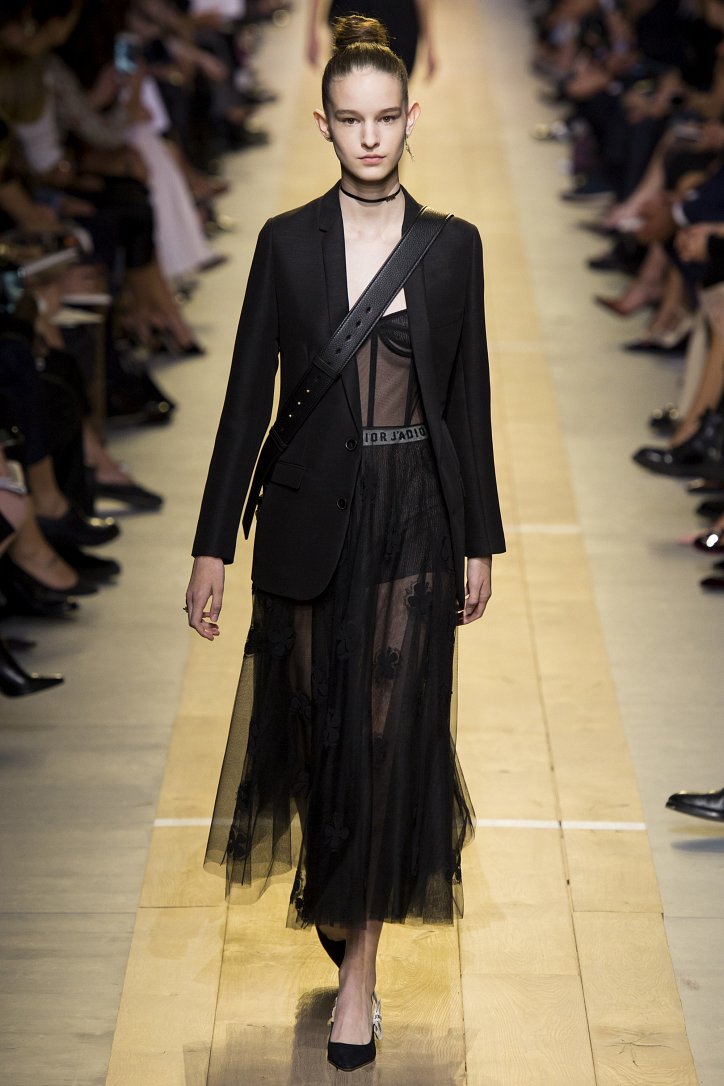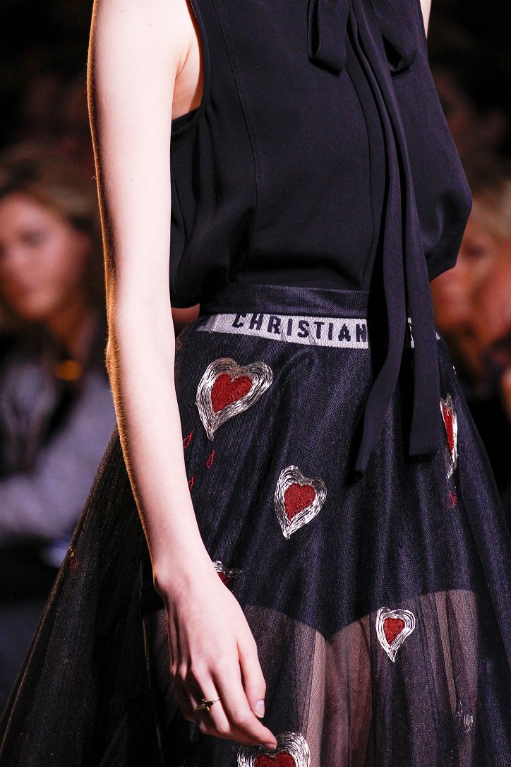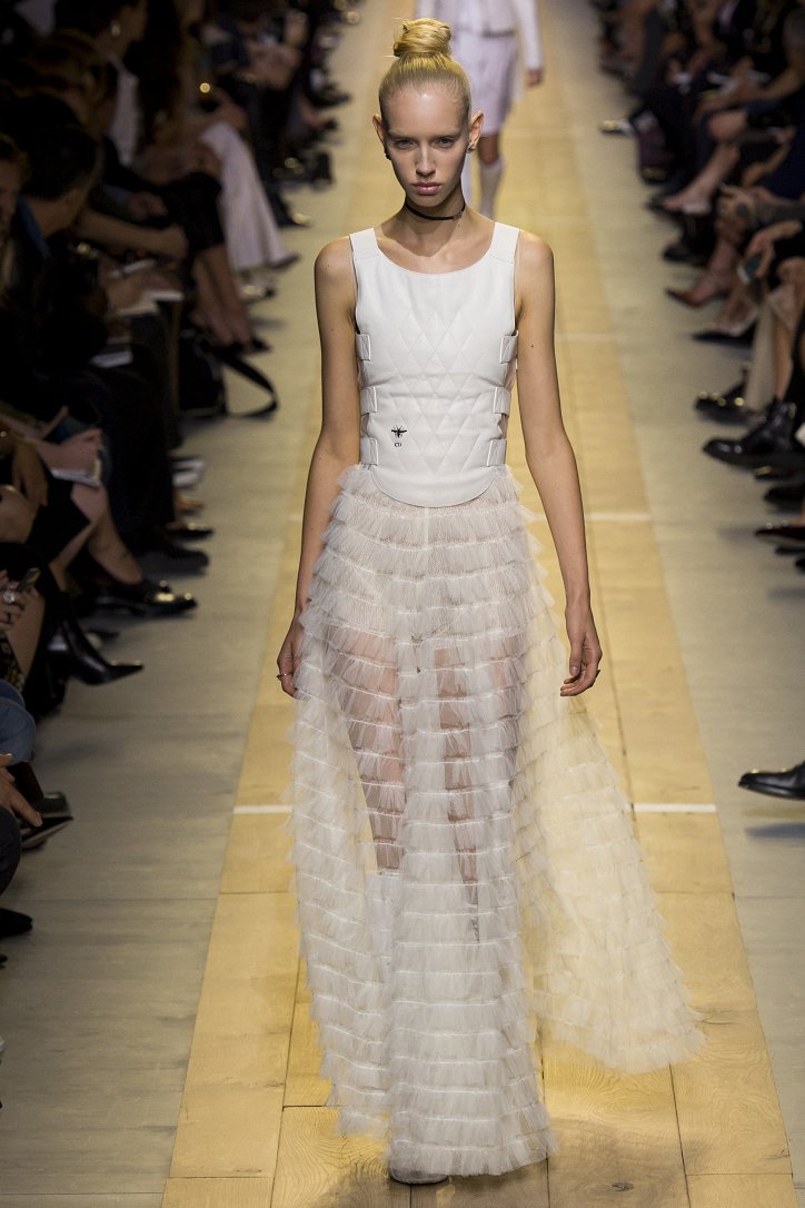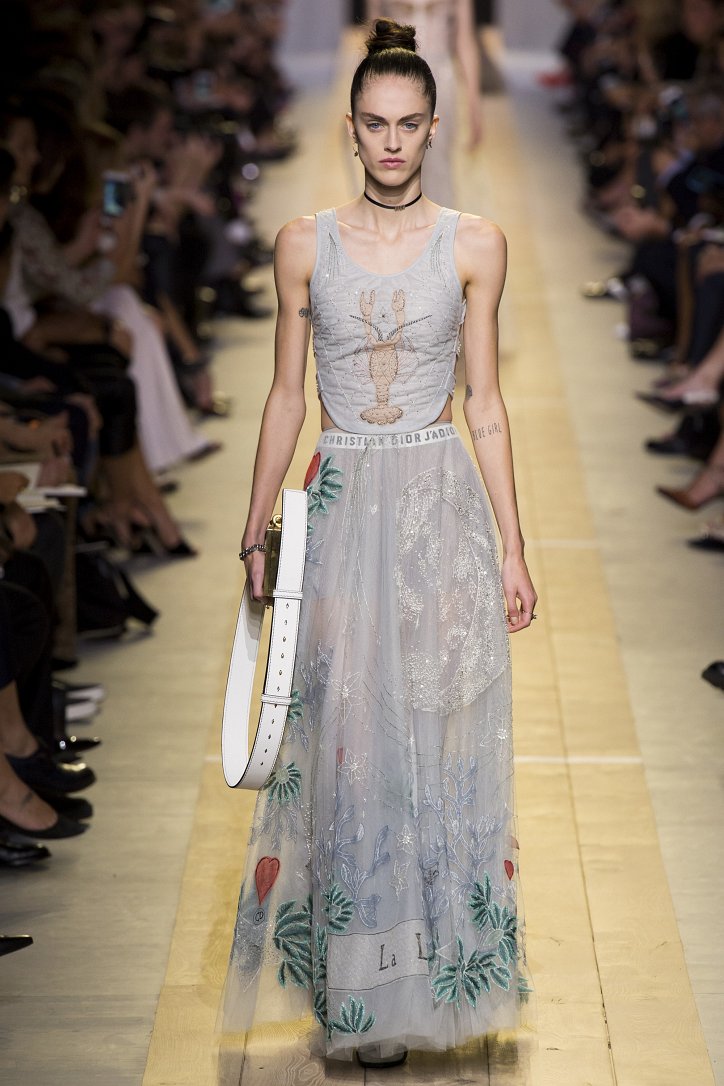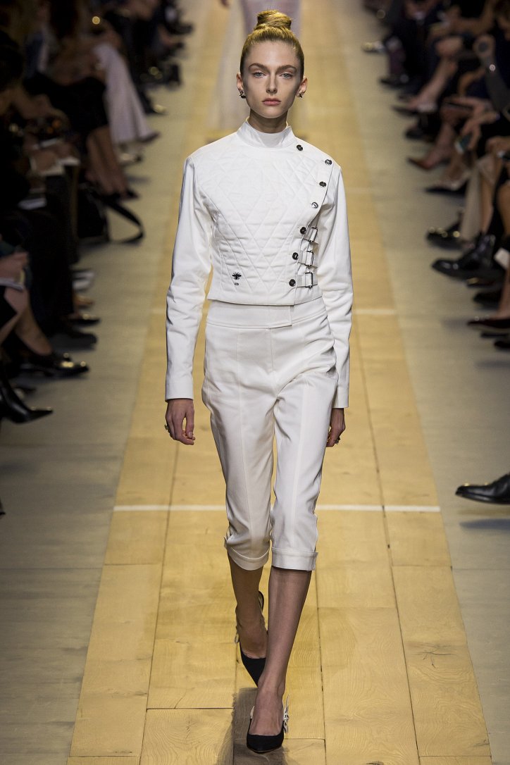 Легендарный «диоровский» силуэт New Look и жакет bar, превратившийся в белую фехтовальную курточку, красные «косухи», пуловеры, строгие жакеты и белые футболки в сочетании с шифоновыми юбками-миди, стилизованные «детские» принты на откровенно-прозрачных платьях, классический тренч и роскошное кружево – в новой коллекции женственность и хрупкость переплелись с практичностью и спортивным стилем.
