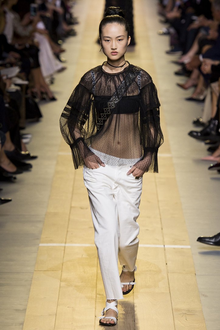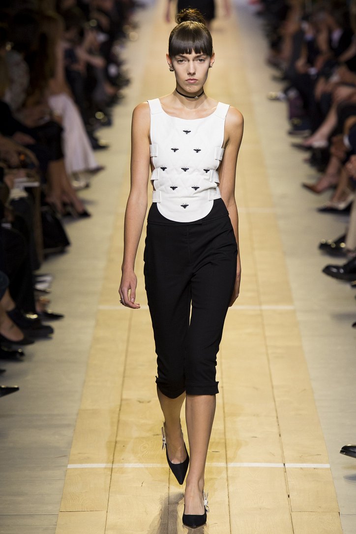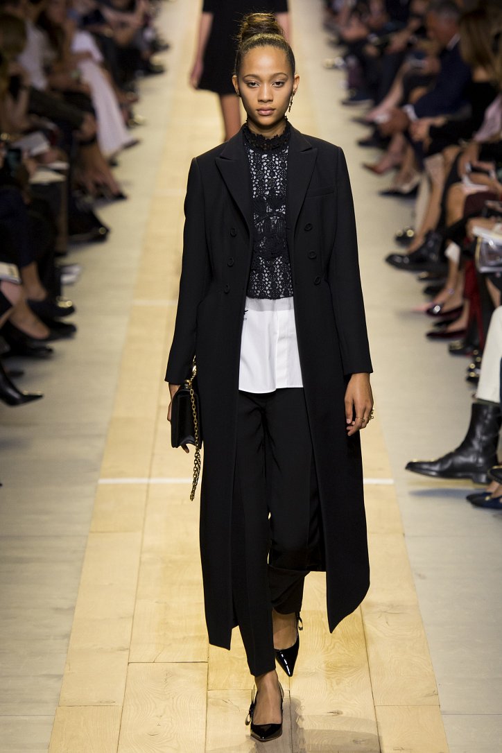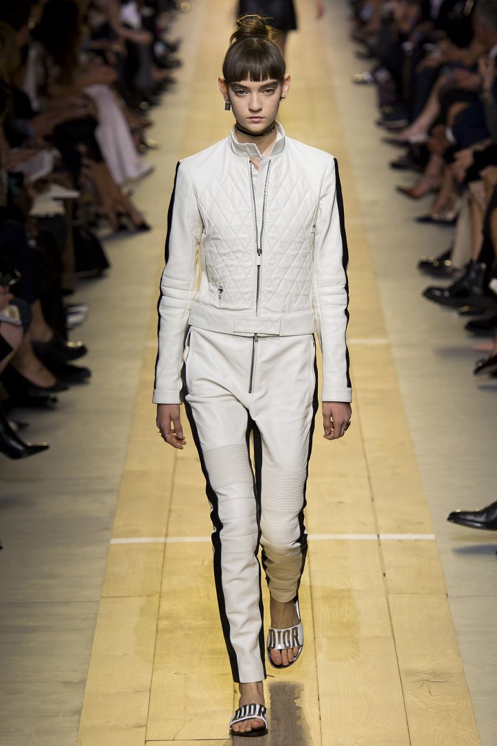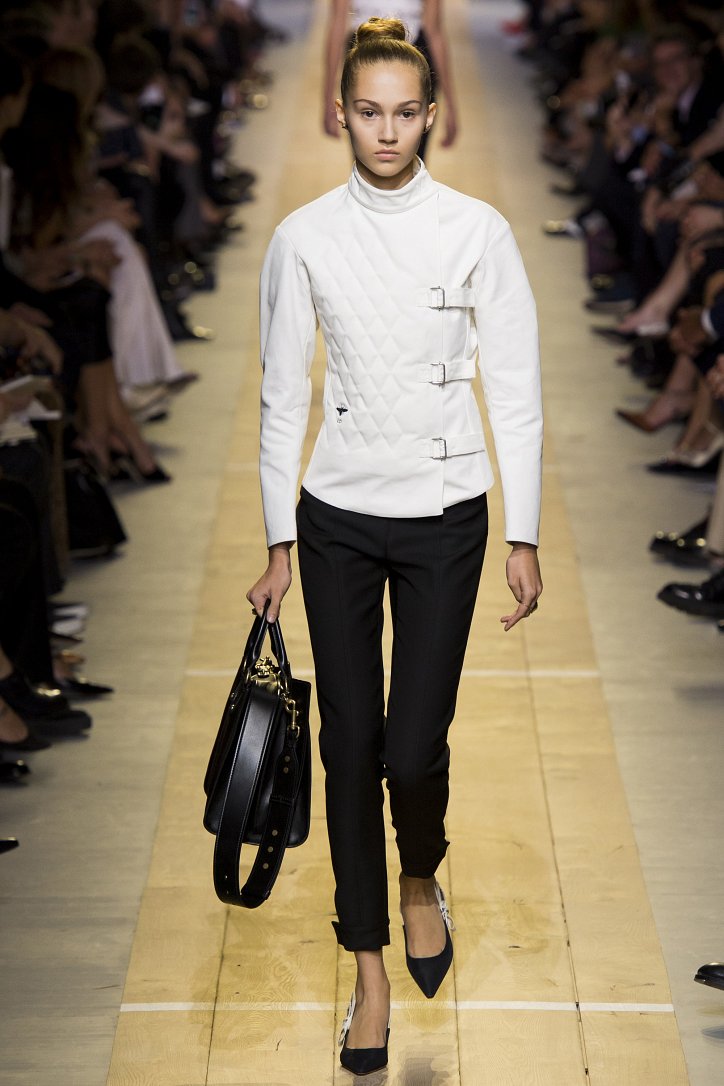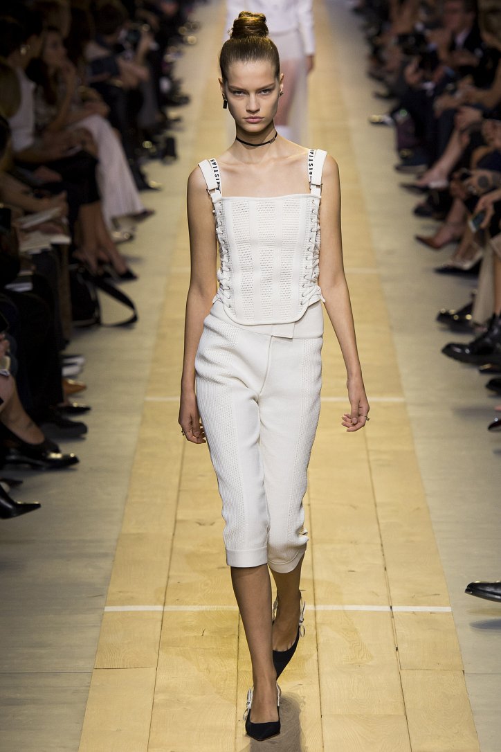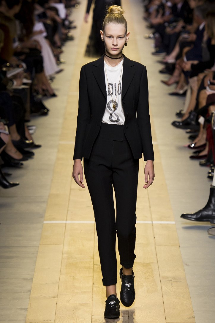 Легендарный «диоровский» силуэт New Look и жакет bar, превратившийся в белую фехтовальную курточку, красные «косухи», пуловеры, строгие жакеты и белые футболки в сочетании с шифоновыми юбками-миди, стилизованные «детские» принты на откровенно-прозрачных платьях, классический тренч и роскошное кружево – в новой коллекции женственность и хрупкость переплелись с практичностью и спортивным стилем.