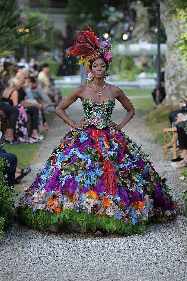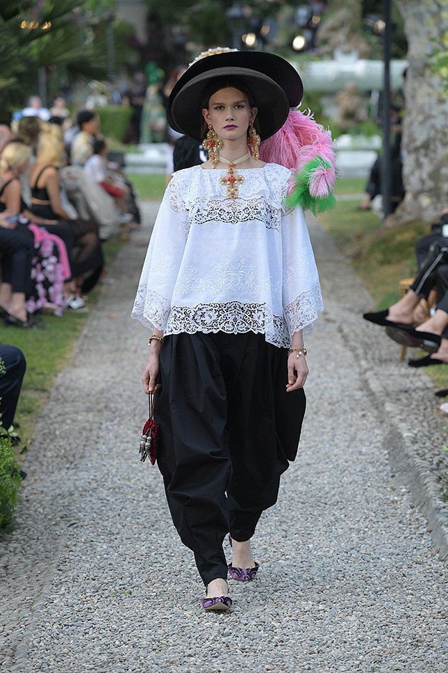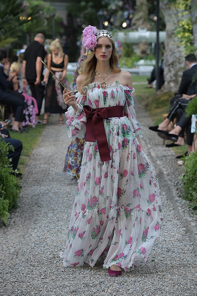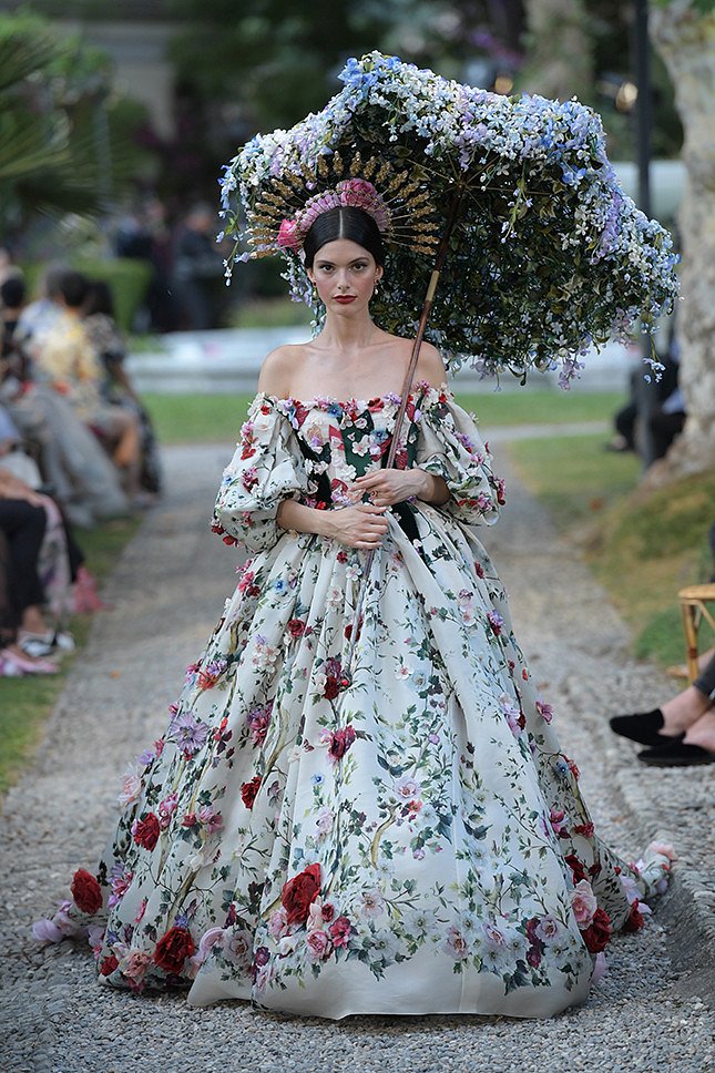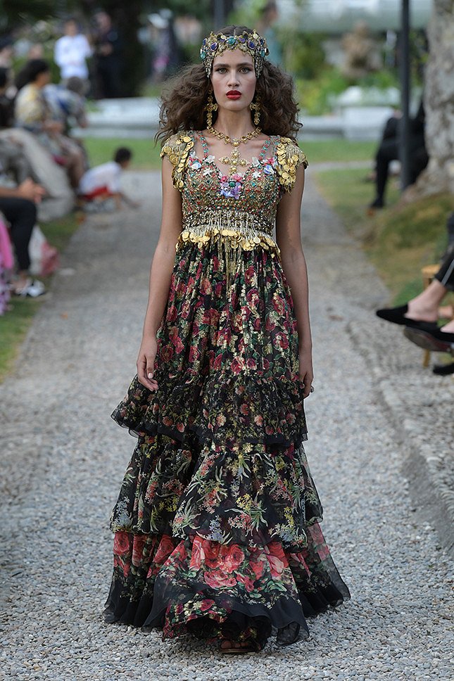 Италия. Небольшой городок Тремеццо. Парк Teresio Olivelli на озере Комо. Именно в этом удивительном месте состоялся показ кутюрной коллекции Dolce & Gabbana Alta Moda. Потрясающе красивые панорамы стали достойными «декорациями» для не менее потрясающей коллекции. Итальянский дуэт по традиции «не скромничал»: платья были похожи на произведения искусства. Принты в стиле Ренессанса и цветы, блестки и перья, золото и черные кружева – и не нужно искать в этом какую-то одну идею - по словам Доменико Дольче, в одном аутфите может быть 7 разных референсов.