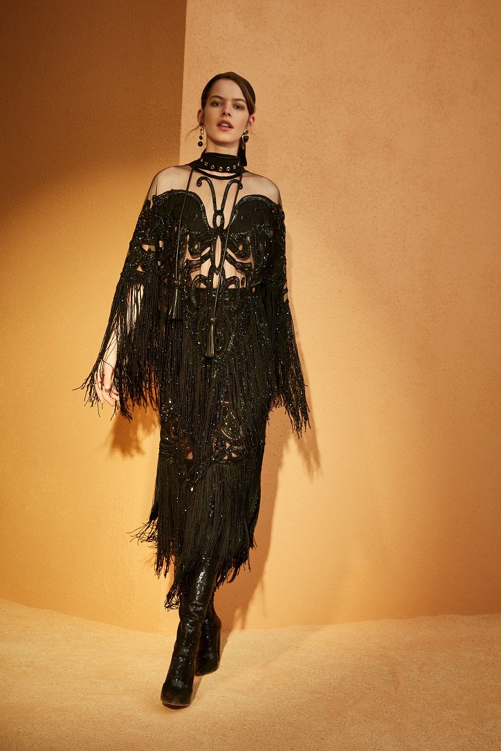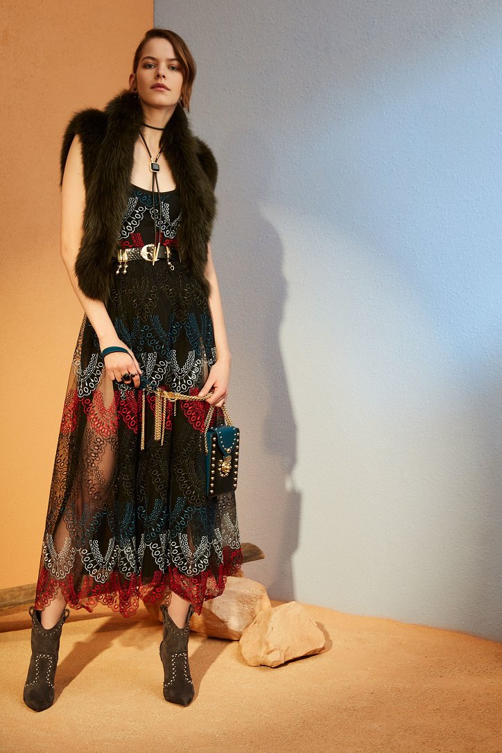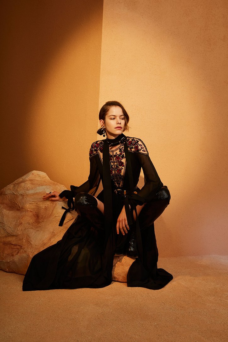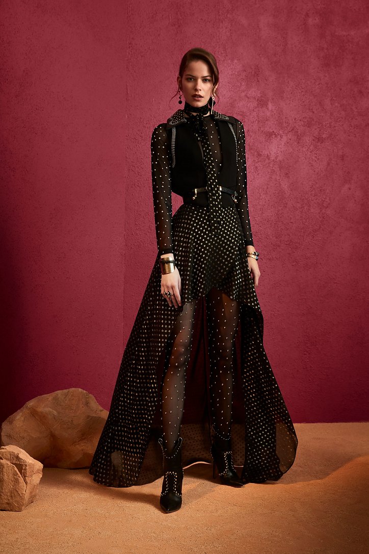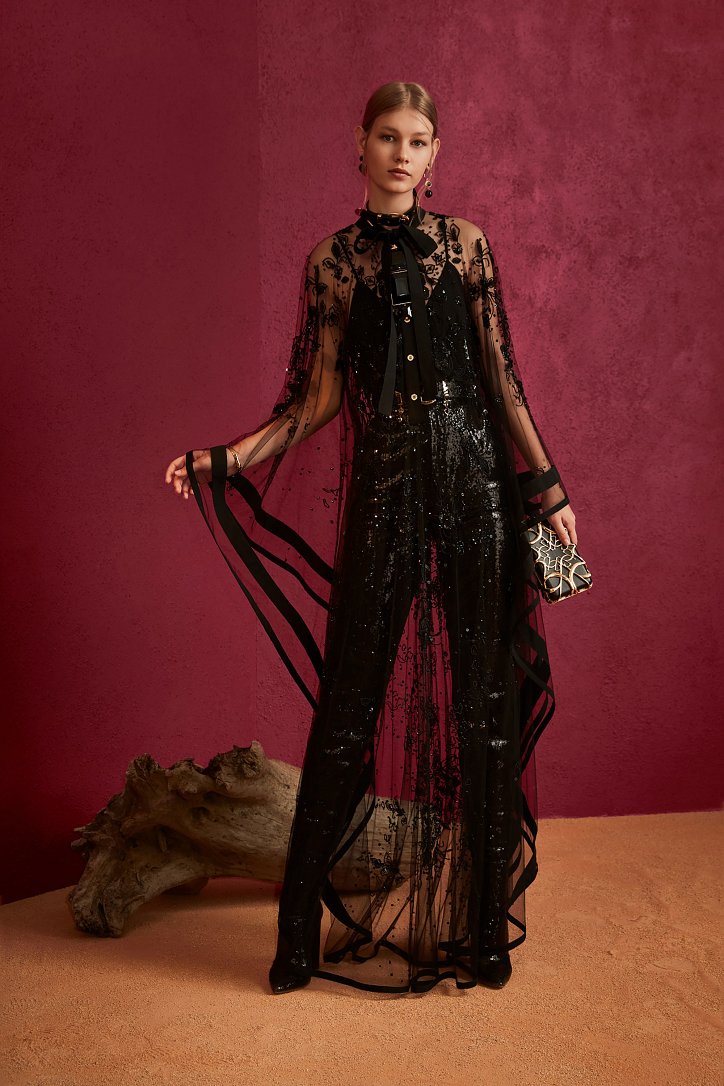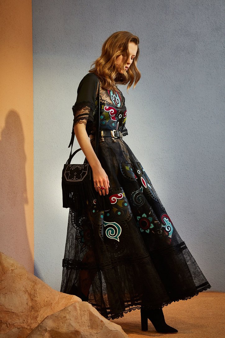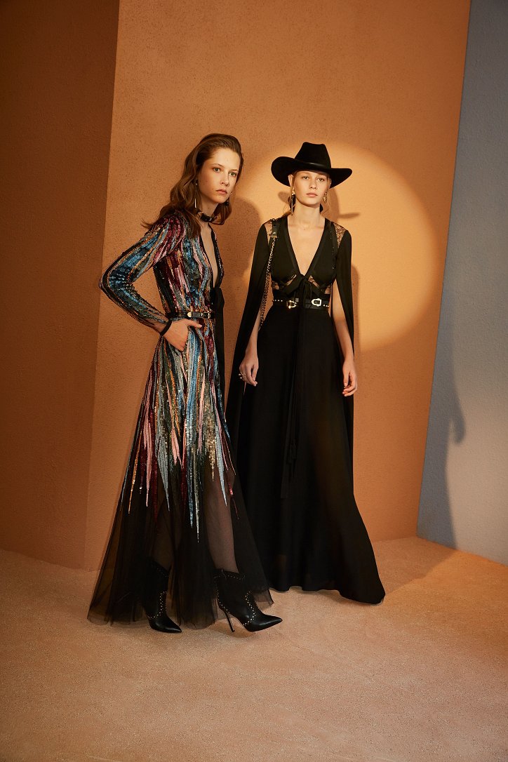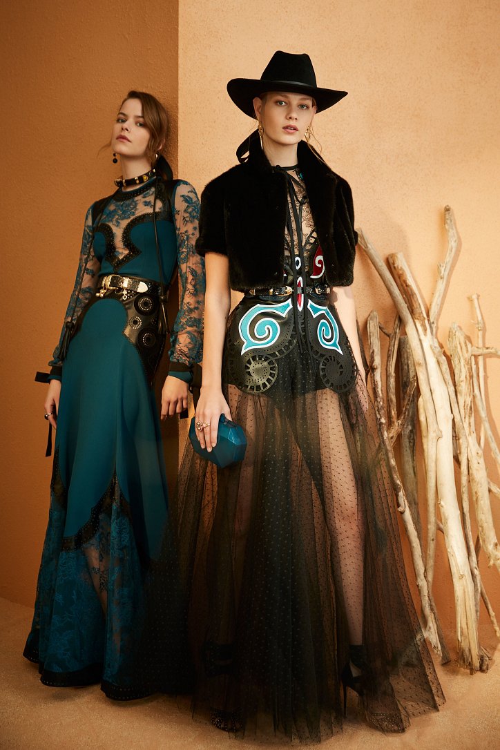 В межсезонной коллекции Elie Saab кружево и шифон великолепно сочетаются с черной кожей, черно-красно-белые мексиканские орнаменты прекрасно себя чувствуют в компании с бисерной вышивкой, ковбойские шляпы и черные кожаные аксессуары придают ноток дерзости нежно-голубым вечерним платьям с искусной вышивкой, а высокие каблуки так и вовсе «сопровождают» абсолютно все образы.