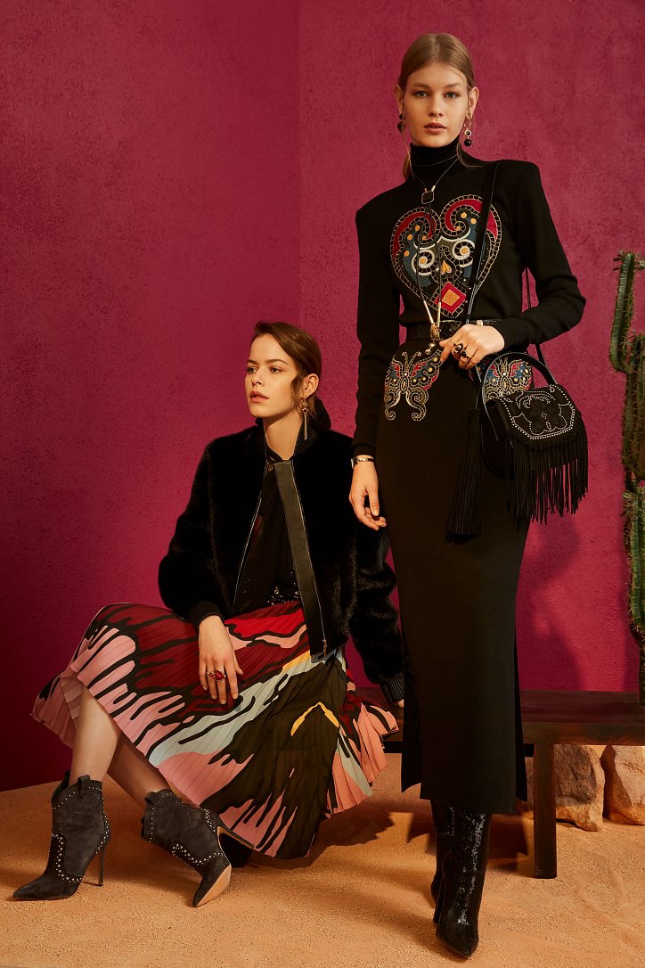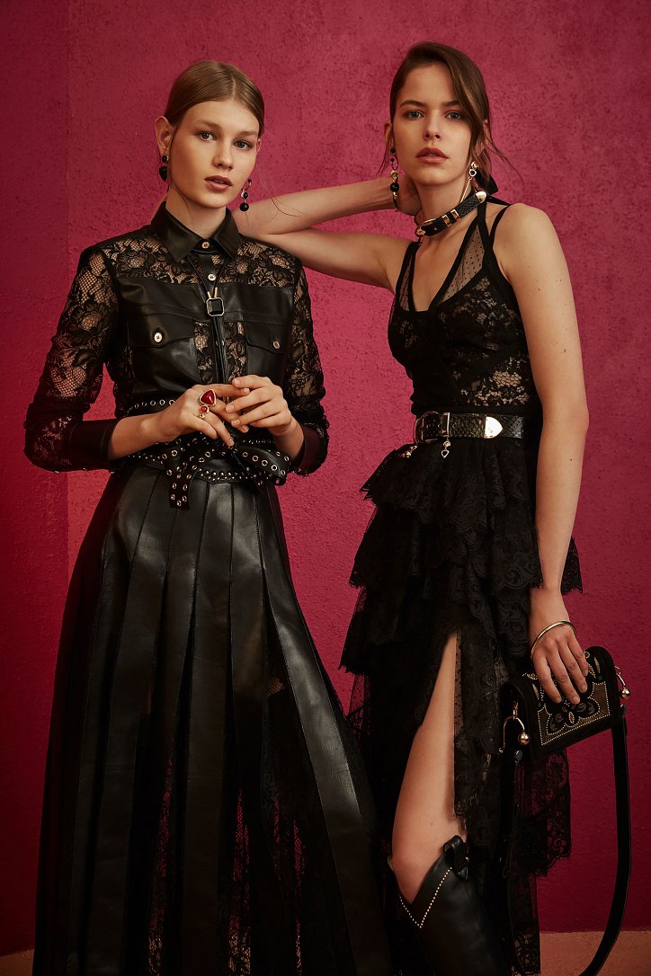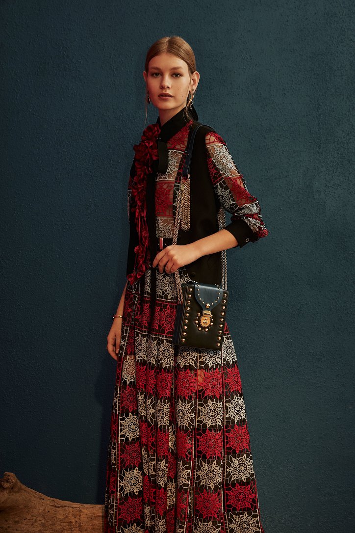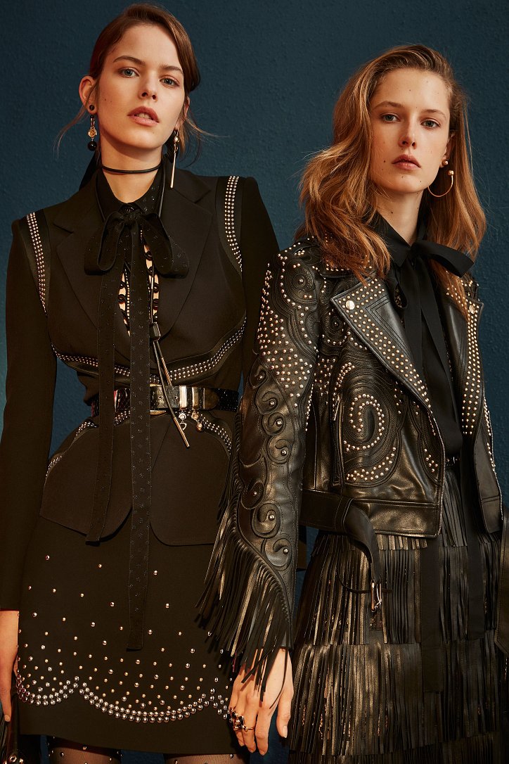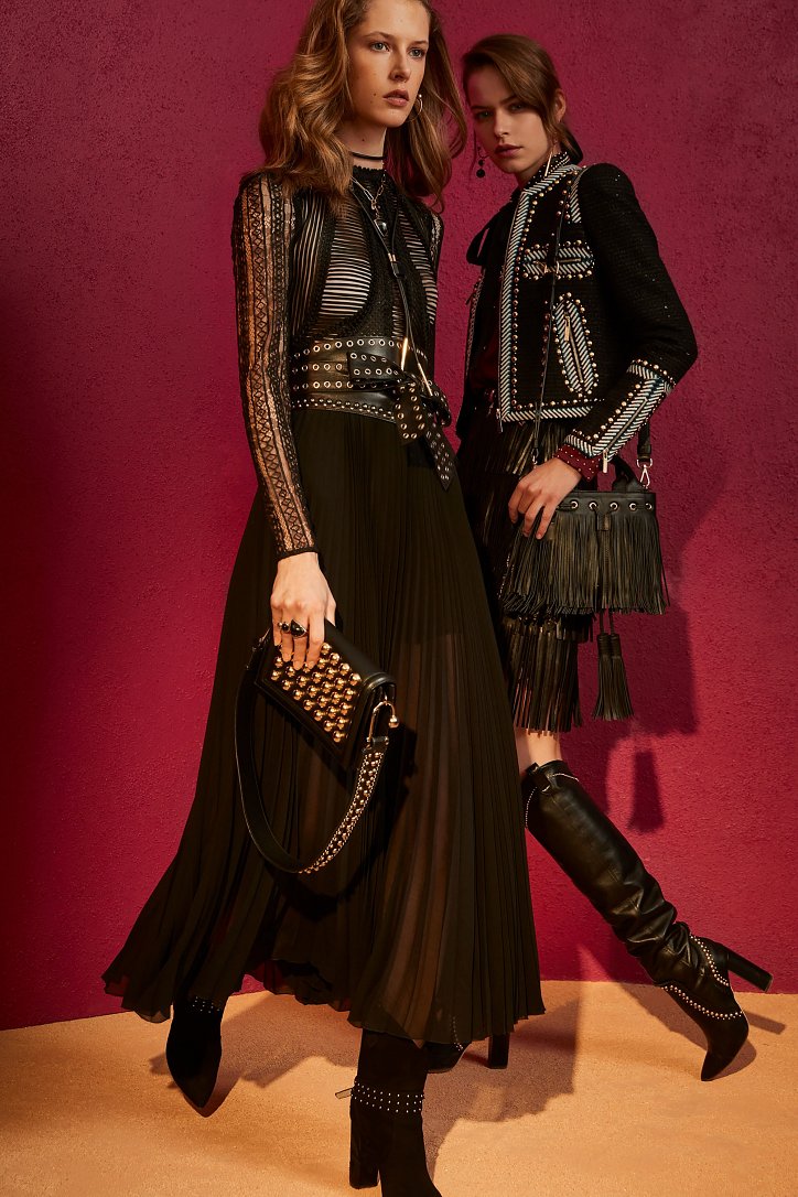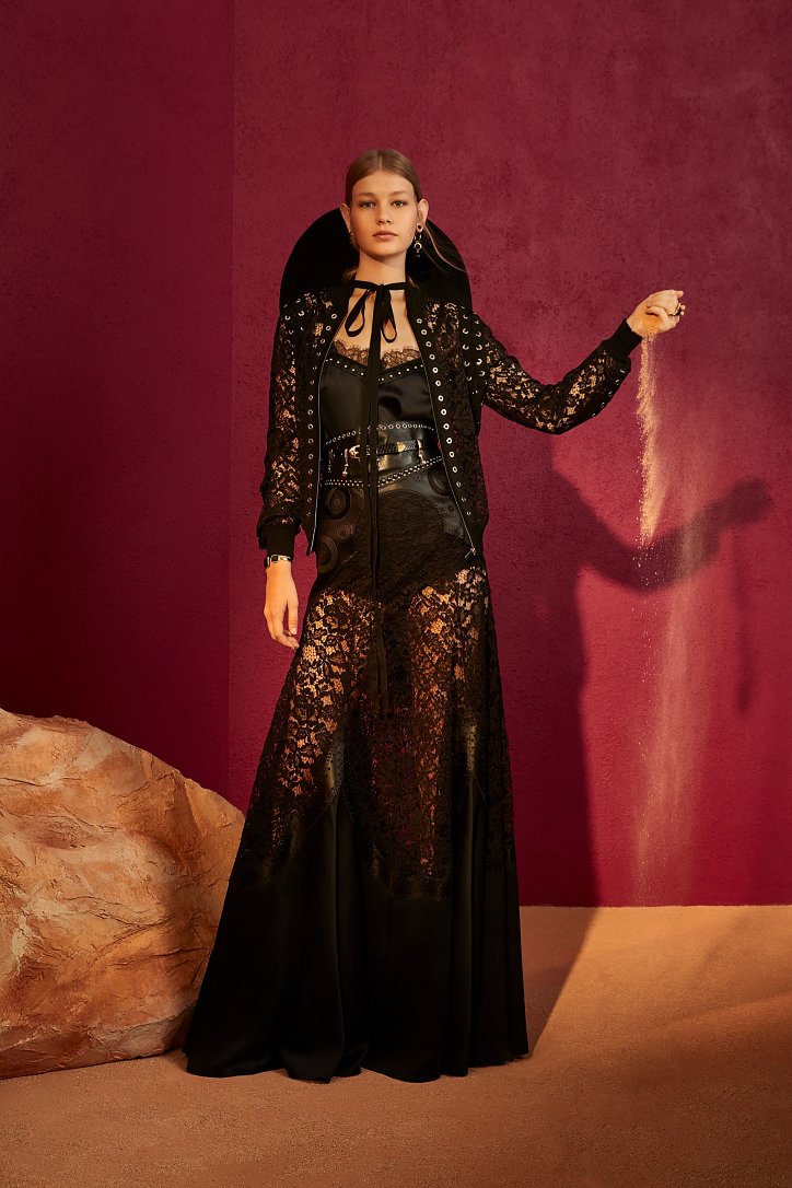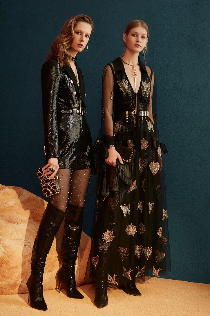 В межсезонной коллекции Elie Saab кружево и шифон великолепно сочетаются с черной кожей, черно-красно-белые мексиканские орнаменты прекрасно себя чувствуют в компании с бисерной вышивкой, ковбойские шляпы и черные кожаные аксессуары придают ноток дерзости нежно-голубым вечерним платьям с искусной вышивкой, а высокие каблуки так и вовсе «сопровождают» абсолютно все образы.