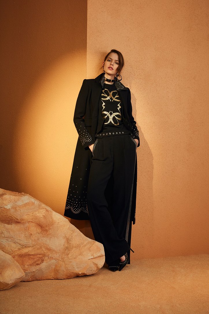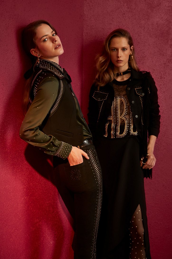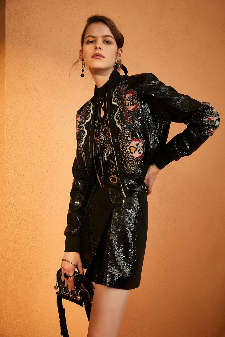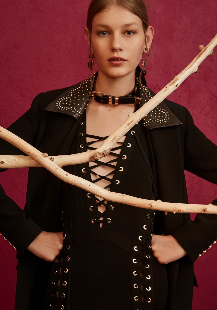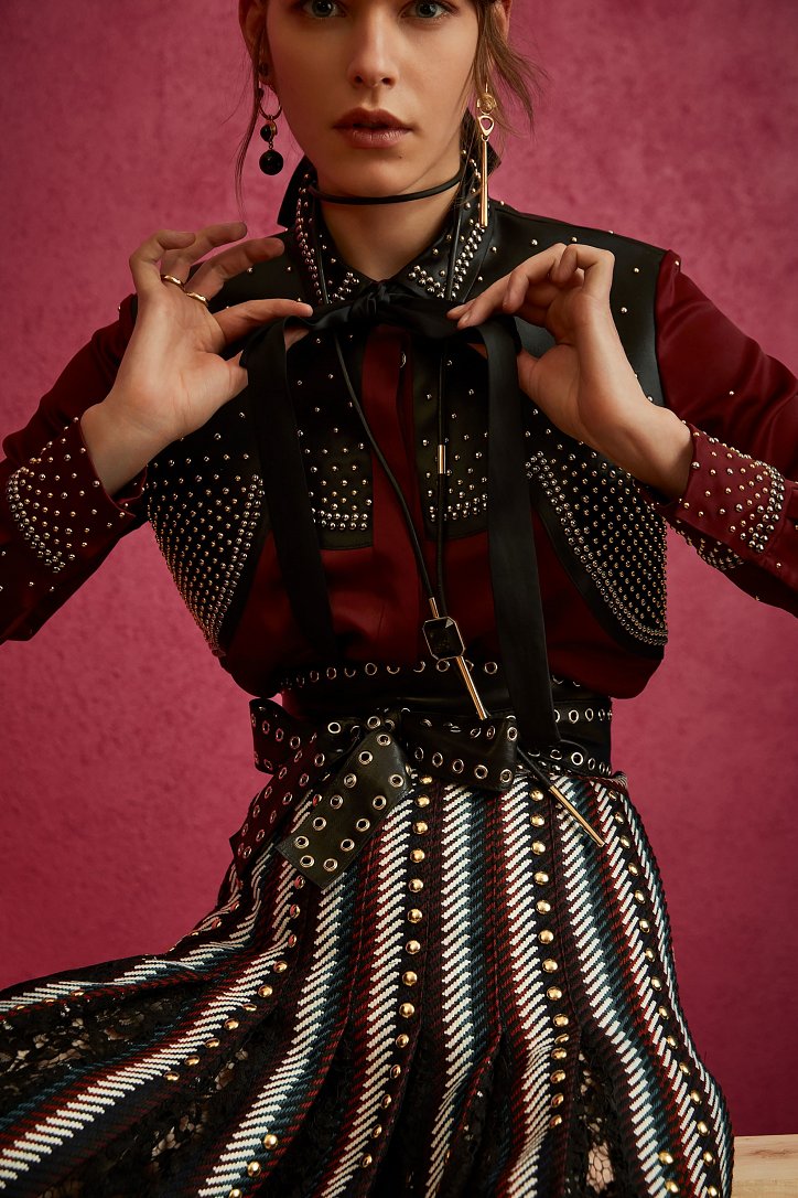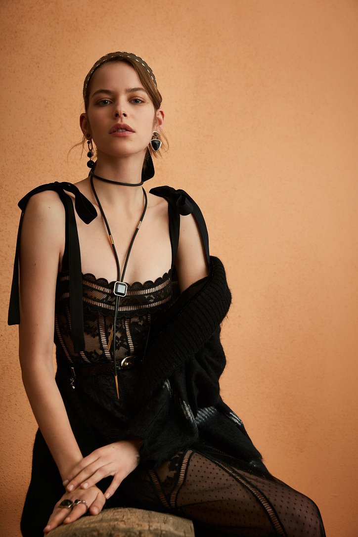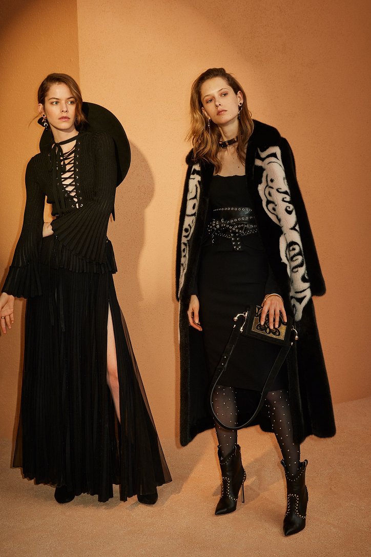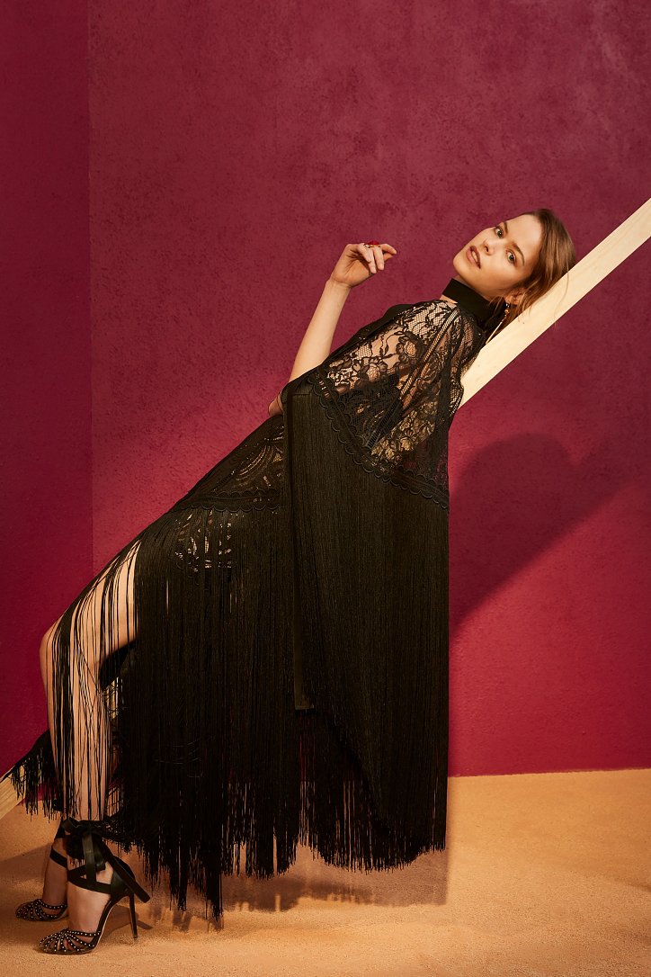 В межсезонной коллекции Elie Saab кружево и шифон великолепно сочетаются с черной кожей, черно-красно-белые мексиканские орнаменты прекрасно себя чувствуют в компании с бисерной вышивкой, ковбойские шляпы и черные кожаные аксессуары придают ноток дерзости нежно-голубым вечерним платьям с искусной вышивкой, а высокие каблуки так и вовсе «сопровождают» абсолютно все образы.
