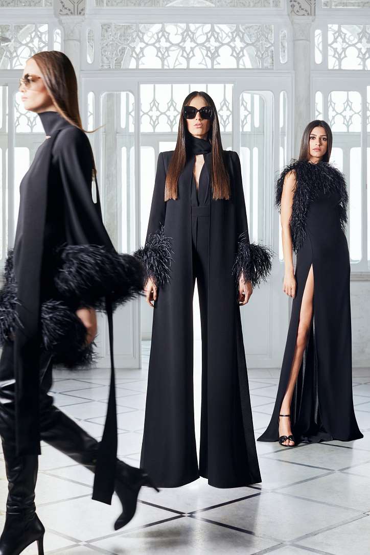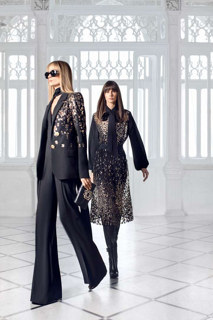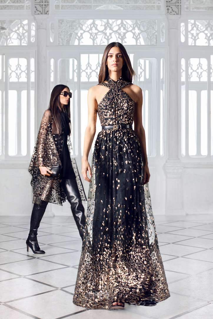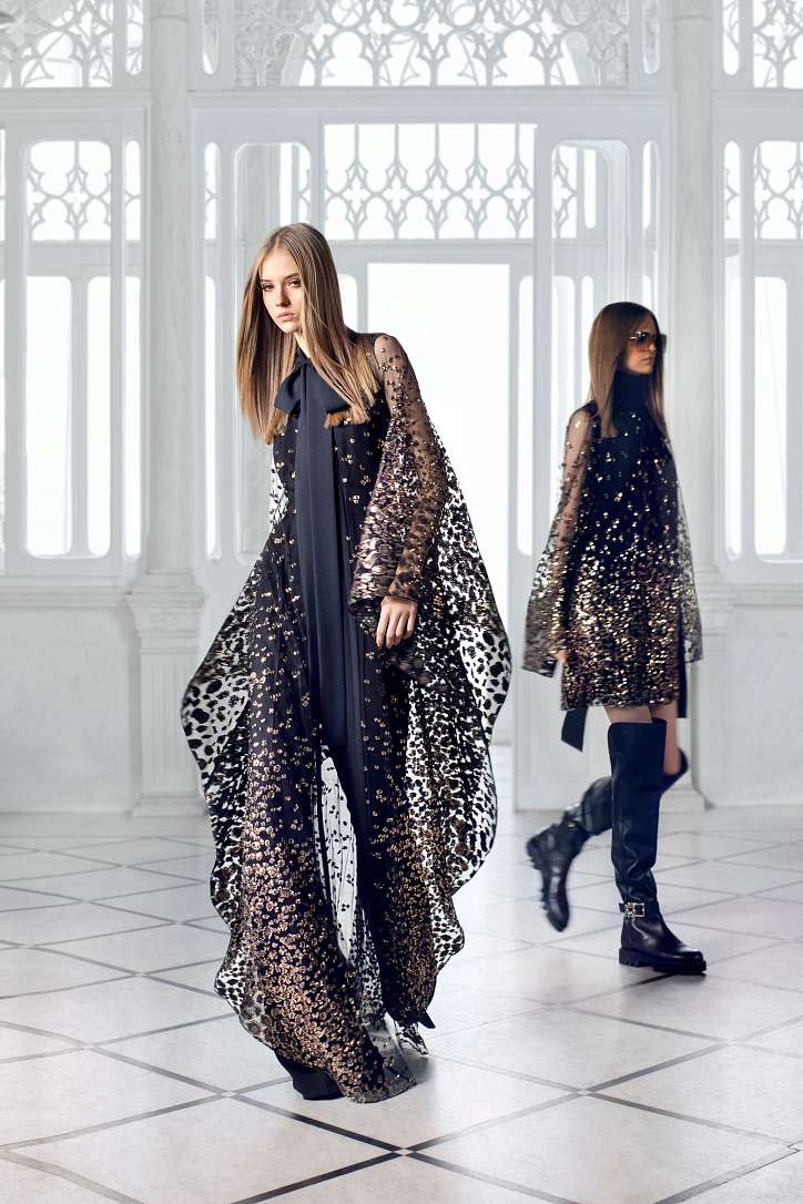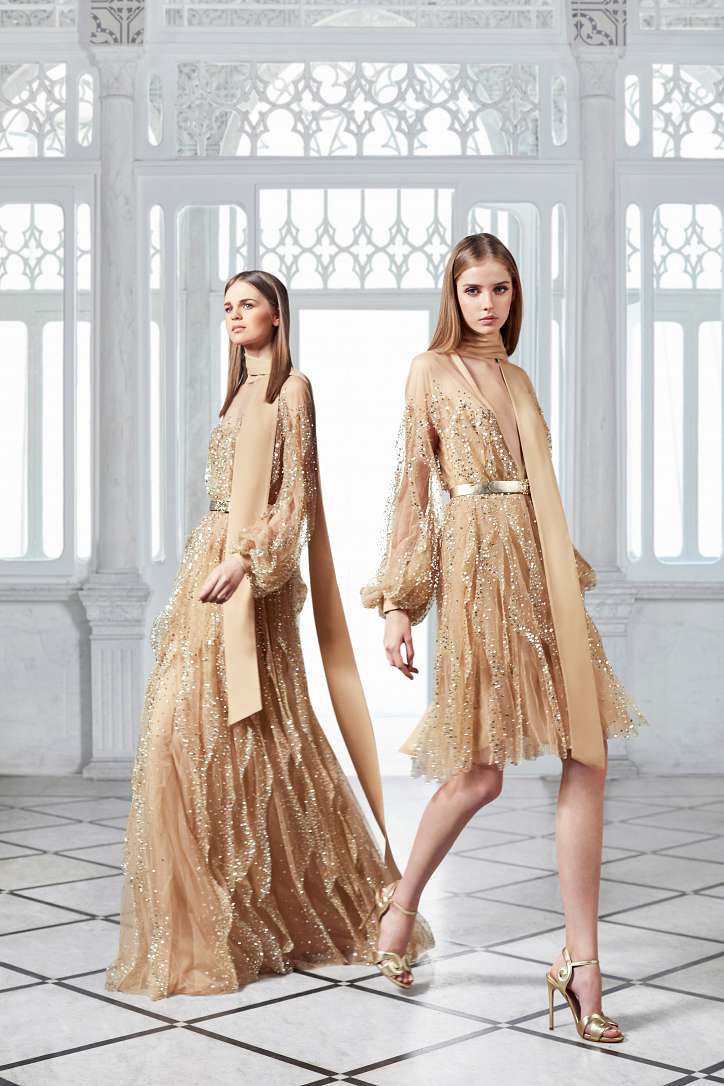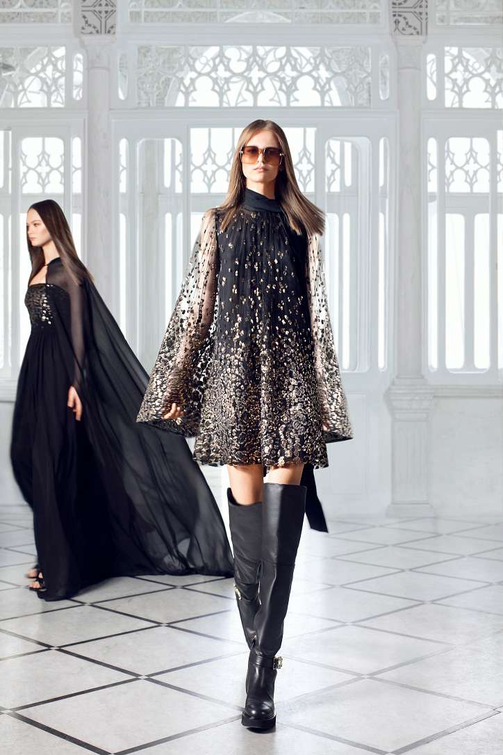 Взяв за основу стиль семидесятых, Эли Сааб создал безупречную коллекцию, в которой были и стильные удлинённые брюки клёш, и ярко-красные мини-платье и комбинезон, выполненные в технике макраме, и блузки с воротниками-бантами. Для дневного времени предназначены были и двубортное пальто с пышными рукавами, и кейпы, и клетчатые костюмы, и высокие сапоги. Но большая часть коллекции, конечно же, была создана для «особых» случаев. Здесь царили золотые пайетки и перья, шифон и тюль, плиссировка и летящие силуэты, оборки и леопардовые принты – словом, гламур и ещё раз гламур!