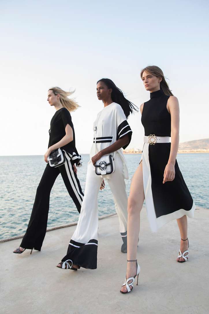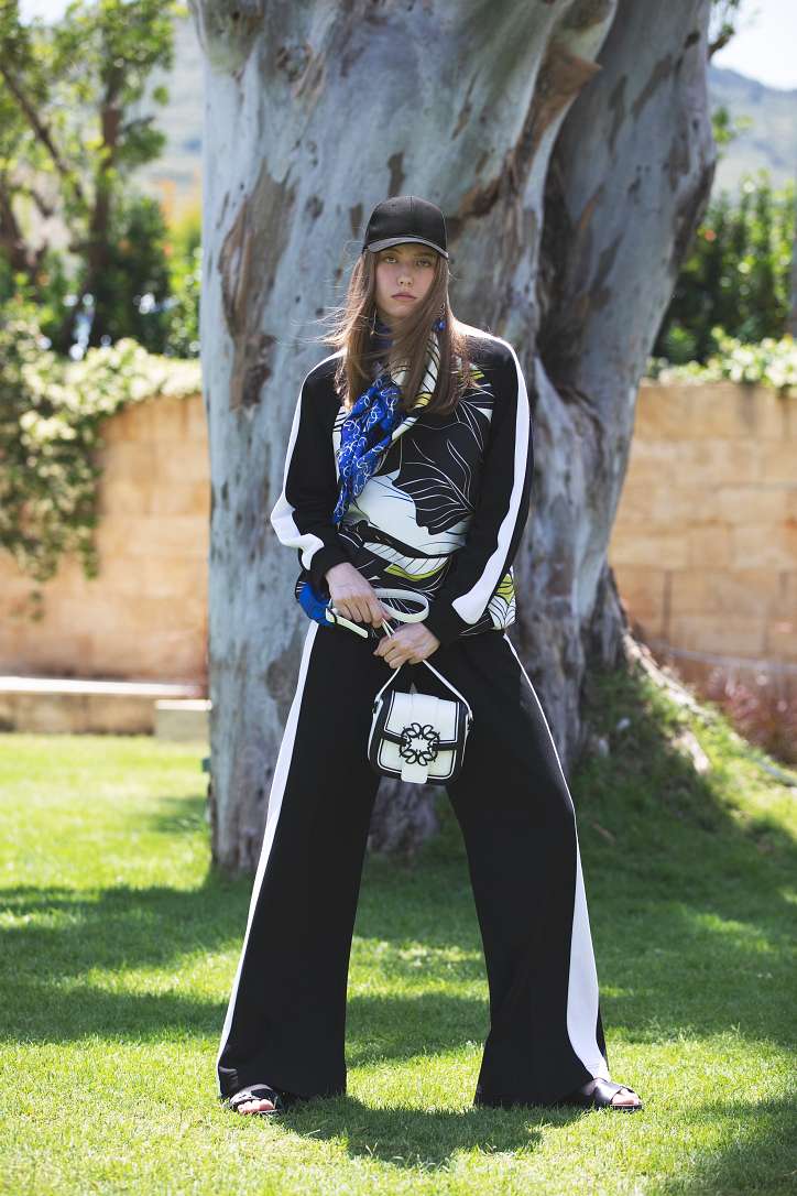 В дневной гардероб вошли ансамбль а ля спортивный костюм - с широкими брюками и топом, в котором белые «лампасы» на рукавах сочетались с крупным цветочным принтом (тот же принт повторялся в комплекте из шорт и пиджака), «морская серия», состоящая из летних платьев, комплектов и костюмов в черно-белых тонах, и аксессуары (сумки, кепки и обувь).
