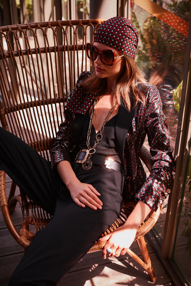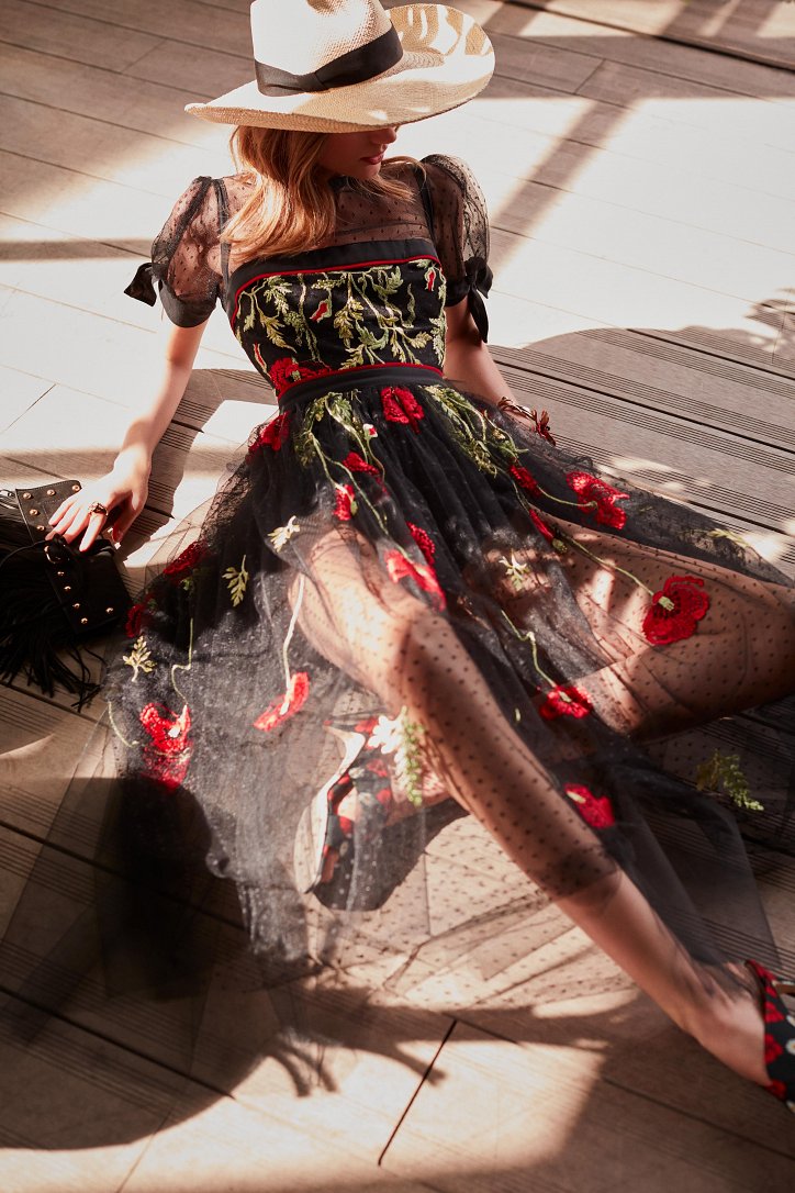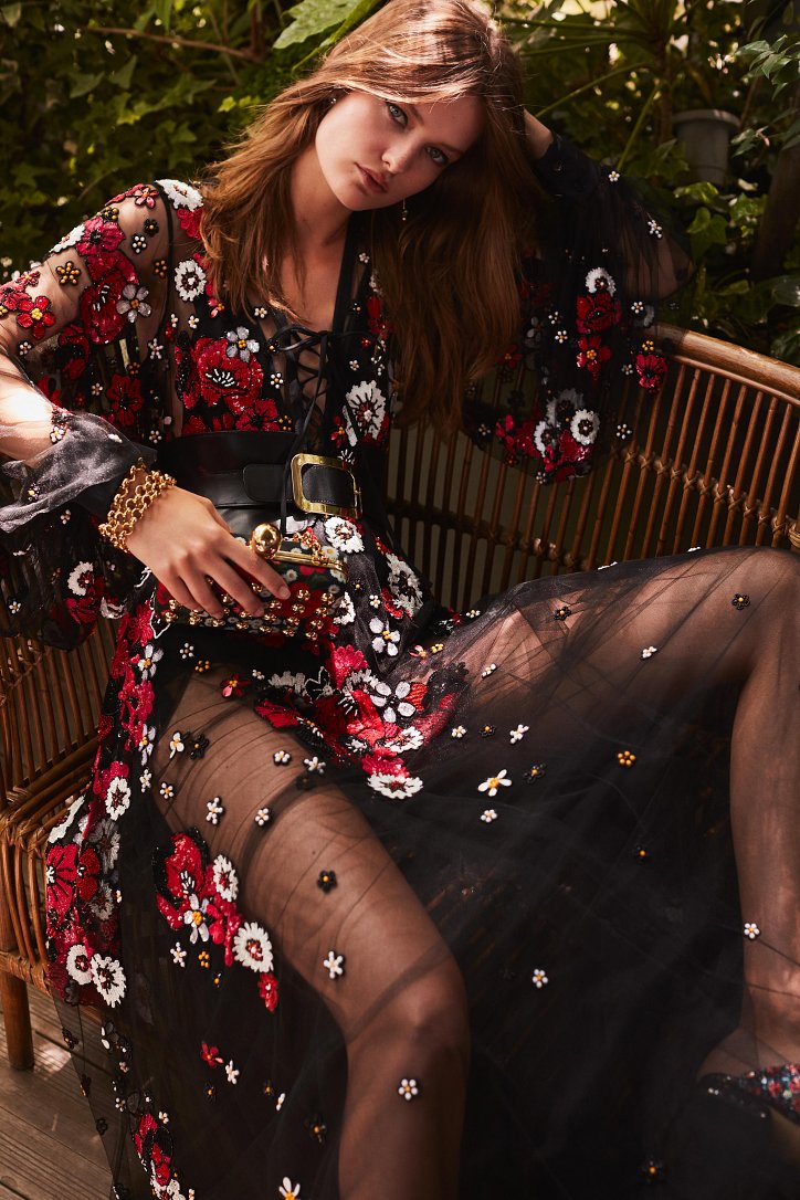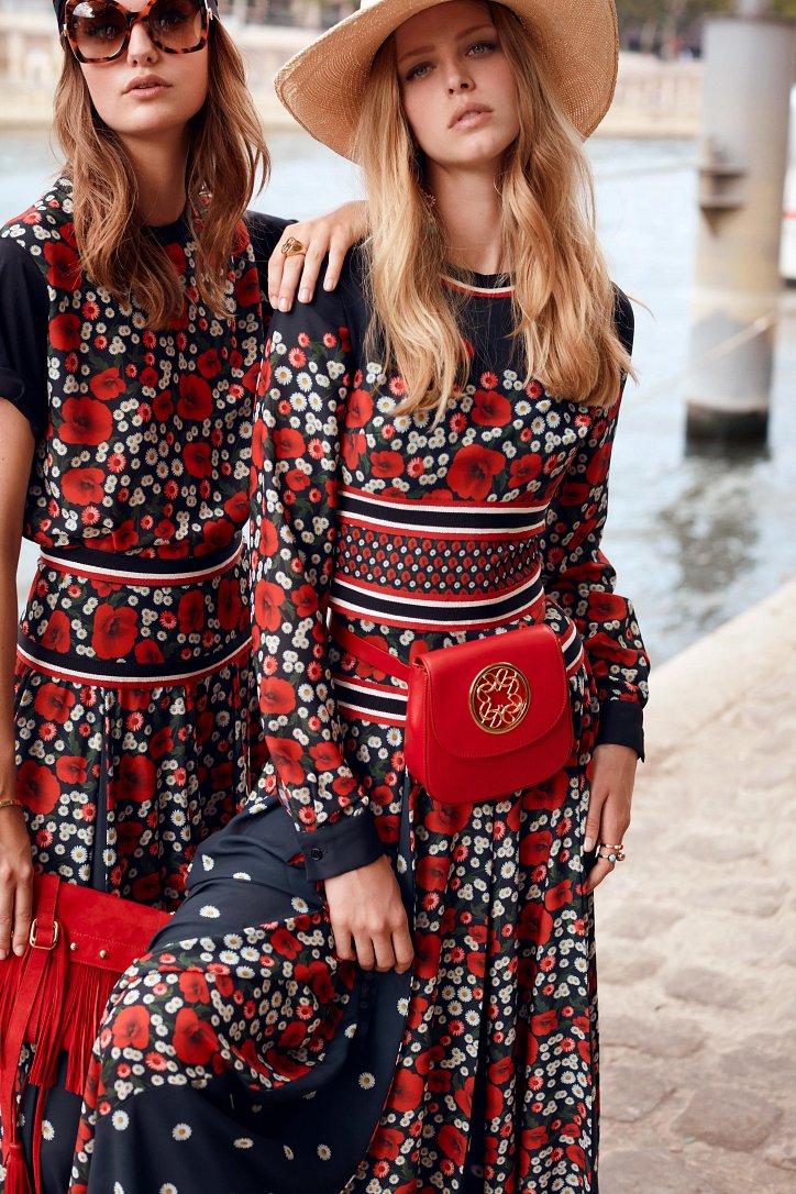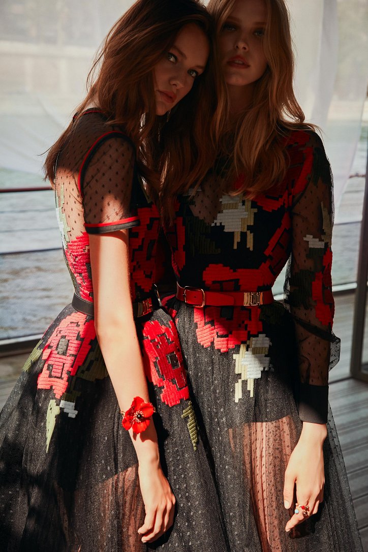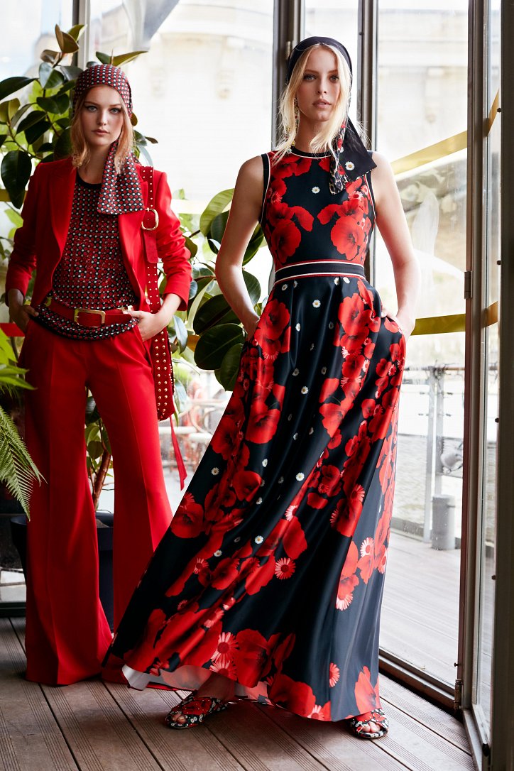 Тон задавали цветы – красные маки, нежные ромашки и голубые незабудки дизайнер «рассыпал» по всей коллекции: яркие цветочные принты, вышивка и объемный декор из пайеток красовались на летящих платьях и куртках-бомберах, вечерних комбинезонах и рубашках, сумочках и украшениях. Цветы определили и цветовую палитру коллекции: в ней преобладали красный, белый, желтый, синие оттенки и – для создания яркого контраста – черный цвет.