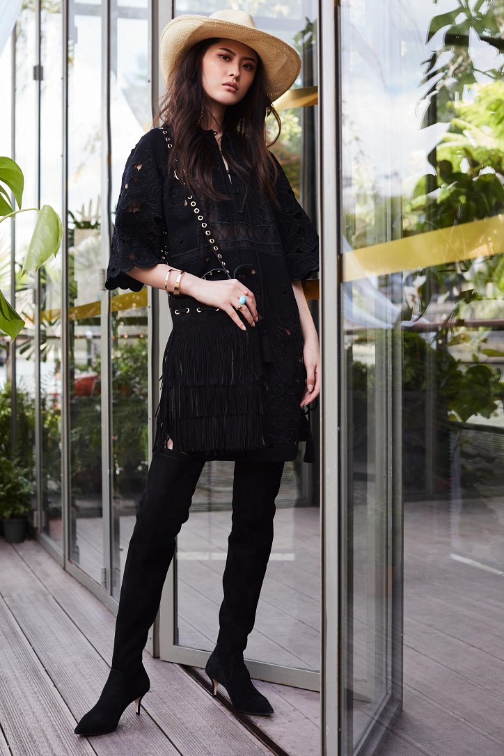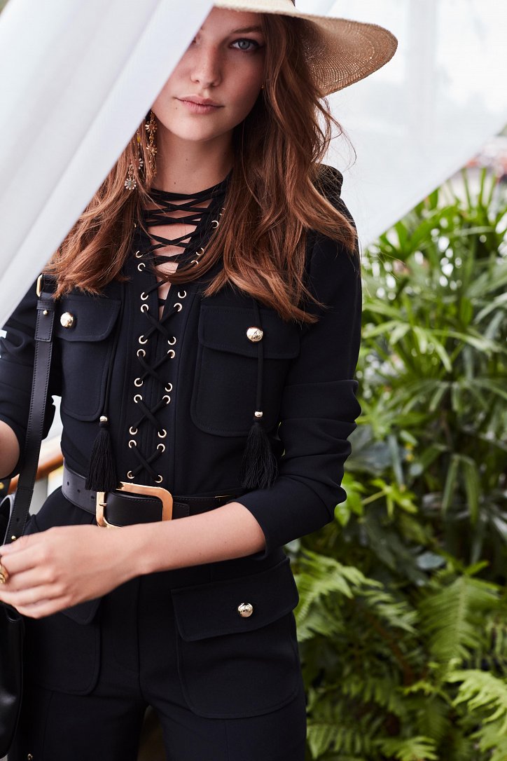 Стилистику образов диктовало и «место действия» - дизайнер предложил путешествие в Сен-Тропе времен 70-ых. Об этом свидетельствовали богемные мотивы, блеск, кружева ришелье и даже неожиданный для всех джинсовый комбинезон.