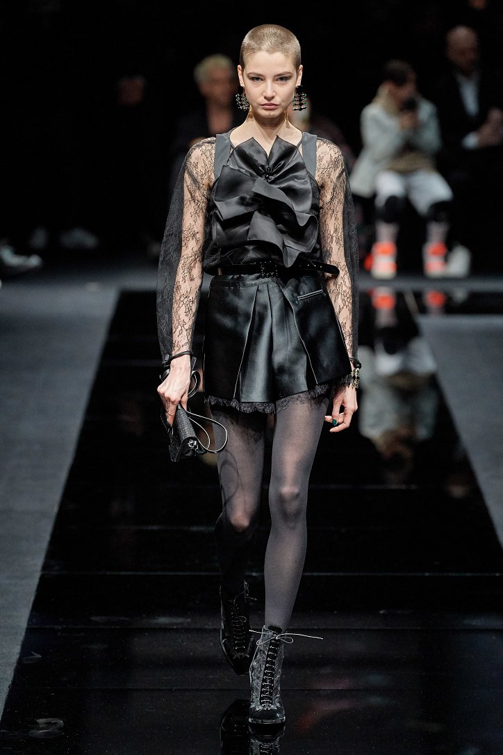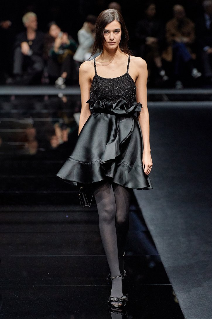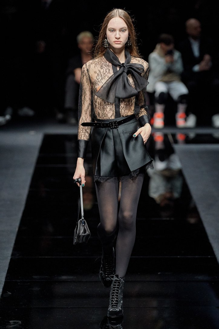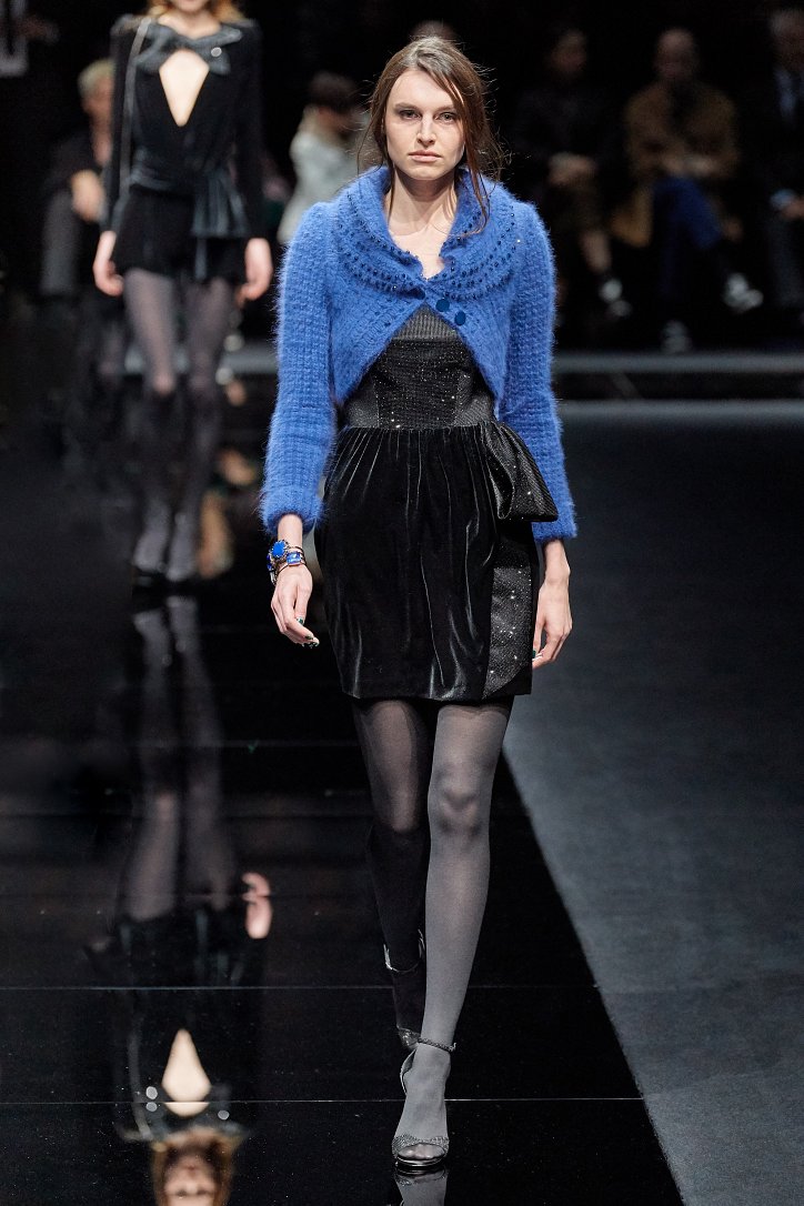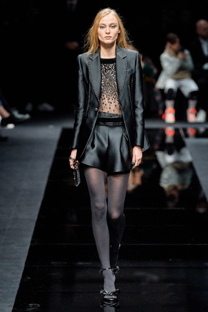 Женщина Emporio Armani волнует, удивляет и не склонна соблюдать правила – скорее, она напишет их сама. В ее гардеробе много черного, который в будни она «разбавляет» серым и белым, а в «особых случаях» - изумрудным, сапфировым, цветом морской волны и бирюзы. Она носит брючные костюмы с широкими брюками и шортами, пышные стеганые юбки и пальто-оверсайз, коктейльные мини-платья и мохеровые болеро, широкие галстуки и шляпы-котелки. Она молода, самодостаточна и сама творит моду.