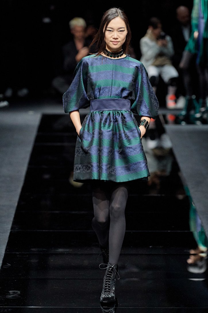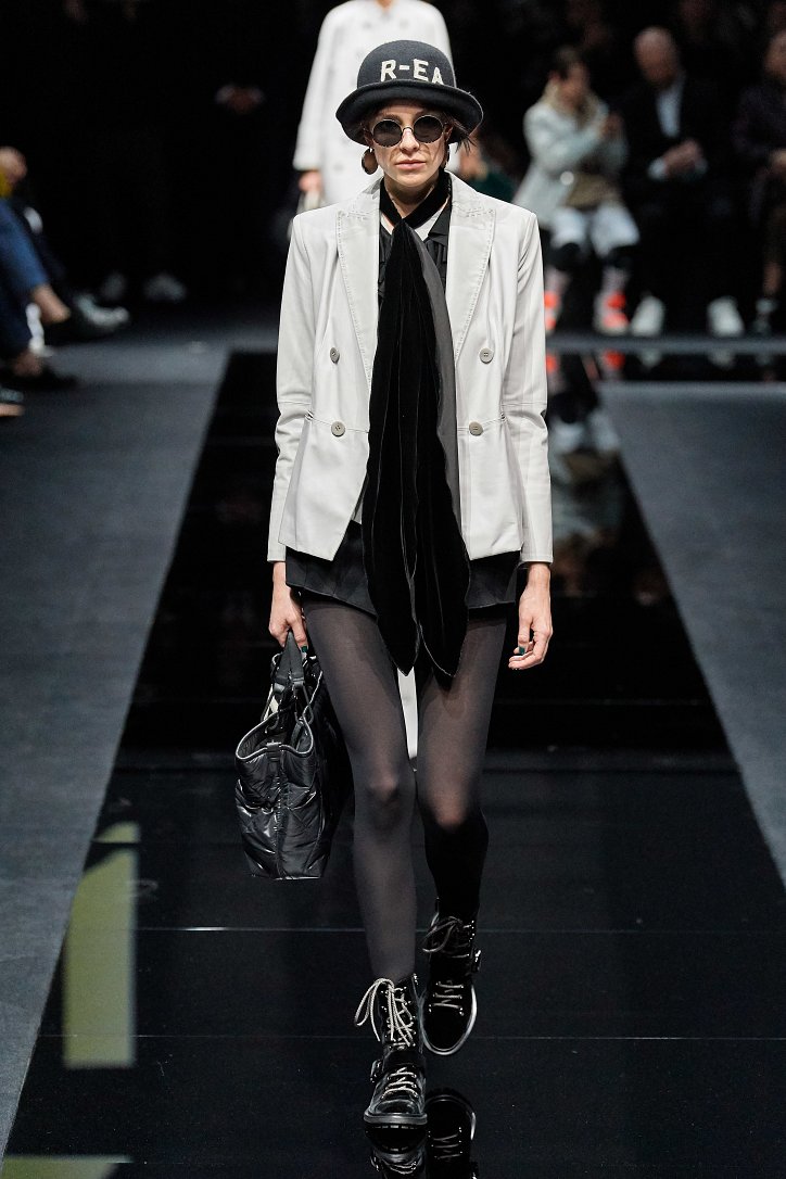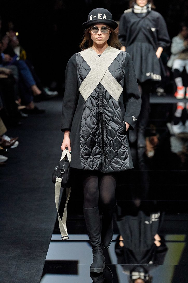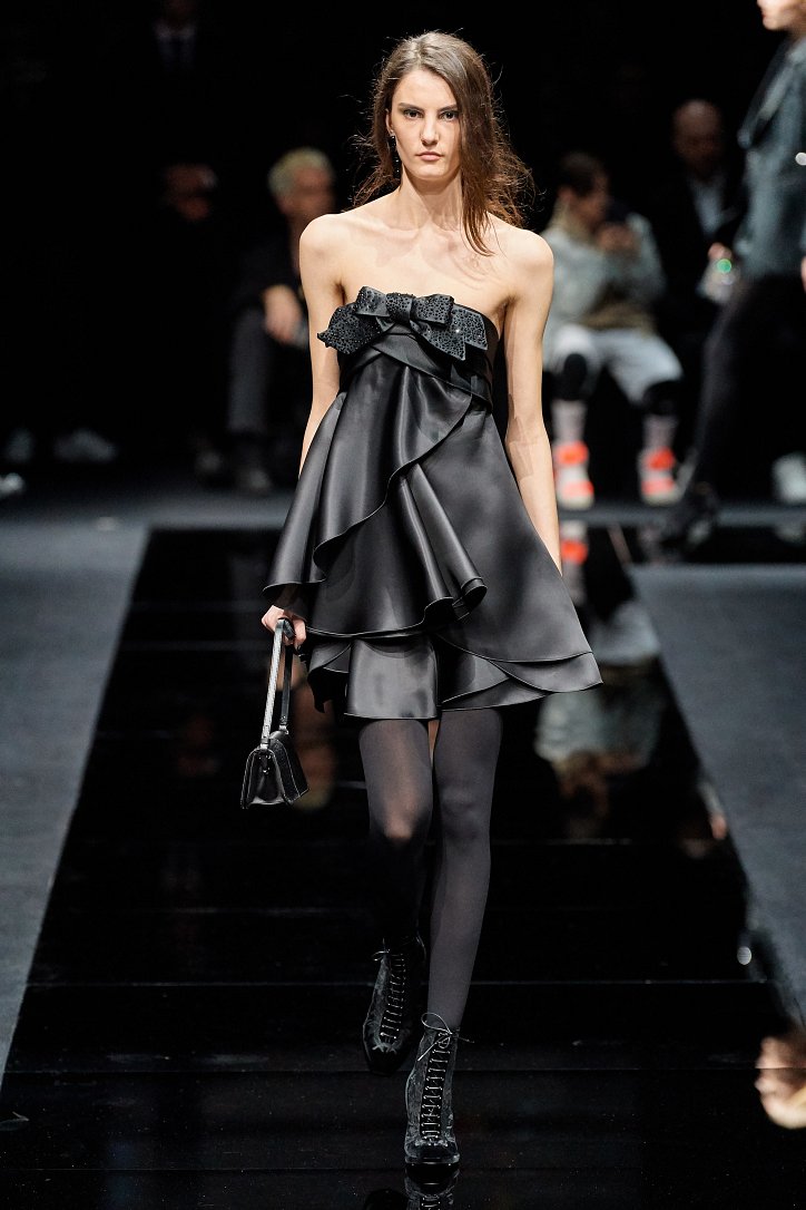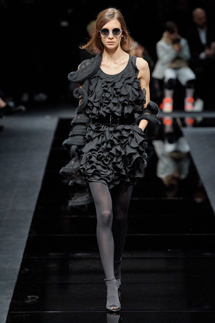 Женщина Emporio Armani волнует, удивляет и не склонна соблюдать правила – скорее, она напишет их сама. В ее гардеробе много черного, который в будни она «разбавляет» серым и белым, а в «особых случаях» - изумрудным, сапфировым, цветом морской волны и бирюзы. Она носит брючные костюмы с широкими брюками и шортами, пышные стеганые юбки и пальто-оверсайз, коктейльные мини-платья и мохеровые болеро, широкие галстуки и шляпы-котелки. Она молода, самодостаточна и сама творит моду.