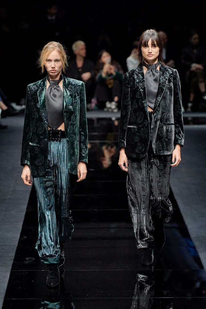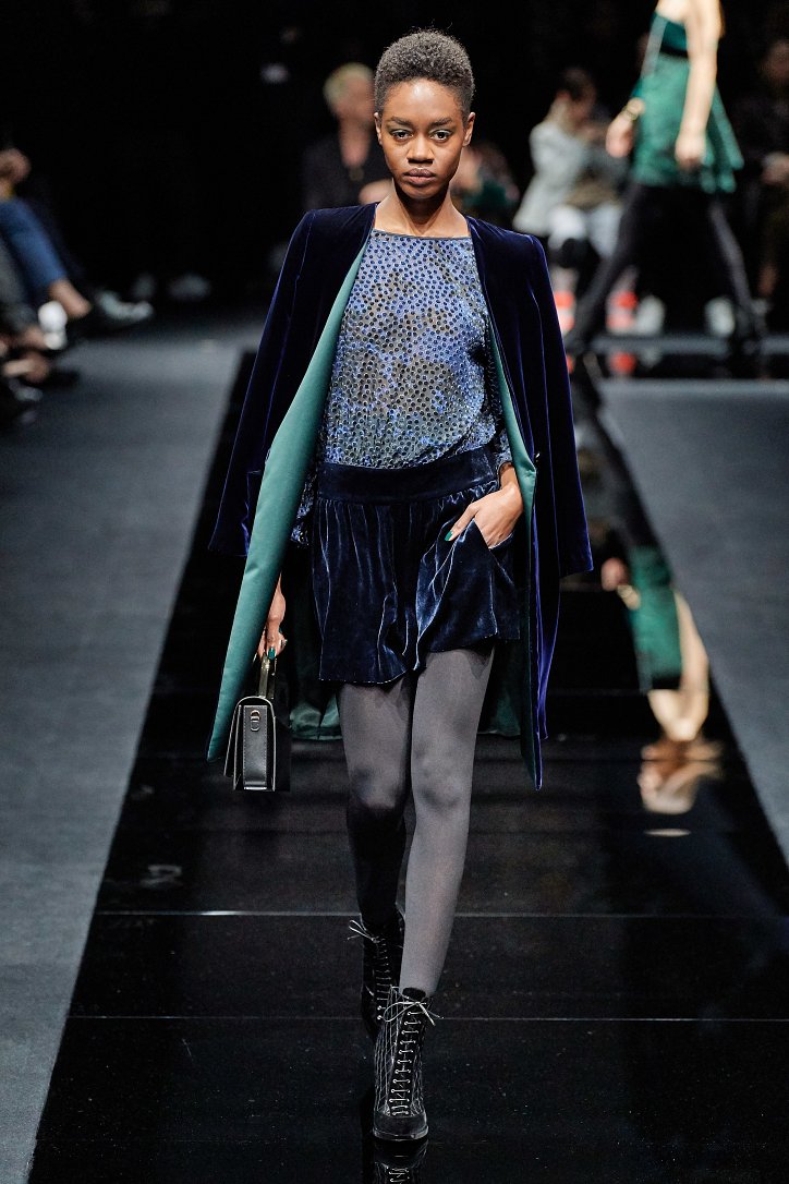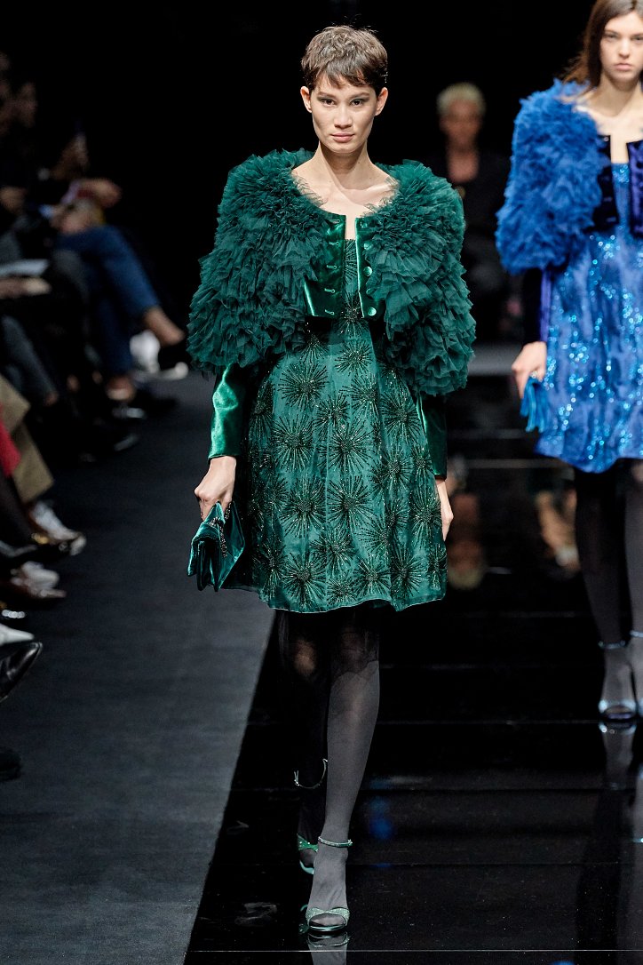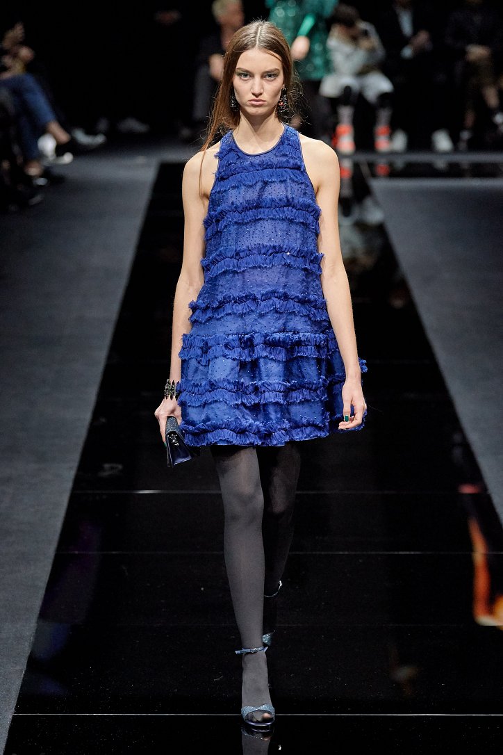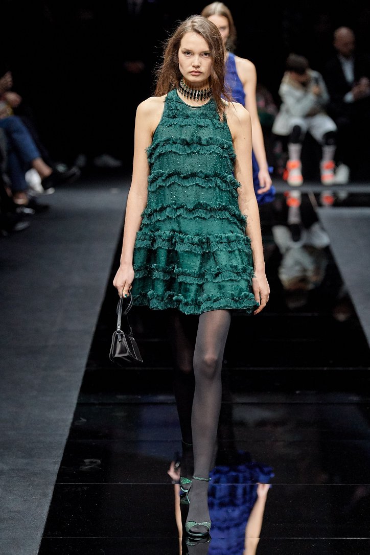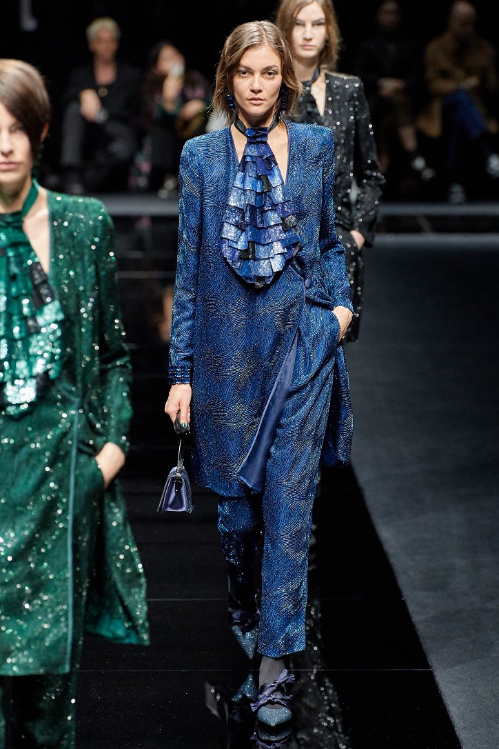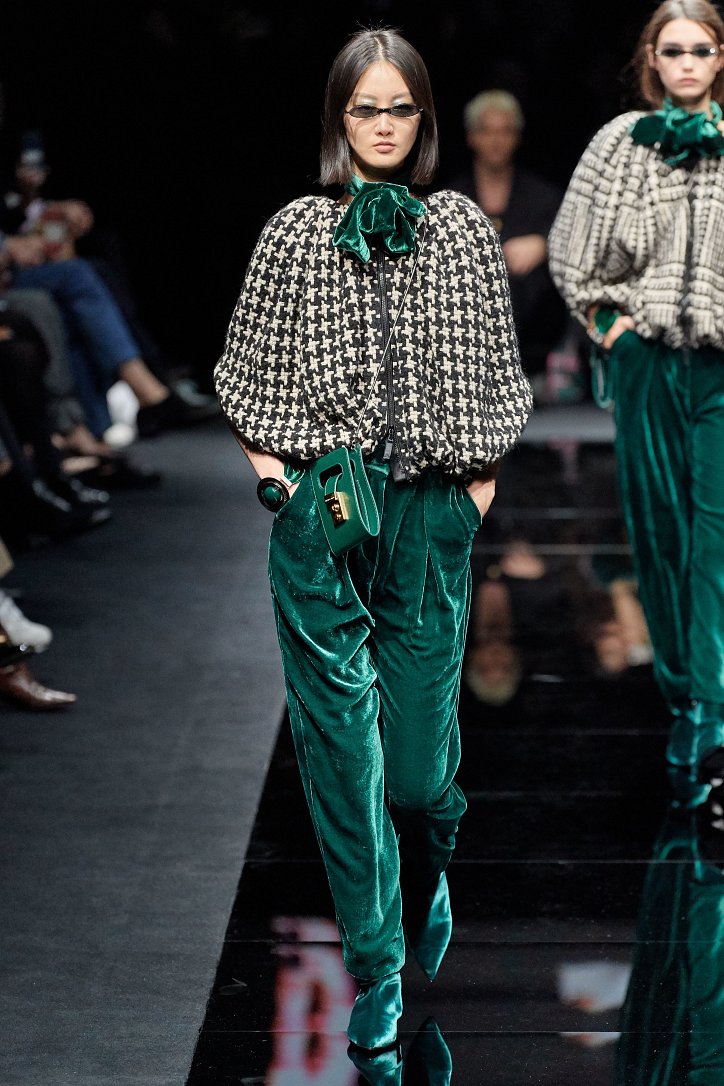 Драгоценные оттенки синего и зеленого, переработанные и органические материалы, крупная клетка и «гусиная лапка», роскошный бархат и «мужские» ткани, ультраженственные оборки и пайетки – коллекция Emporio Armani осень-зима 2020-2021 создана для сильных и решительных женщин, которые не боятся принимать решения и любят эклектику.