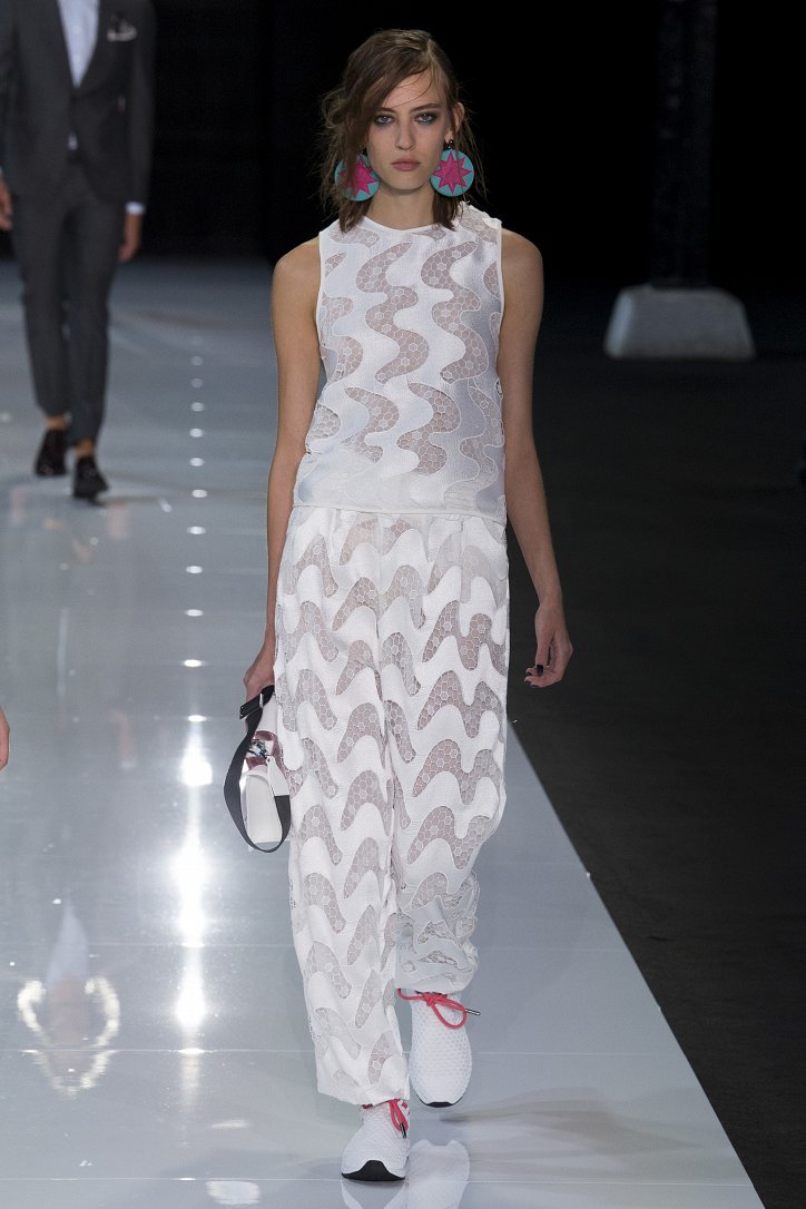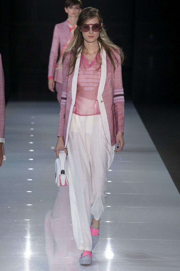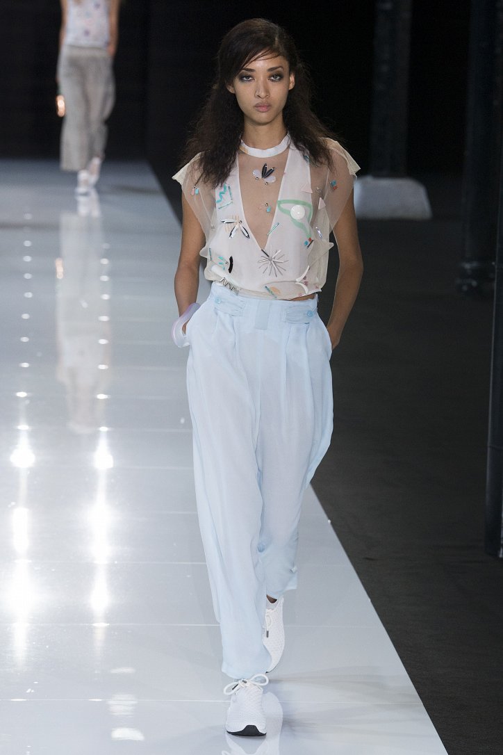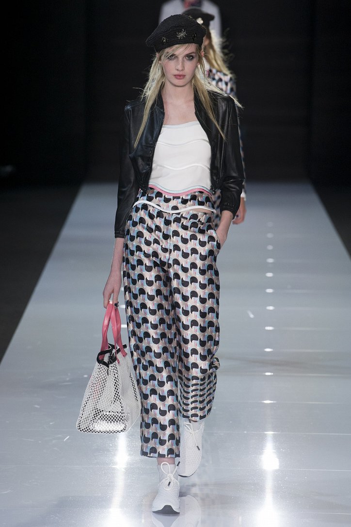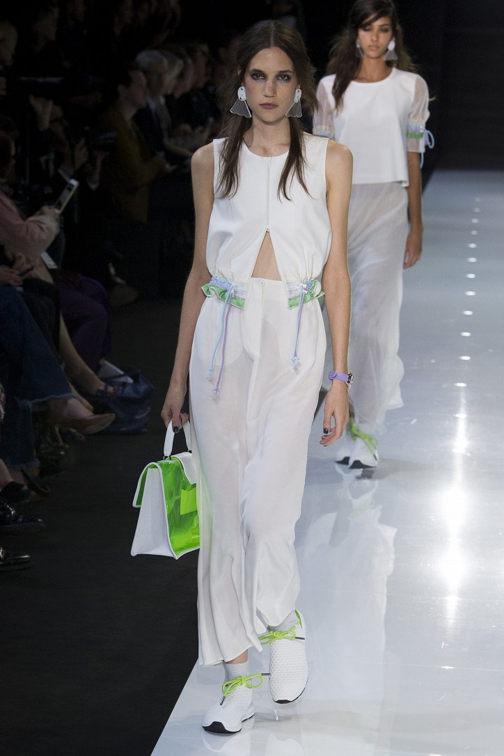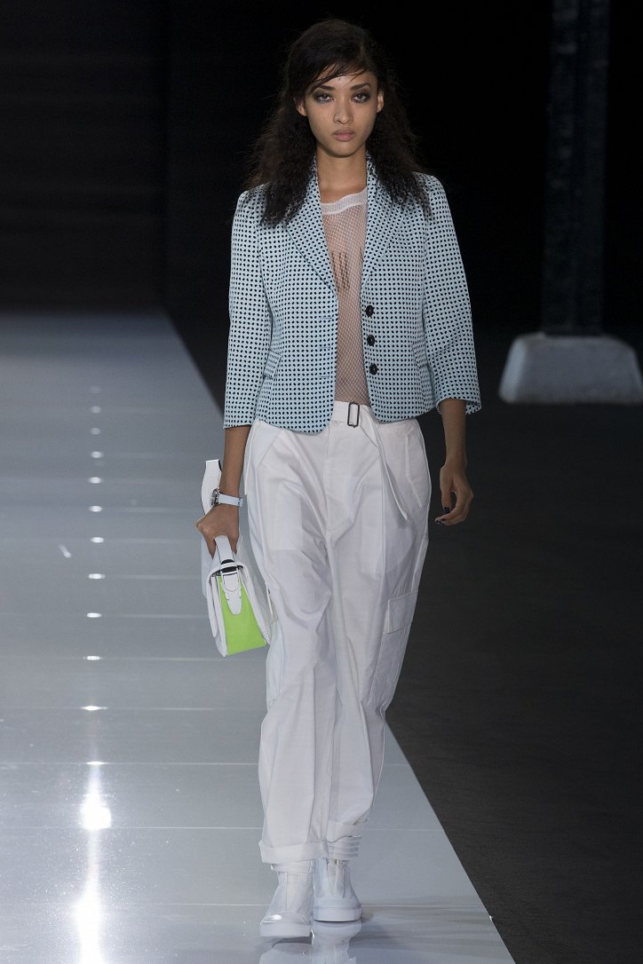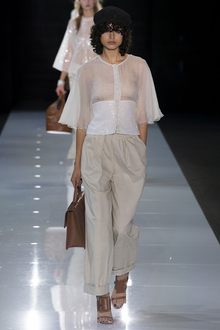 Главным действующим лицом коллекции Emporio Armani весна-лето 2018 стали брюки-чиносы: широкие и со складочками у пояса, с отворотами и манжетами внизу, из хлопка и шифона – дизайнер предлагает носить их в самых разных комбинациях. А дополнить весенне-летний гардероб Армани предлагает трикотажными летними пальто, мини-платьями, прозрачными плащами, юбками и топами, вышитыми бомберами, брючными костюмами, кожаными шортами, остроносыми туфельками и белыми кроссовками.