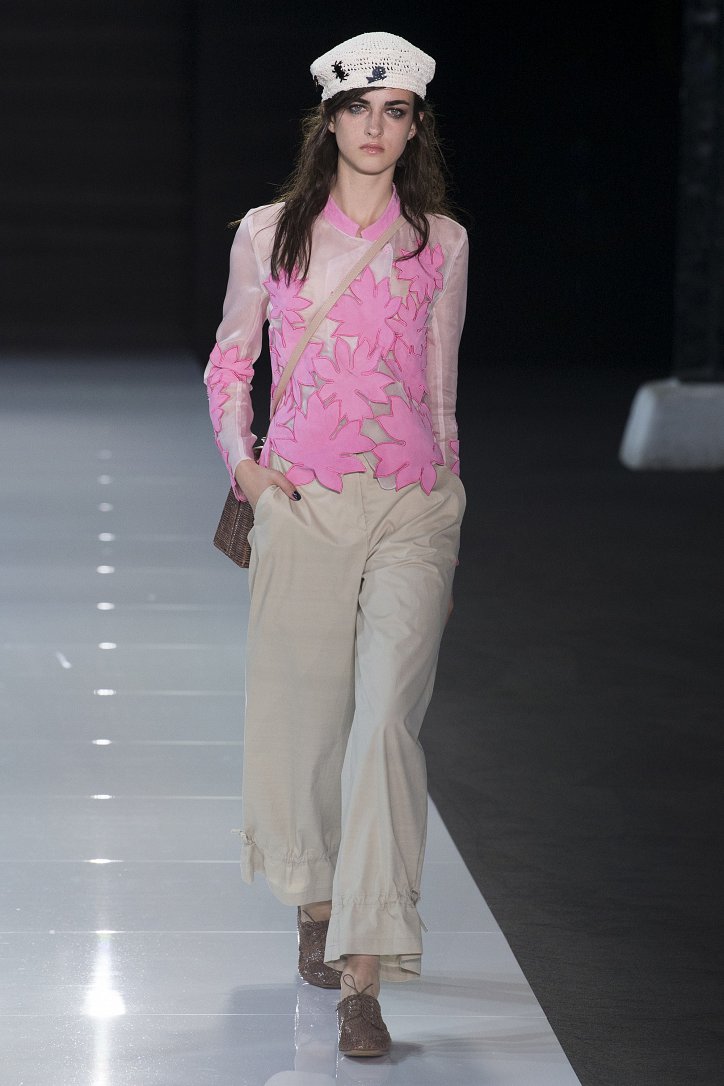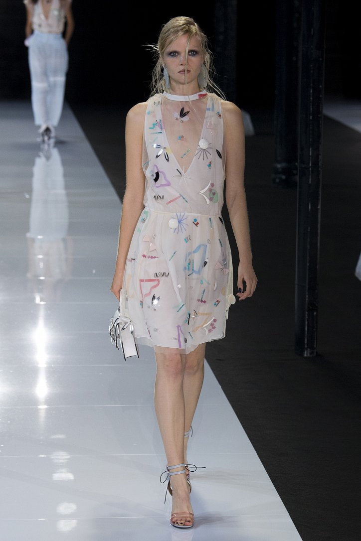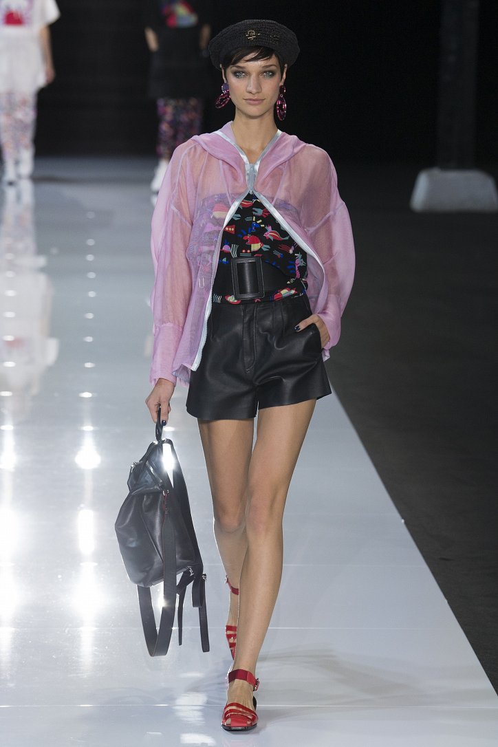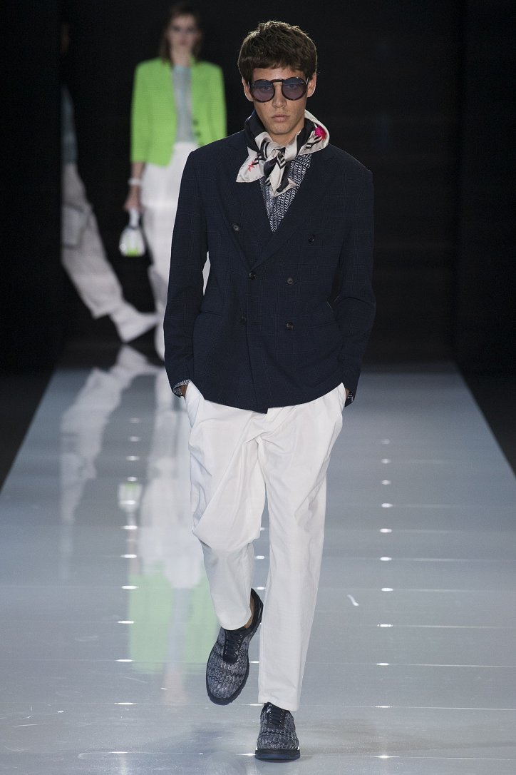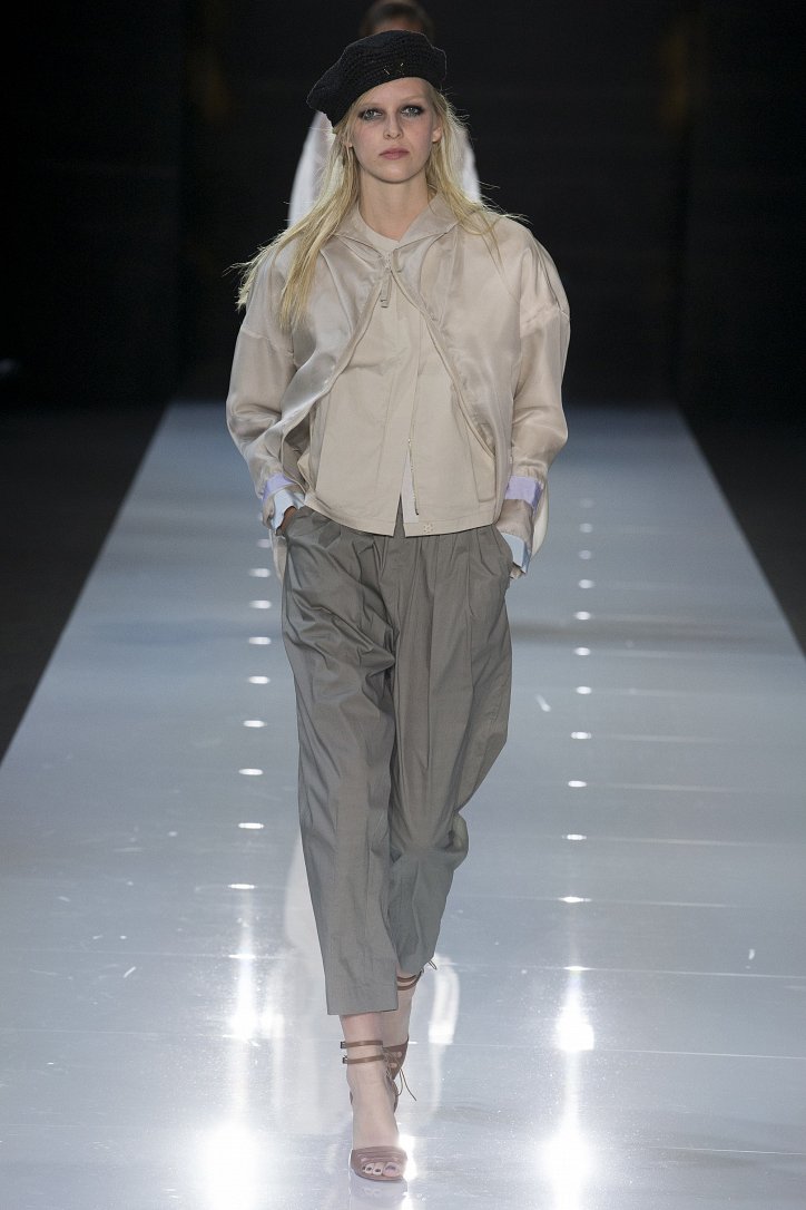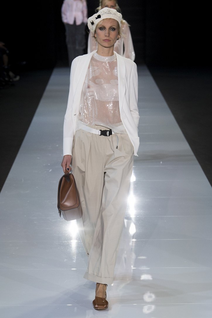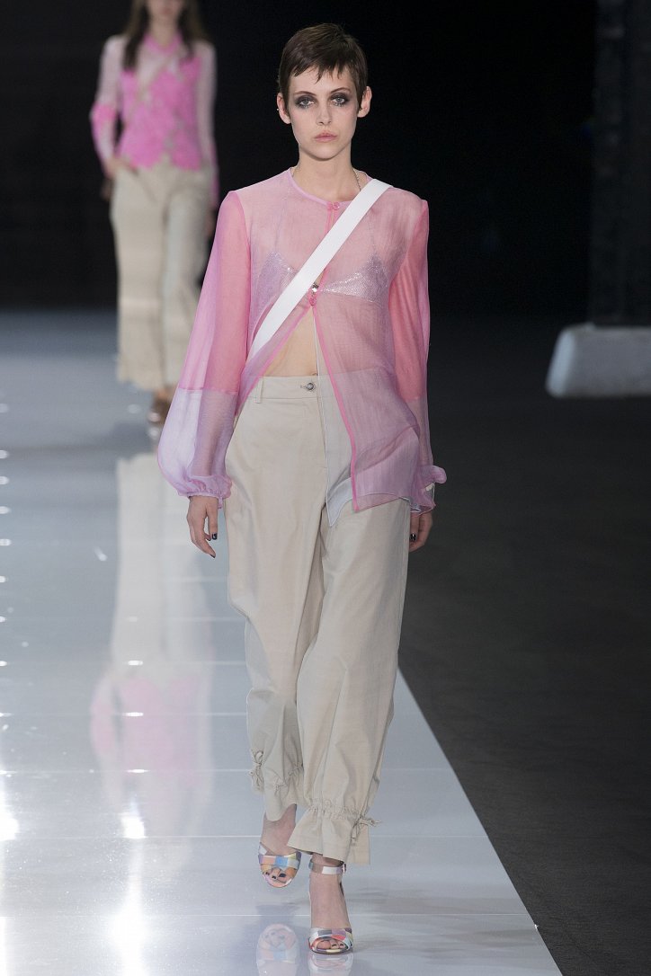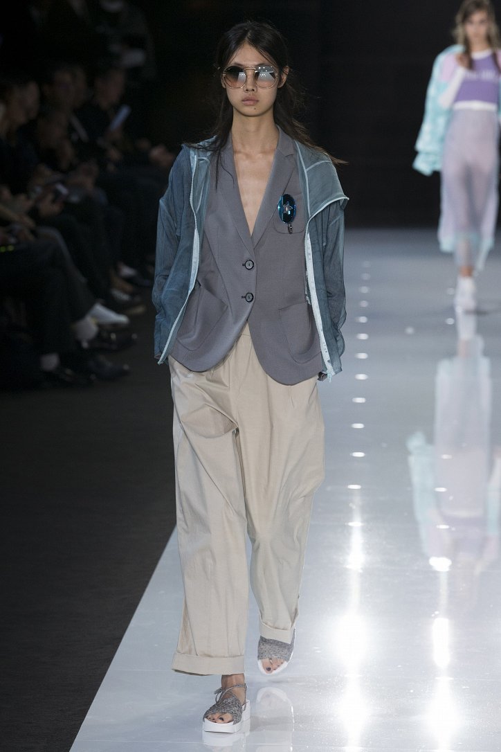 Главным действующим лицом коллекции Emporio Armani весна-лето 2018 стали брюки-чиносы: широкие и со складочками у пояса, с отворотами и манжетами внизу, из хлопка и шифона – дизайнер предлагает носить их в самых разных комбинациях. А дополнить весенне-летний гардероб Армани предлагает трикотажными летними пальто, мини-платьями, прозрачными плащами, юбками и топами, вышитыми бомберами, брючными костюмами, кожаными шортами, остроносыми туфельками и белыми кроссовками.