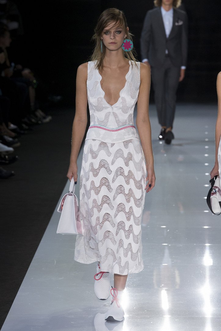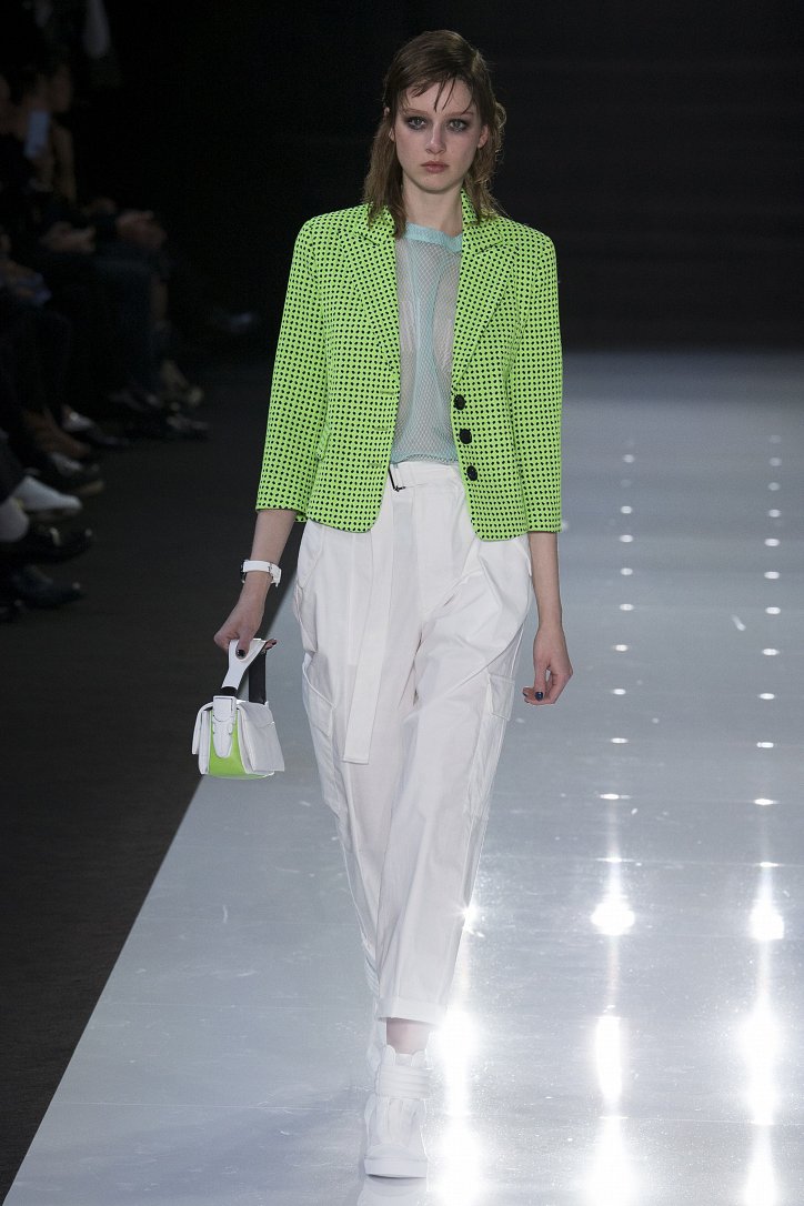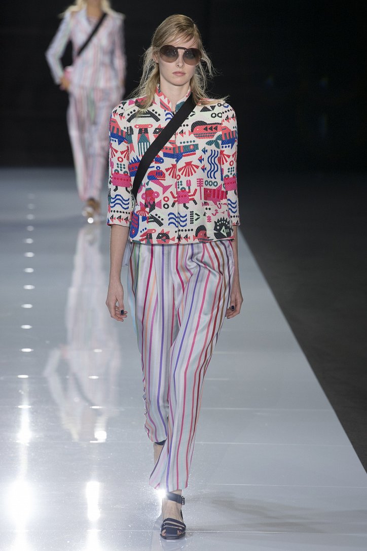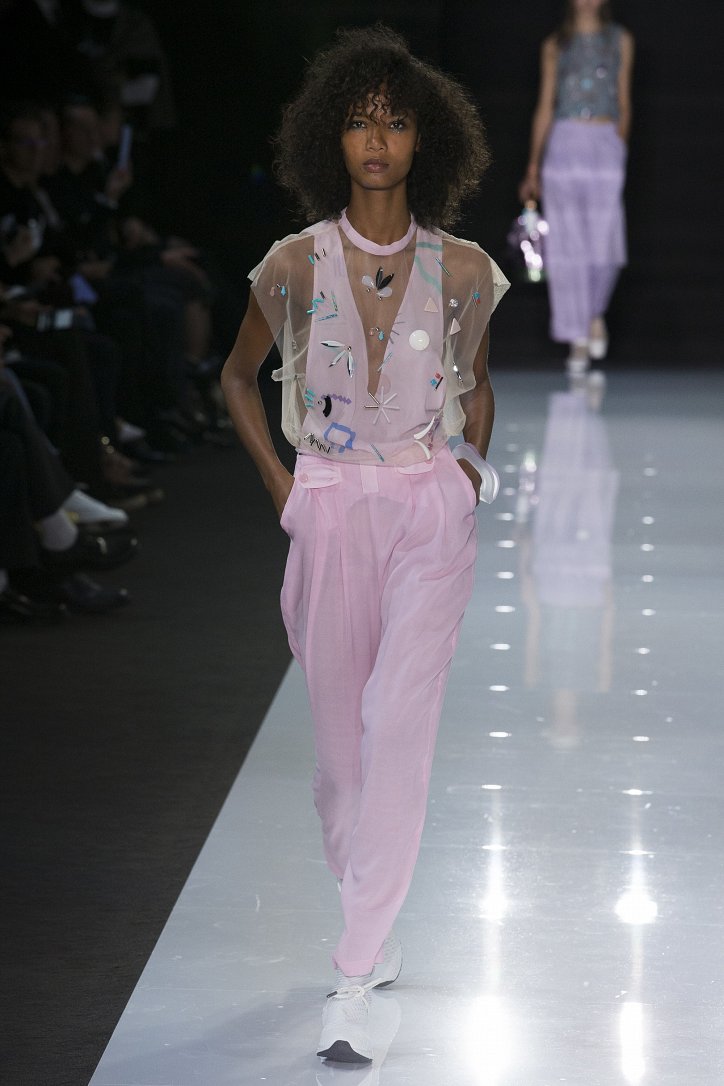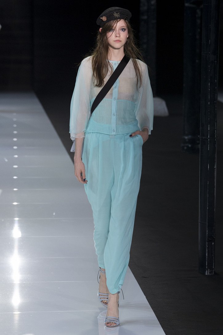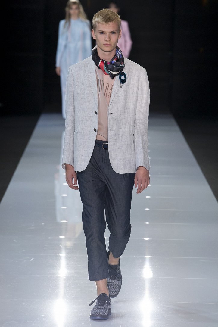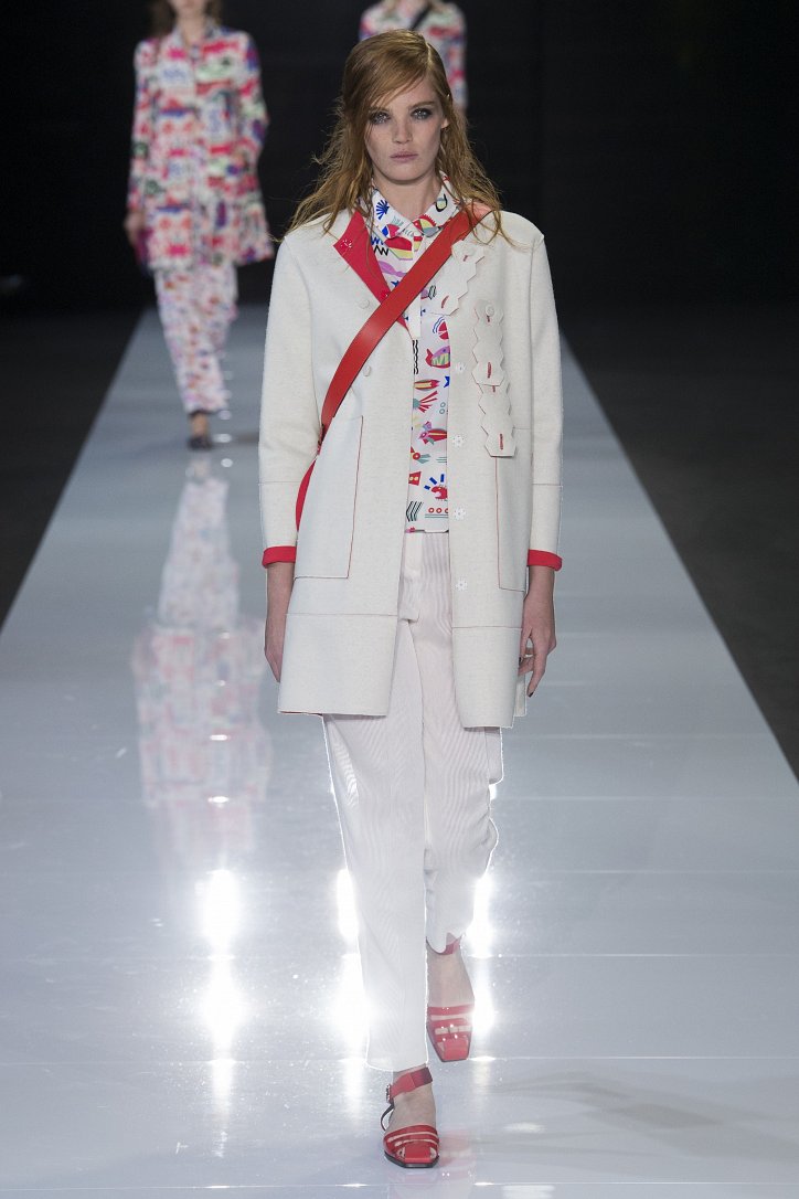 Главным действующим лицом коллекции Emporio Armani весна-лето 2018 стали брюки-чиносы: широкие и со складочками у пояса, с отворотами и манжетами внизу, из хлопка и шифона – дизайнер предлагает носить их в самых разных комбинациях. А дополнить весенне-летний гардероб Армани предлагает трикотажными летними пальто, мини-платьями, прозрачными плащами, юбками и топами, вышитыми бомберами, брючными костюмами, кожаными шортами, остроносыми туфельками и белыми кроссовками.