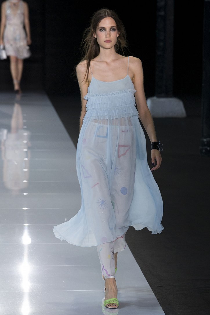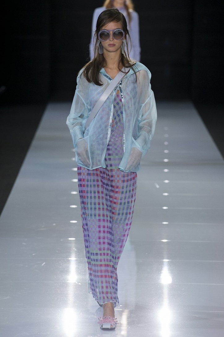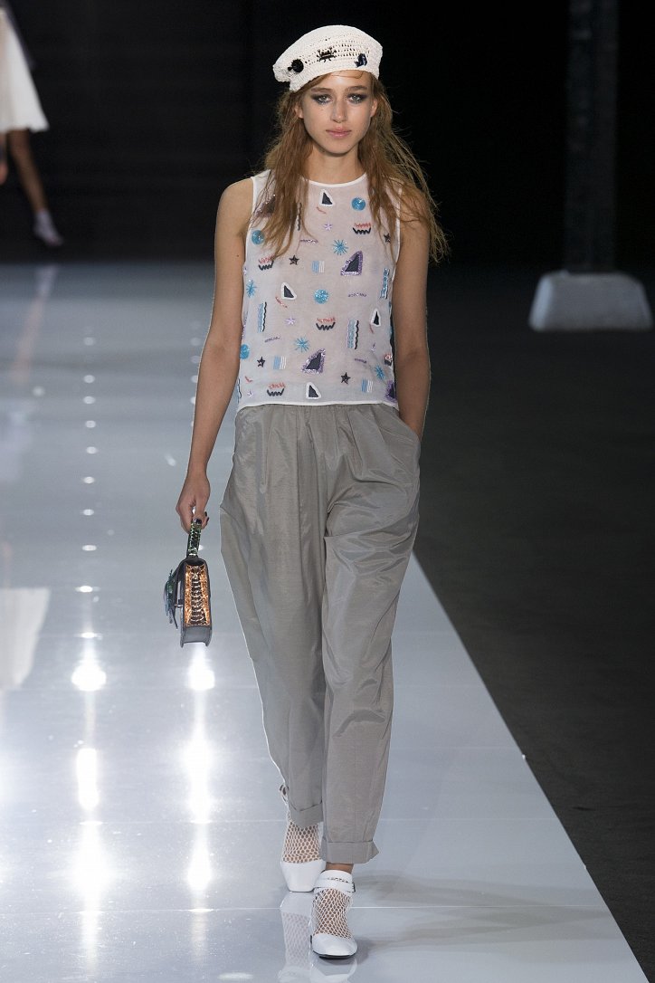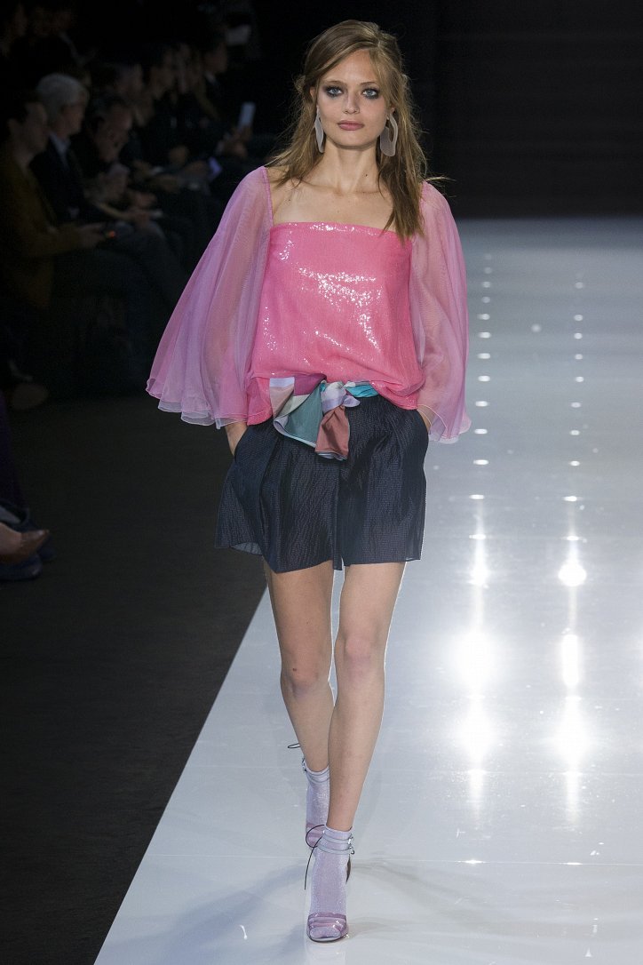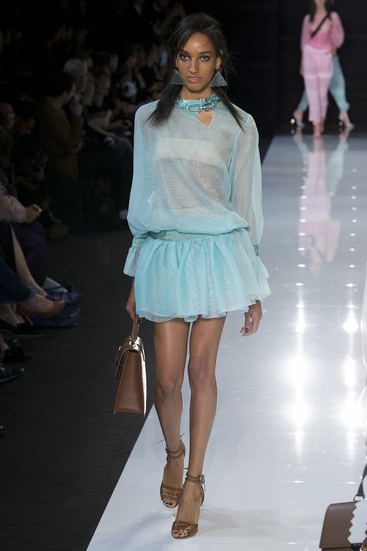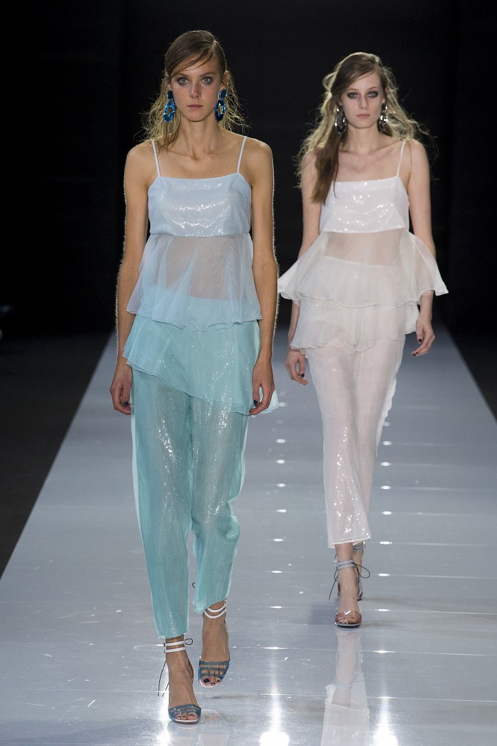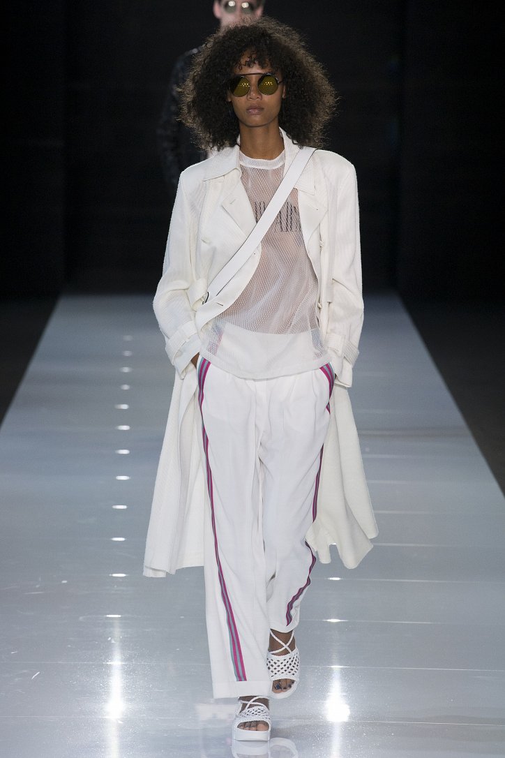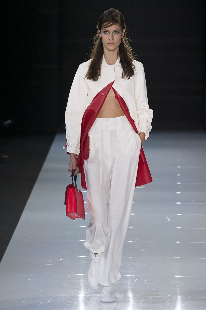 Главным действующим лицом коллекции Emporio Armani весна-лето 2018 стали брюки-чиносы: широкие и со складочками у пояса, с отворотами и манжетами внизу, из хлопка и шифона – дизайнер предлагает носить их в самых разных комбинациях. А дополнить весенне-летний гардероб Армани предлагает трикотажными летними пальто, мини-платьями, прозрачными плащами, юбками и топами, вышитыми бомберами, брючными костюмами, кожаными шортами, остроносыми туфельками и белыми кроссовками.