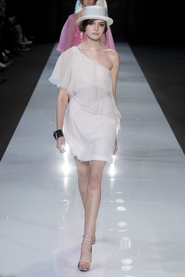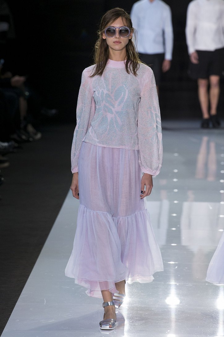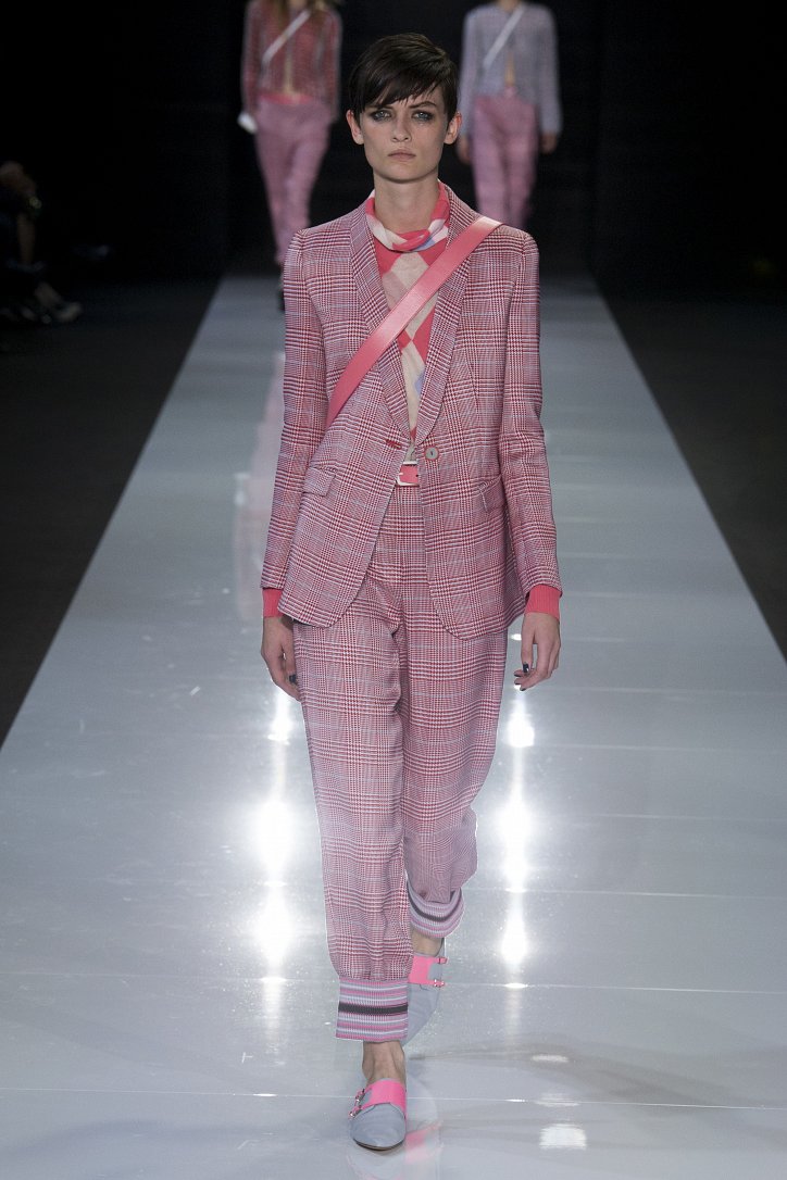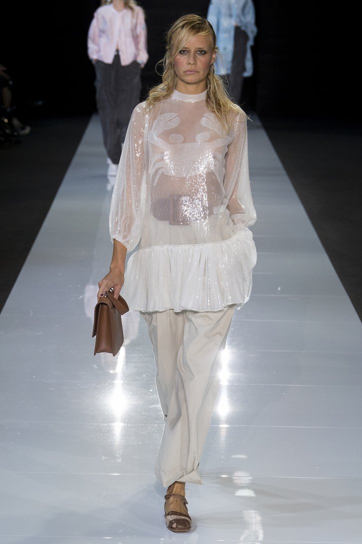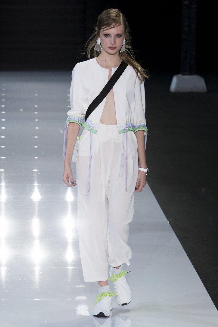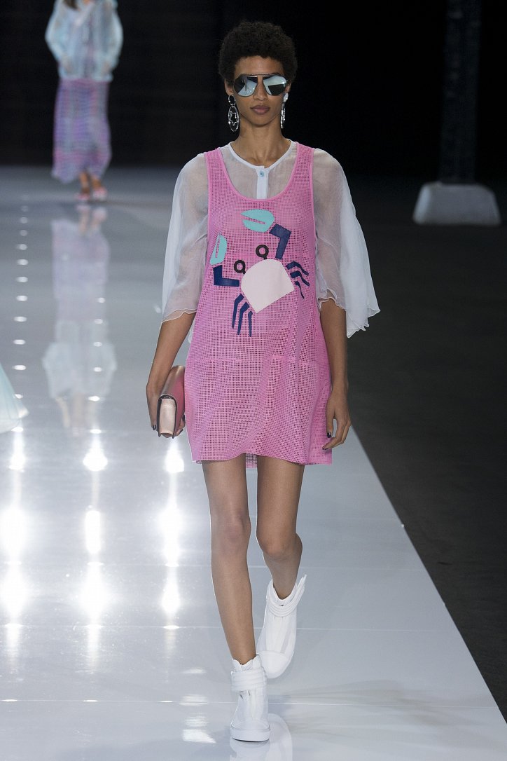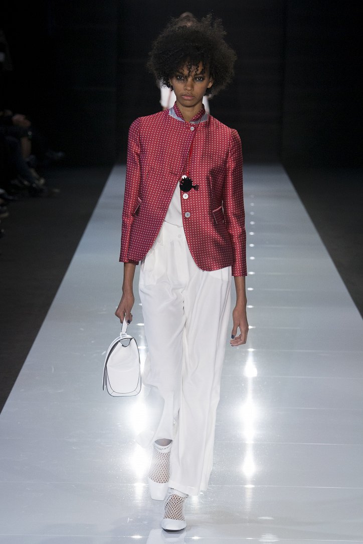 Главным действующим лицом коллекции Emporio Armani весна-лето 2018 стали брюки-чиносы: широкие и со складочками у пояса, с отворотами и манжетами внизу, из хлопка и шифона – дизайнер предлагает носить их в самых разных комбинациях. А дополнить весенне-летний гардероб Армани предлагает трикотажными летними пальто, мини-платьями, прозрачными плащами, юбками и топами, вышитыми бомберами, брючными костюмами, кожаными шортами, остроносыми туфельками и белыми кроссовками.