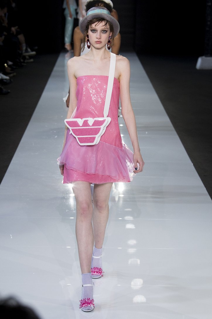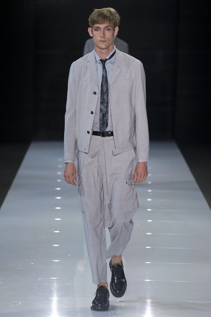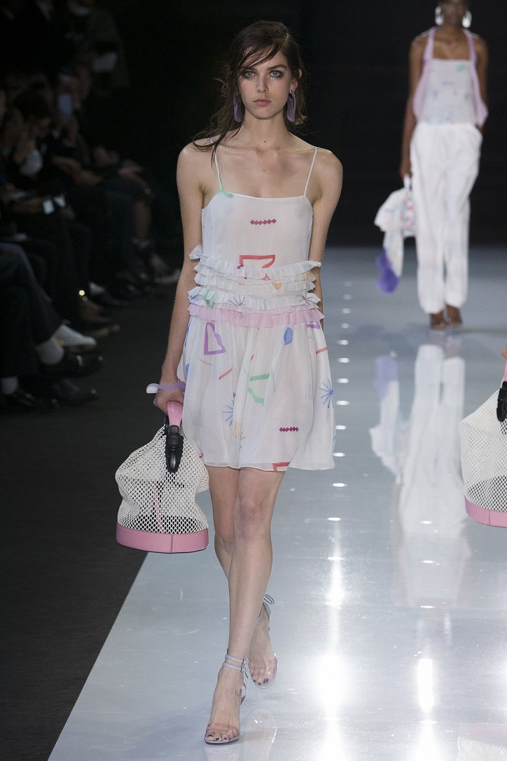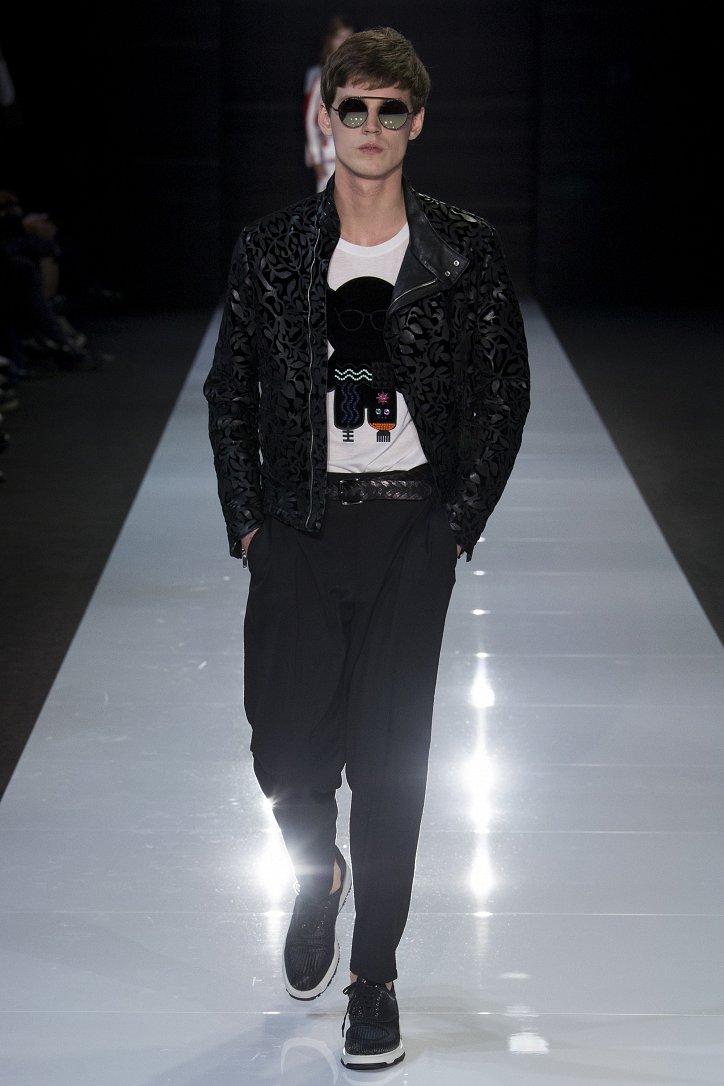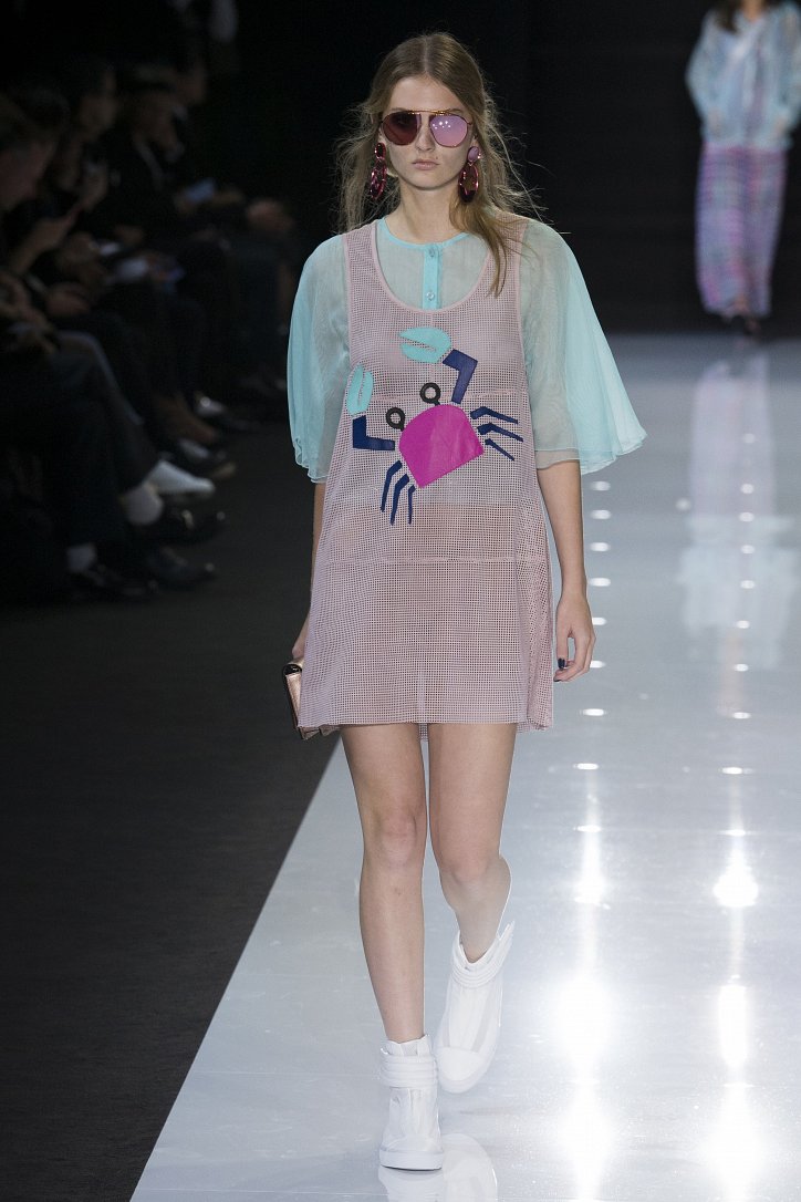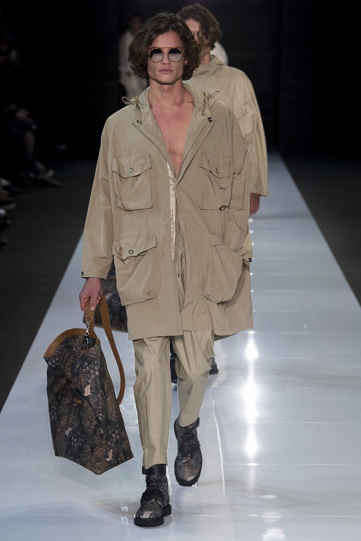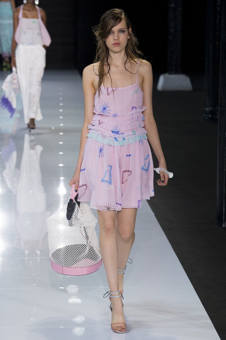 Главным действующим лицом коллекции Emporio Armani весна-лето 2018 стали брюки-чиносы: широкие и со складочками у пояса, с отворотами и манжетами внизу, из хлопка и шифона – дизайнер предлагает носить их в самых разных комбинациях. А дополнить весенне-летний гардероб Армани предлагает трикотажными летними пальто, мини-платьями, прозрачными плащами, юбками и топами, вышитыми бомберами, брючными костюмами, кожаными шортами, остроносыми туфельками и белыми кроссовками.