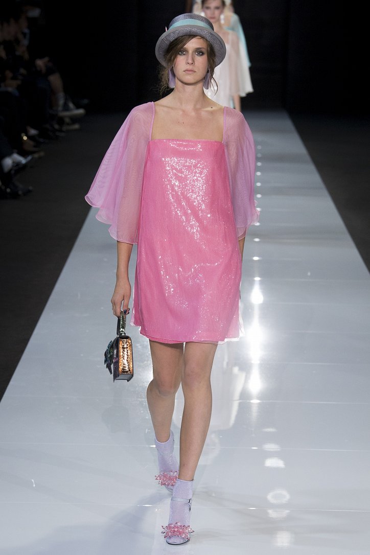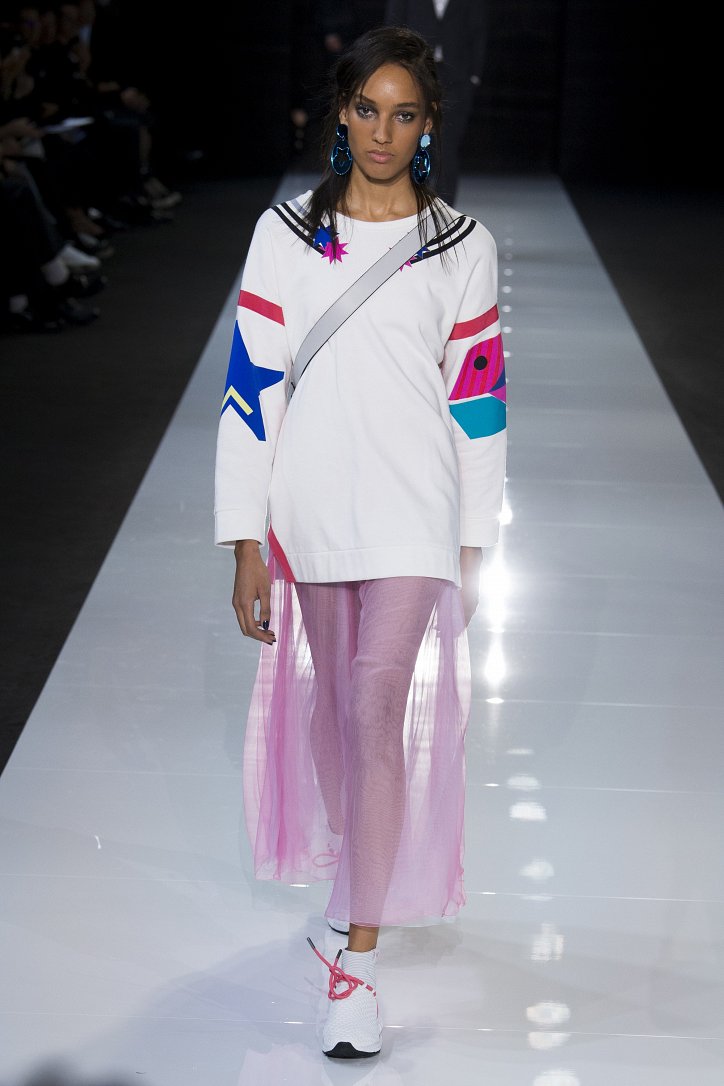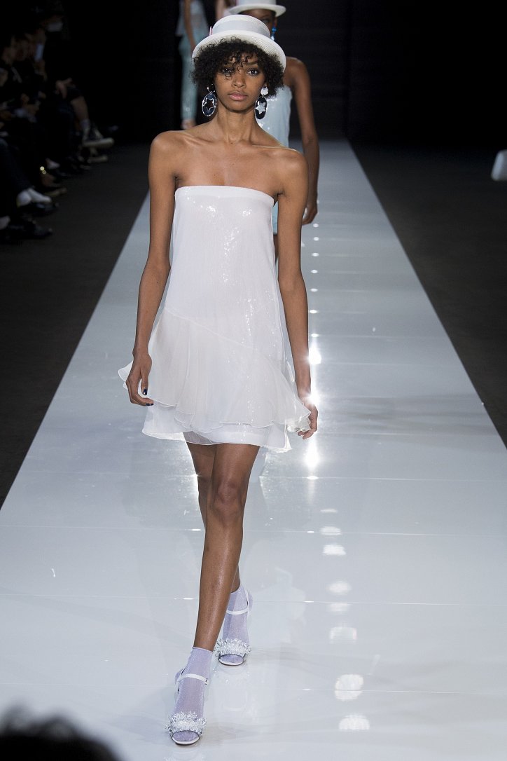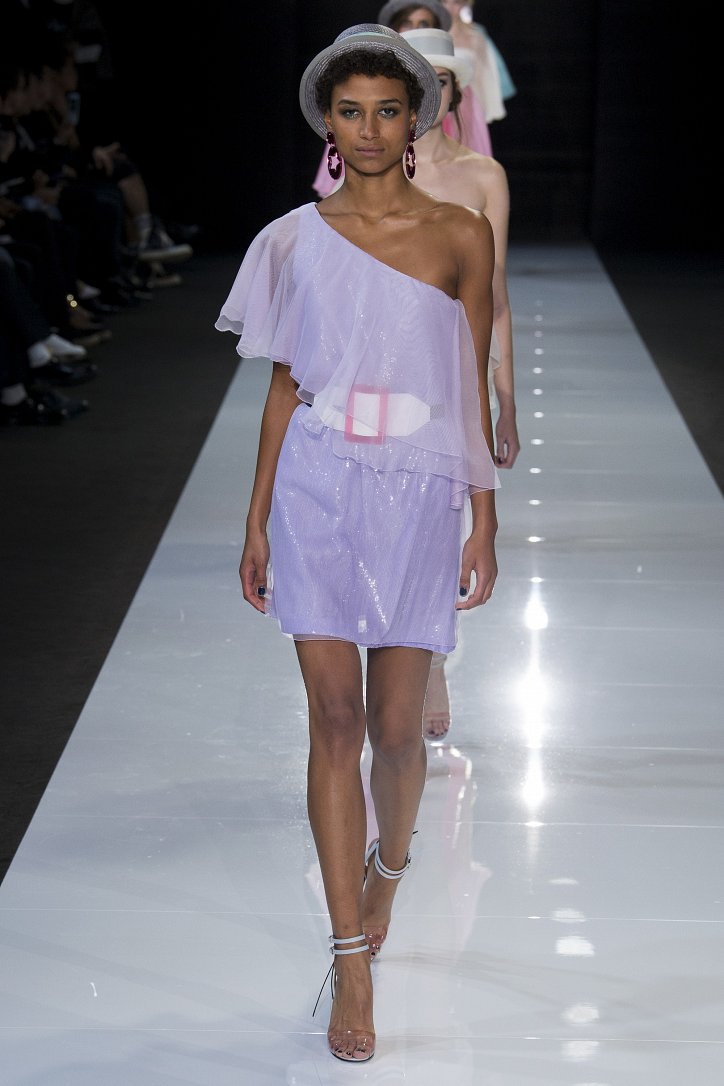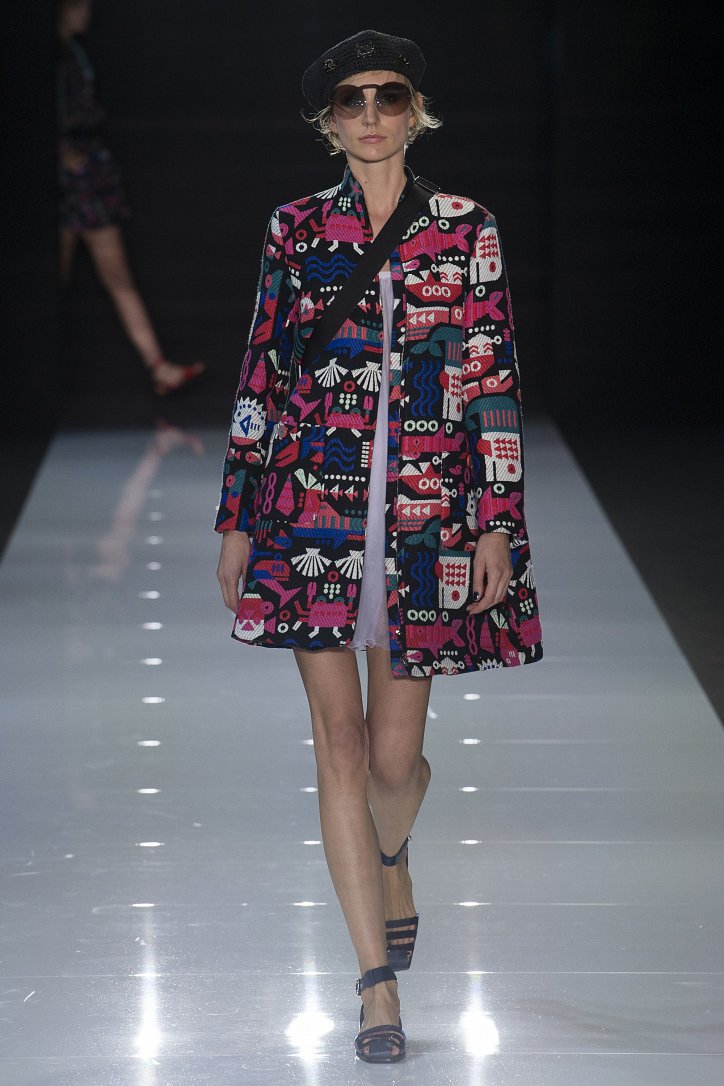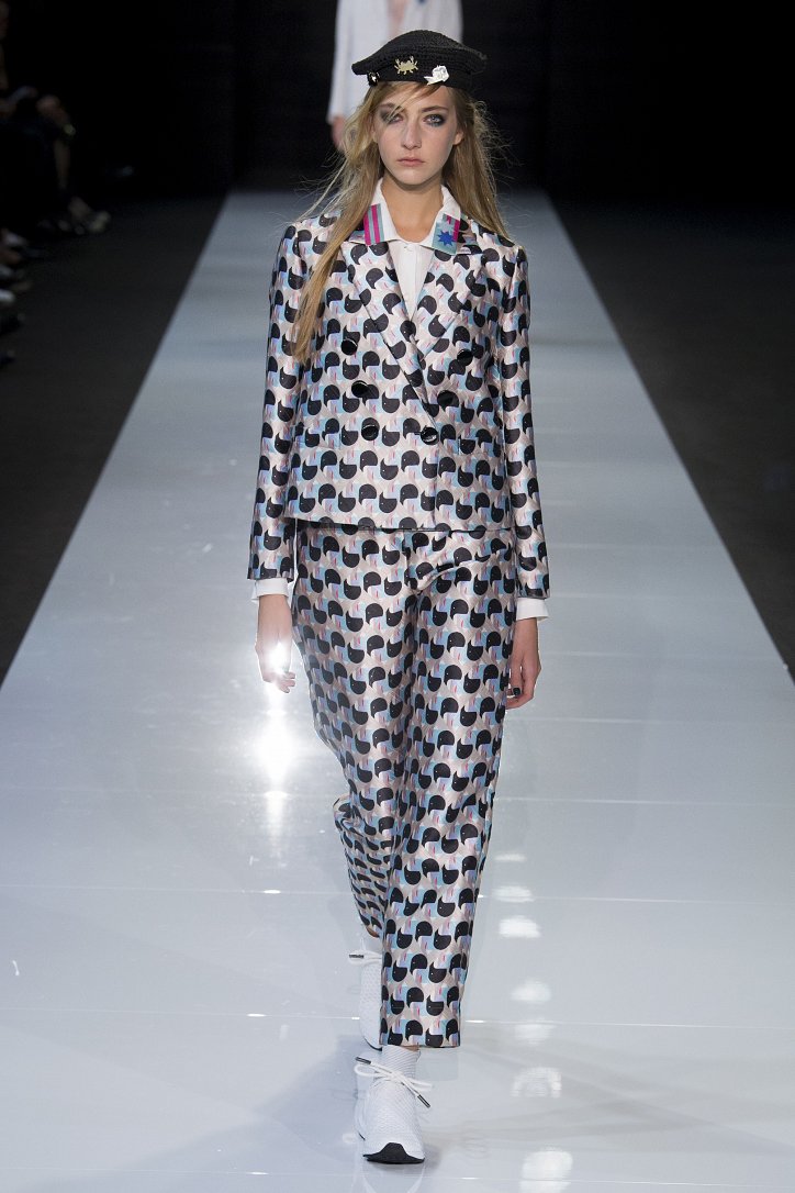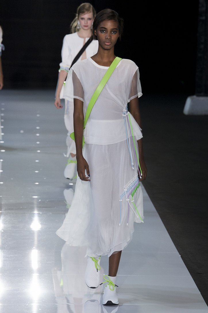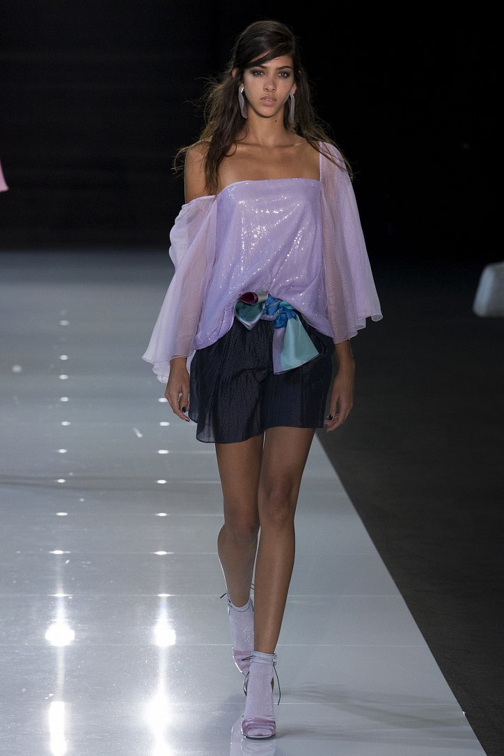 Главным действующим лицом коллекции Emporio Armani весна-лето 2018 стали брюки-чиносы: широкие и со складочками у пояса, с отворотами и манжетами внизу, из хлопка и шифона – дизайнер предлагает носить их в самых разных комбинациях. А дополнить весенне-летний гардероб Армани предлагает трикотажными летними пальто, мини-платьями, прозрачными плащами, юбками и топами, вышитыми бомберами, брючными костюмами, кожаными шортами, остроносыми туфельками и белыми кроссовками.
