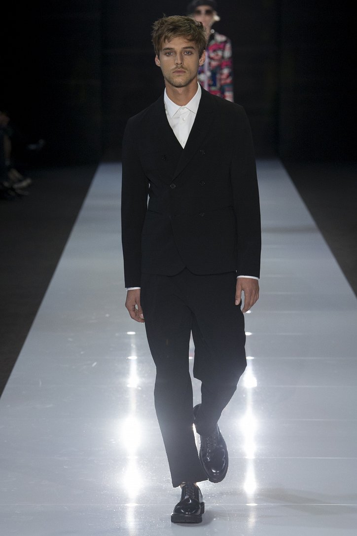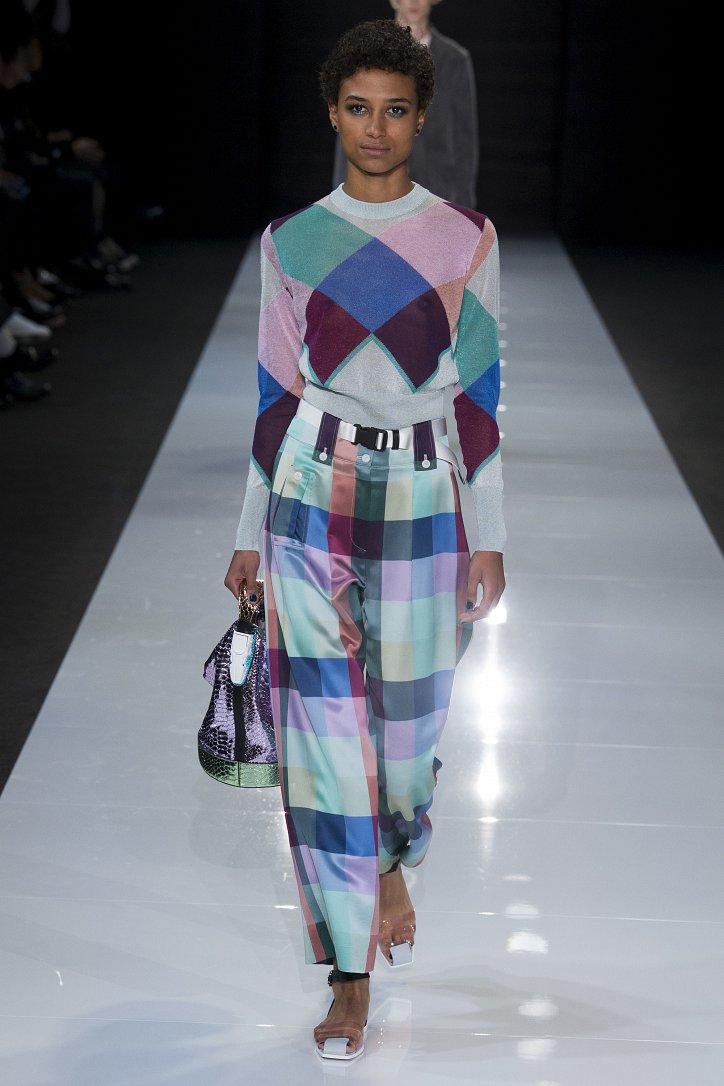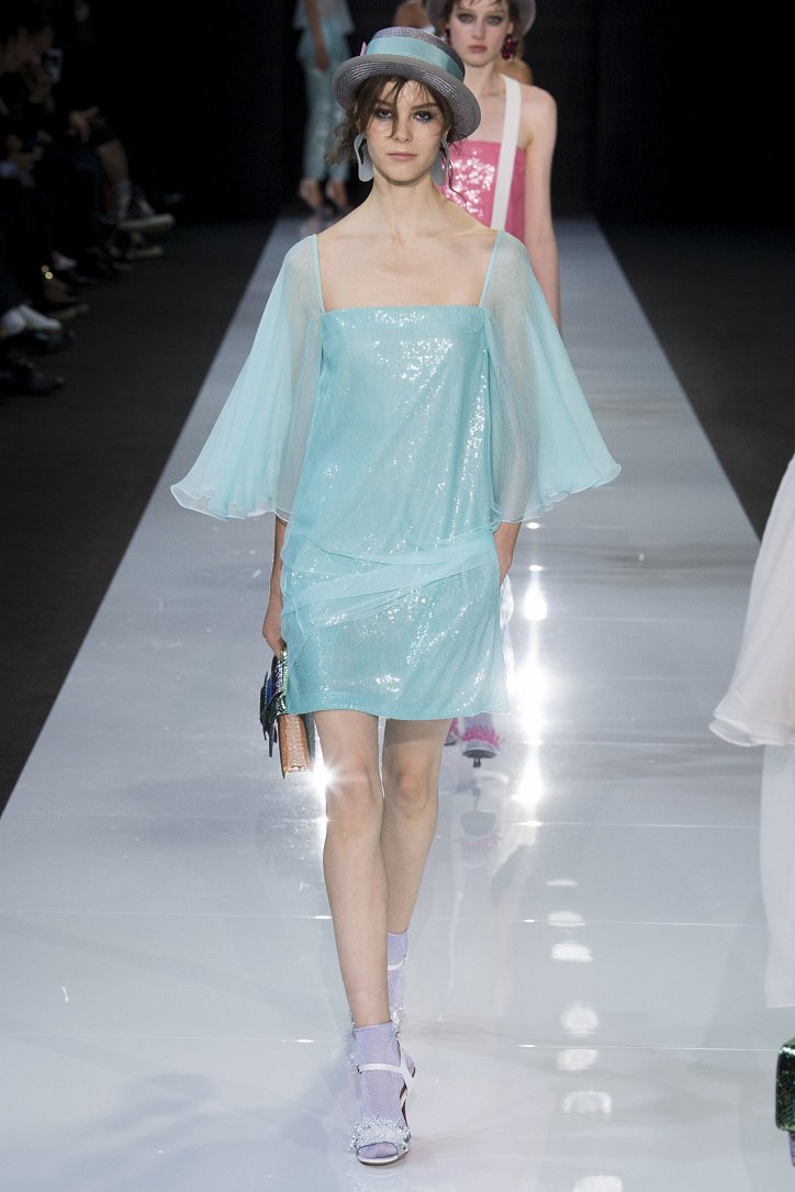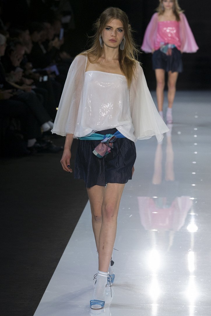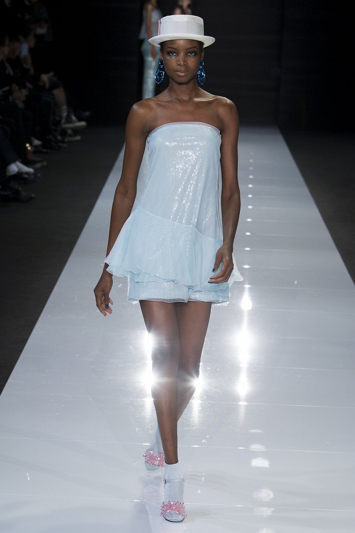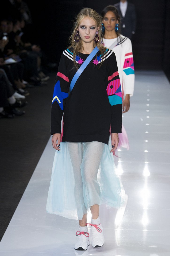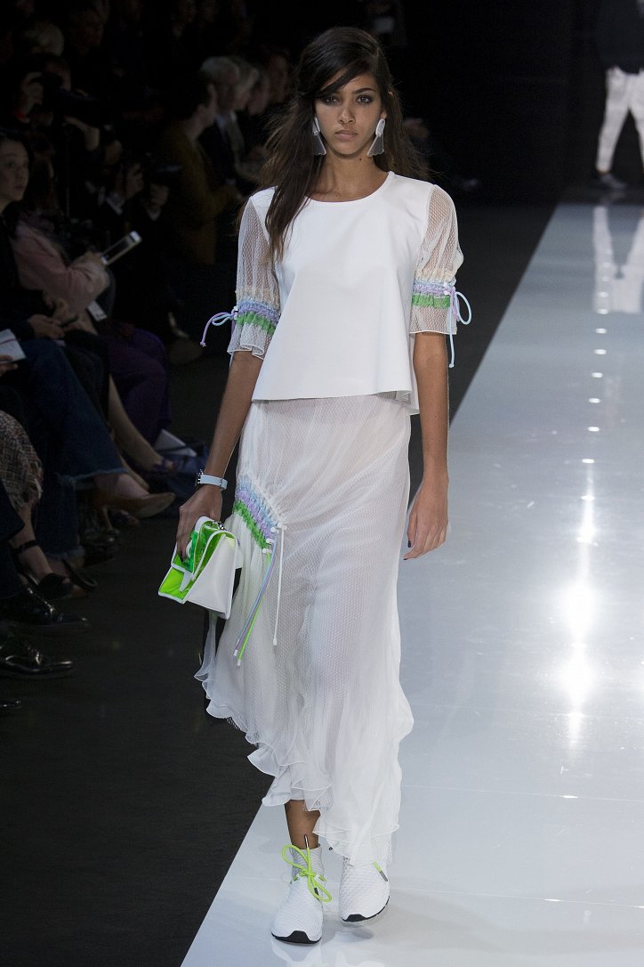 Главным действующим лицом коллекции Emporio Armani весна-лето 2018 стали брюки-чиносы: широкие и со складочками у пояса, с отворотами и манжетами внизу, из хлопка и шифона – дизайнер предлагает носить их в самых разных комбинациях. А дополнить весенне-летний гардероб Армани предлагает трикотажными летними пальто, мини-платьями, прозрачными плащами, юбками и топами, вышитыми бомберами, брючными костюмами, кожаными шортами, остроносыми туфельками и белыми кроссовками.