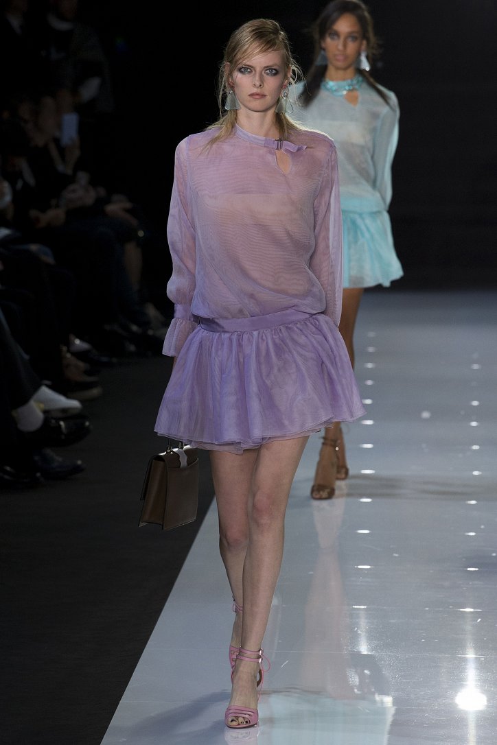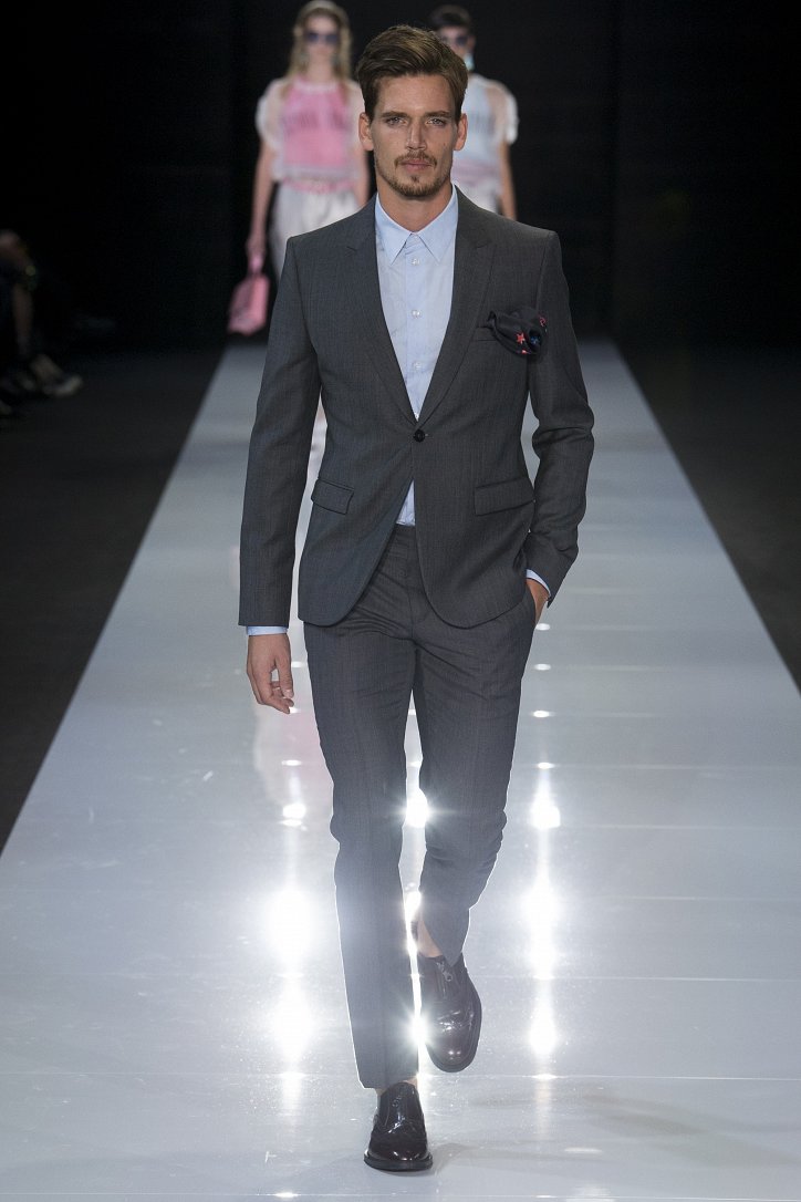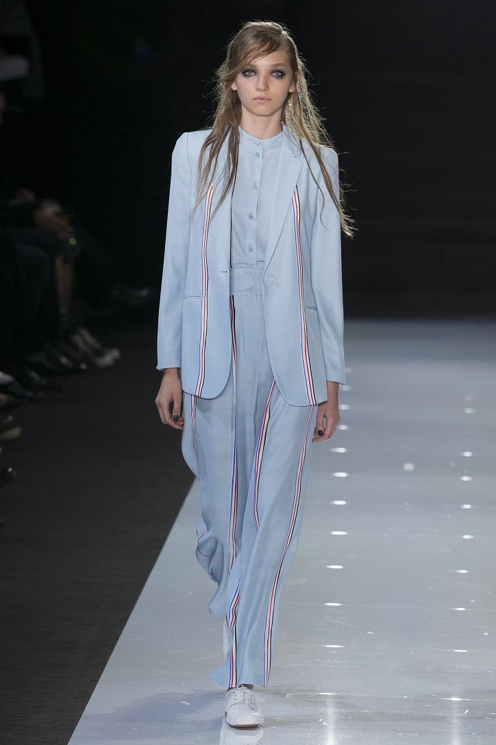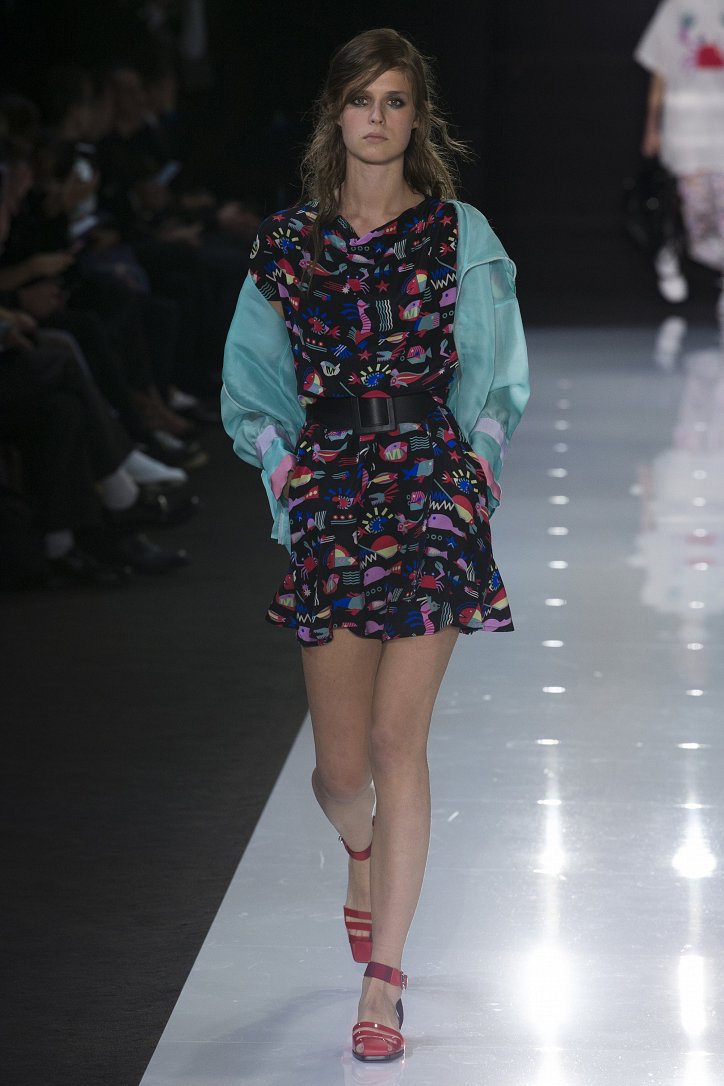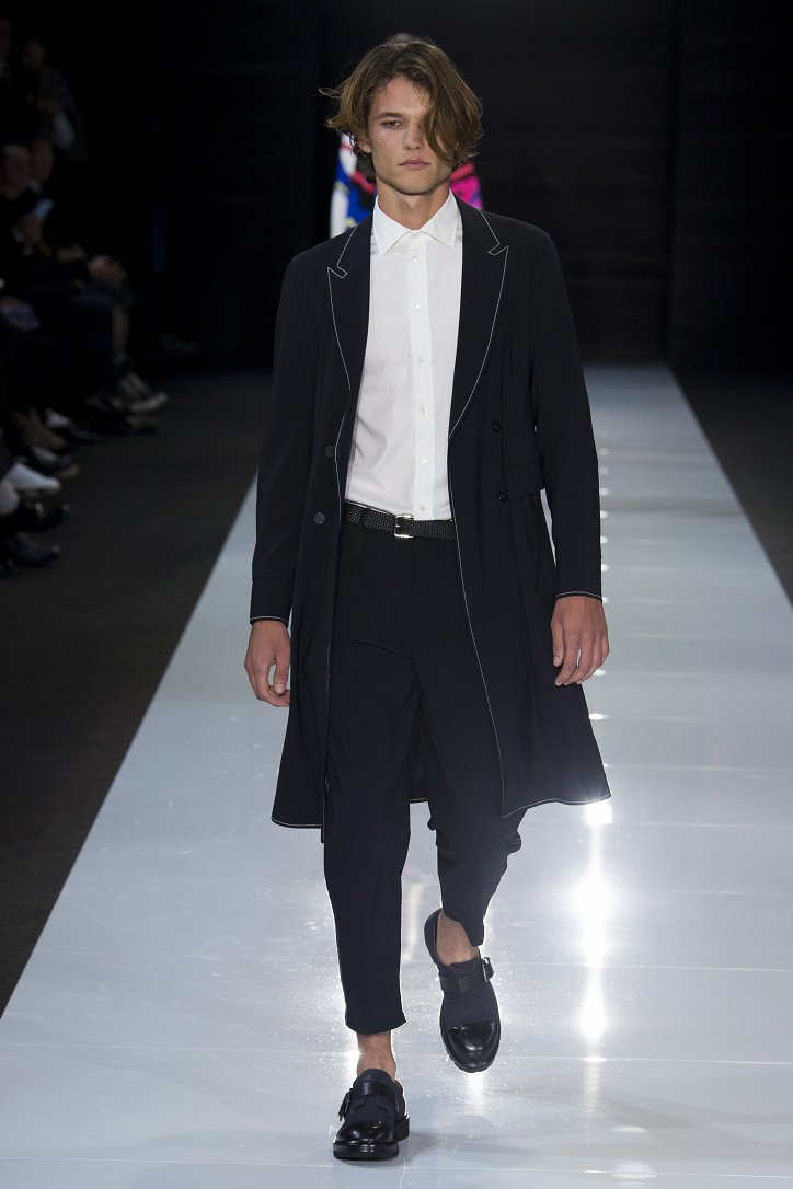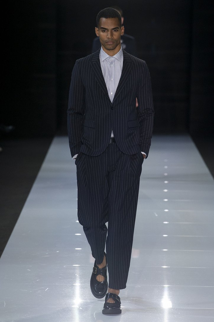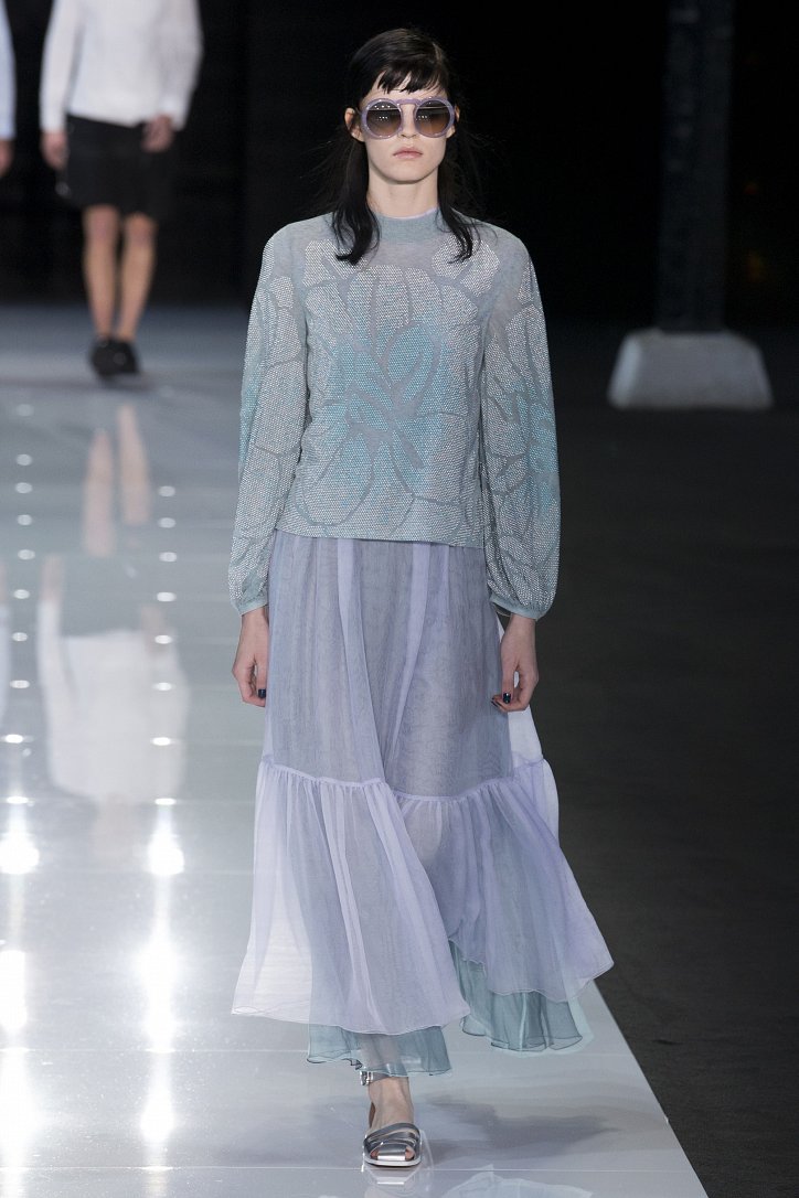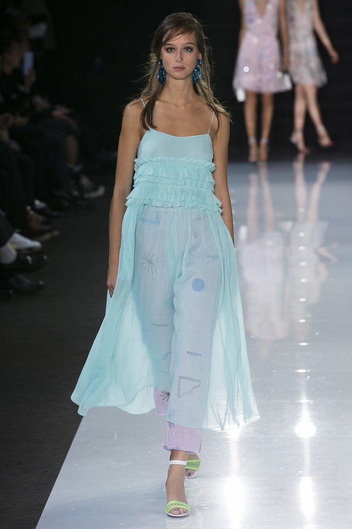 Главным действующим лицом коллекции Emporio Armani весна-лето 2018 стали брюки-чиносы: широкие и со складочками у пояса, с отворотами и манжетами внизу, из хлопка и шифона – дизайнер предлагает носить их в самых разных комбинациях. А дополнить весенне-летний гардероб Армани предлагает трикотажными летними пальто, мини-платьями, прозрачными плащами, юбками и топами, вышитыми бомберами, брючными костюмами, кожаными шортами, остроносыми туфельками и белыми кроссовками.