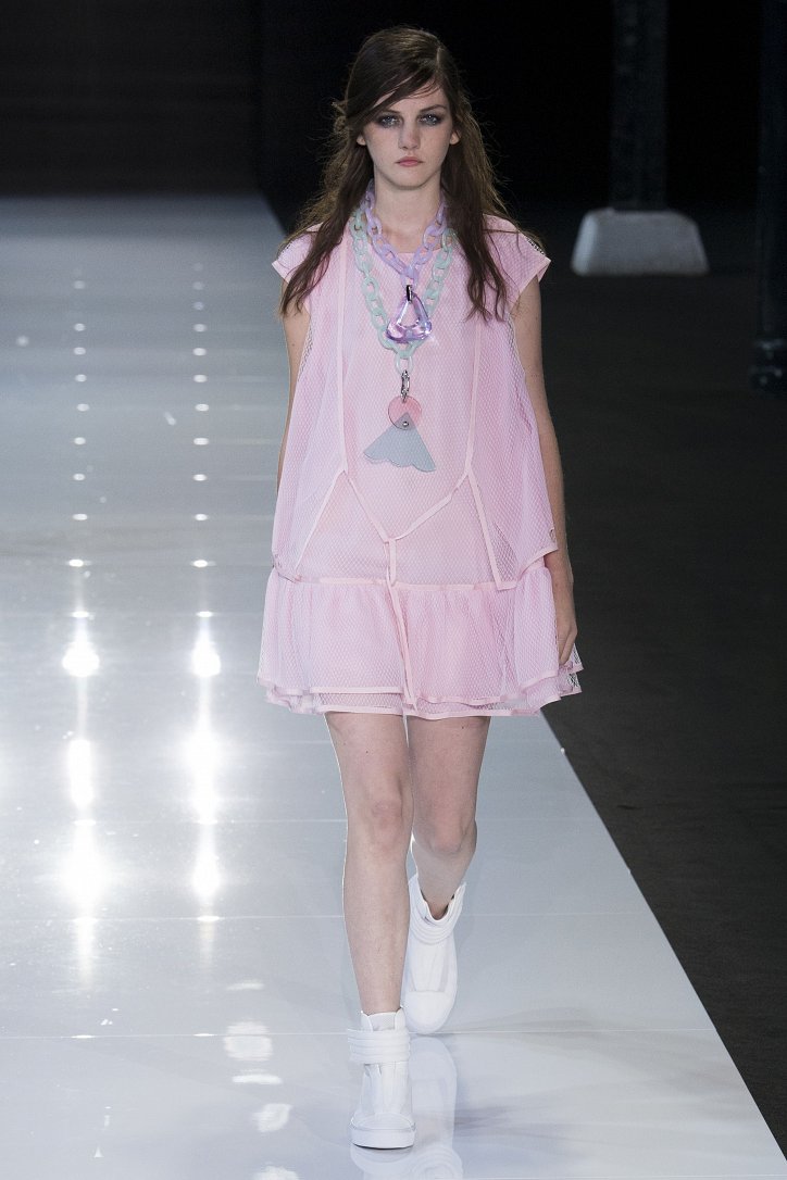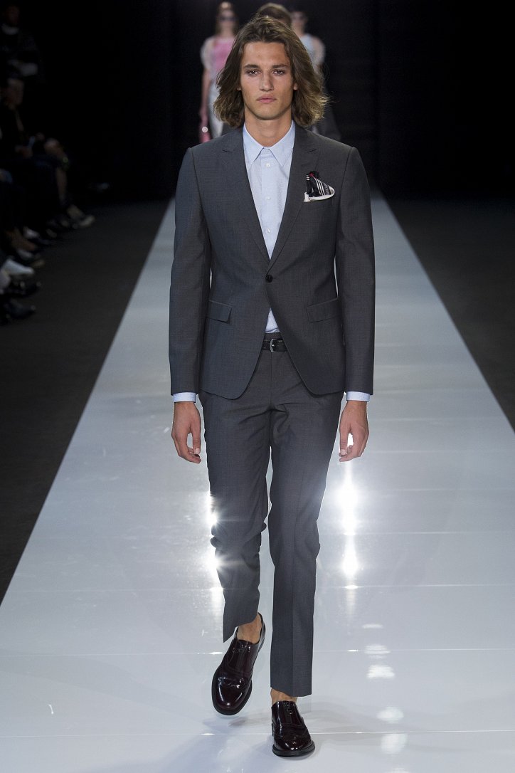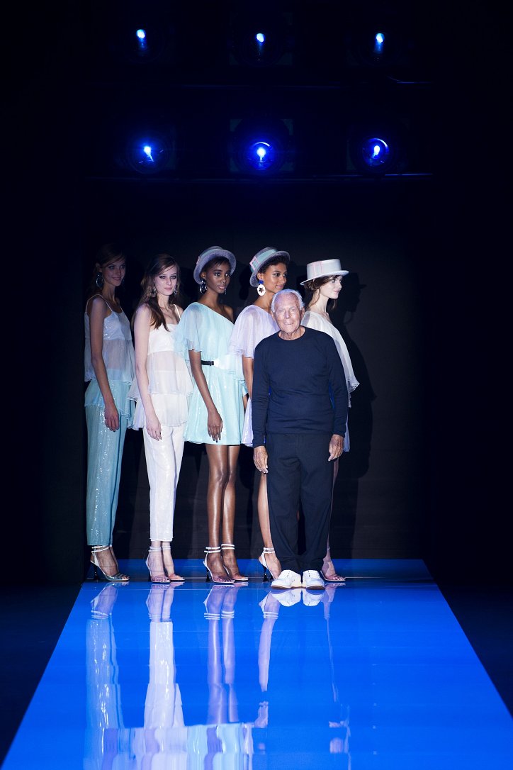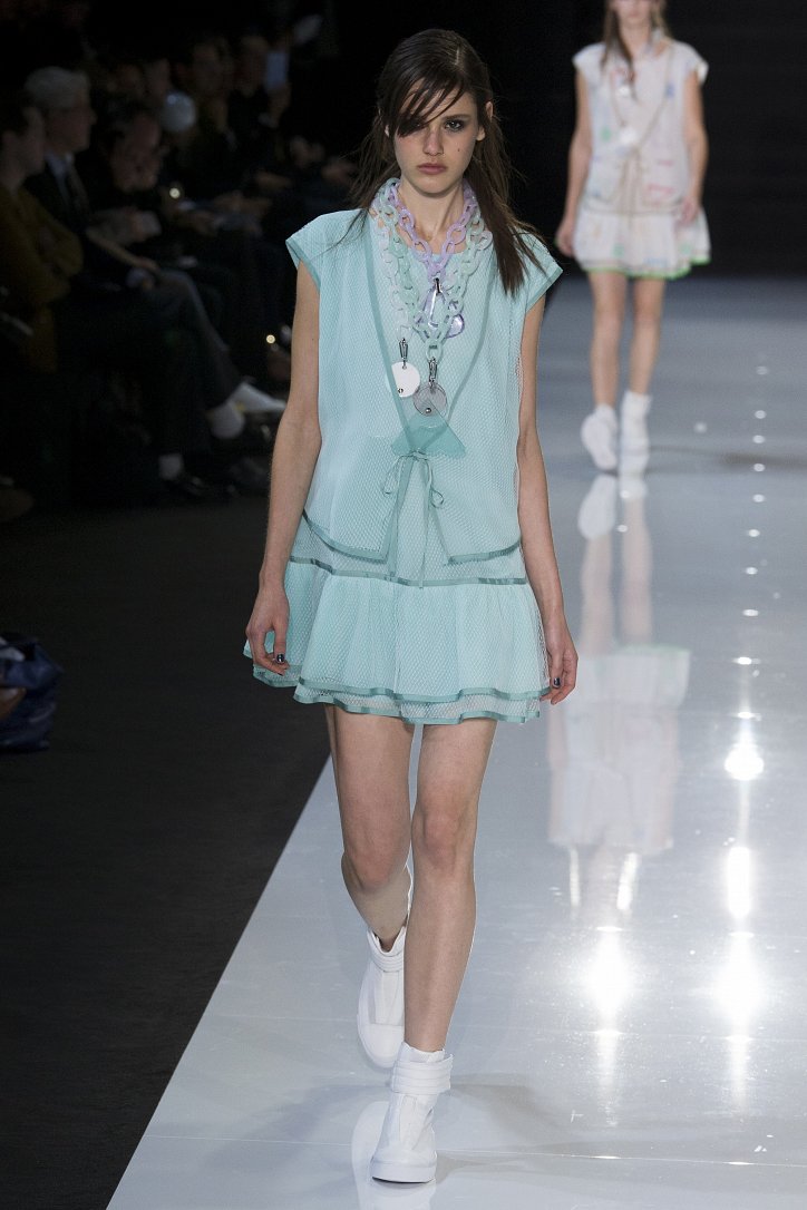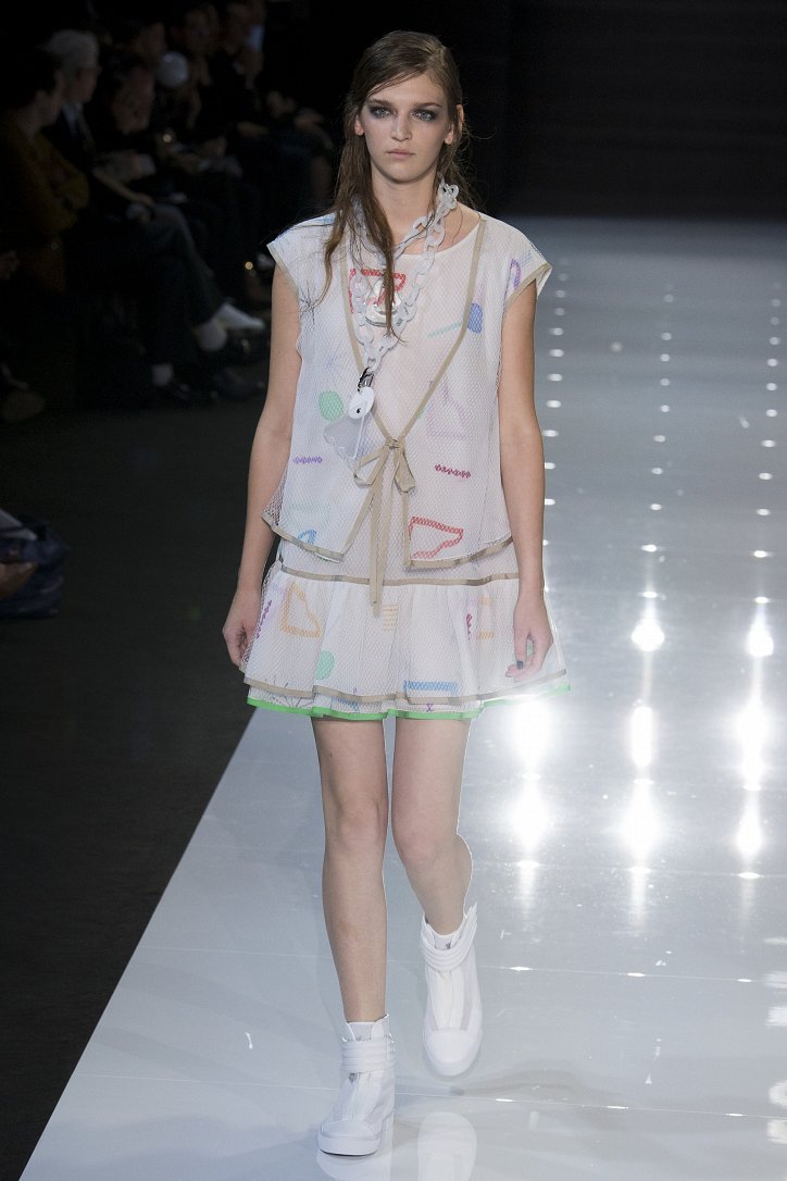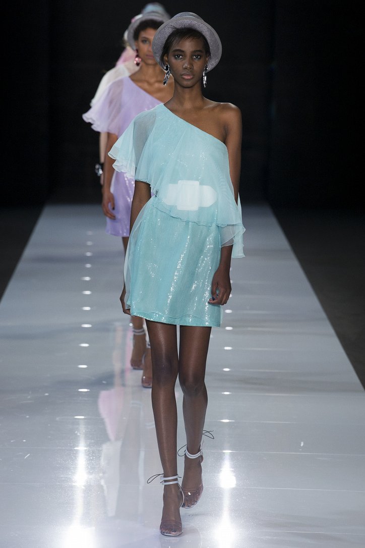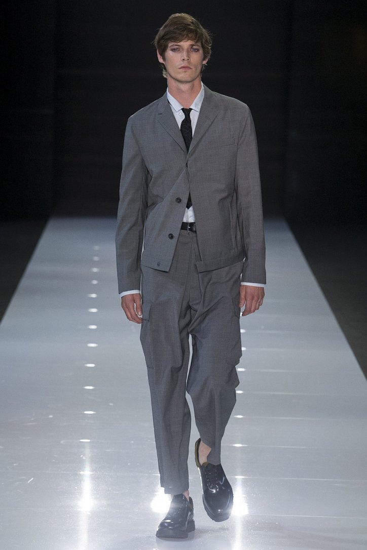 Главным действующим лицом коллекции Emporio Armani весна-лето 2018 стали брюки-чиносы: широкие и со складочками у пояса, с отворотами и манжетами внизу, из хлопка и шифона – дизайнер предлагает носить их в самых разных комбинациях. А дополнить весенне-летний гардероб Армани предлагает трикотажными летними пальто, мини-платьями, прозрачными плащами, юбками и топами, вышитыми бомберами, брючными костюмами, кожаными шортами, остроносыми туфельками и белыми кроссовками.