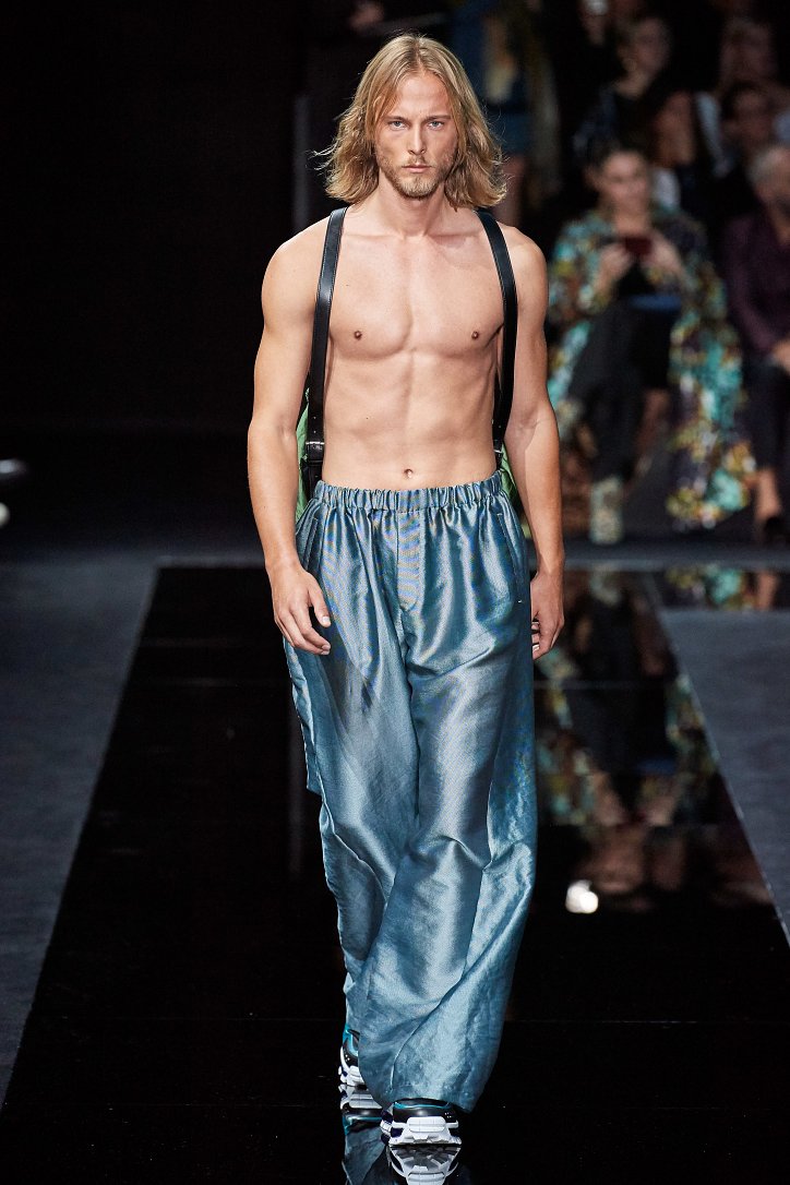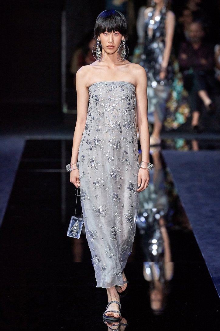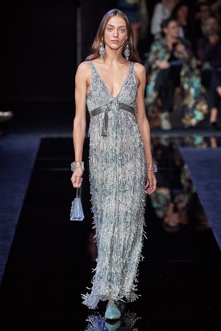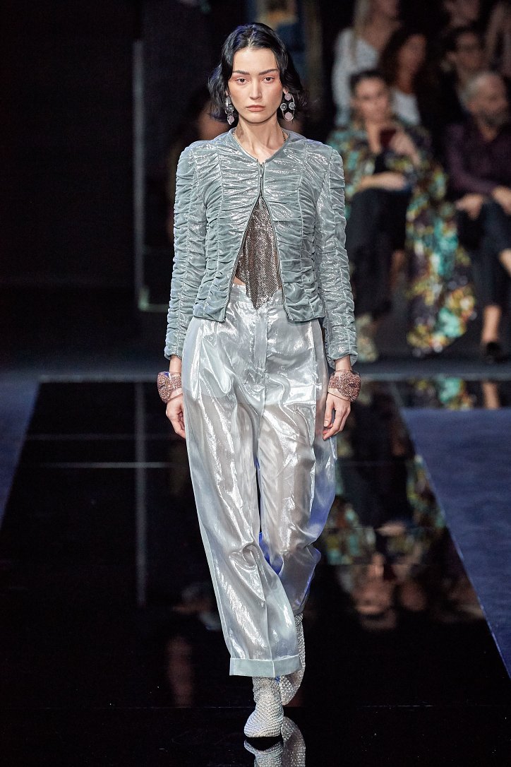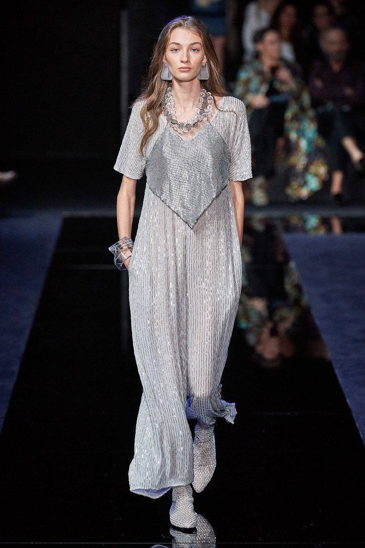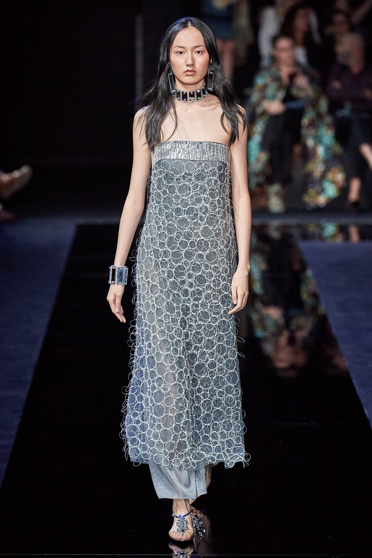 Когда же на небе появилась луна, пудровый, фисташковый и оттенки голубого сменились призрачно-серебристым – и на подиуме появились «русалки» в вечерних платьях, покрытых «чешуей» из пайеток, и мерцающих брючных костюмах в серых тонах.