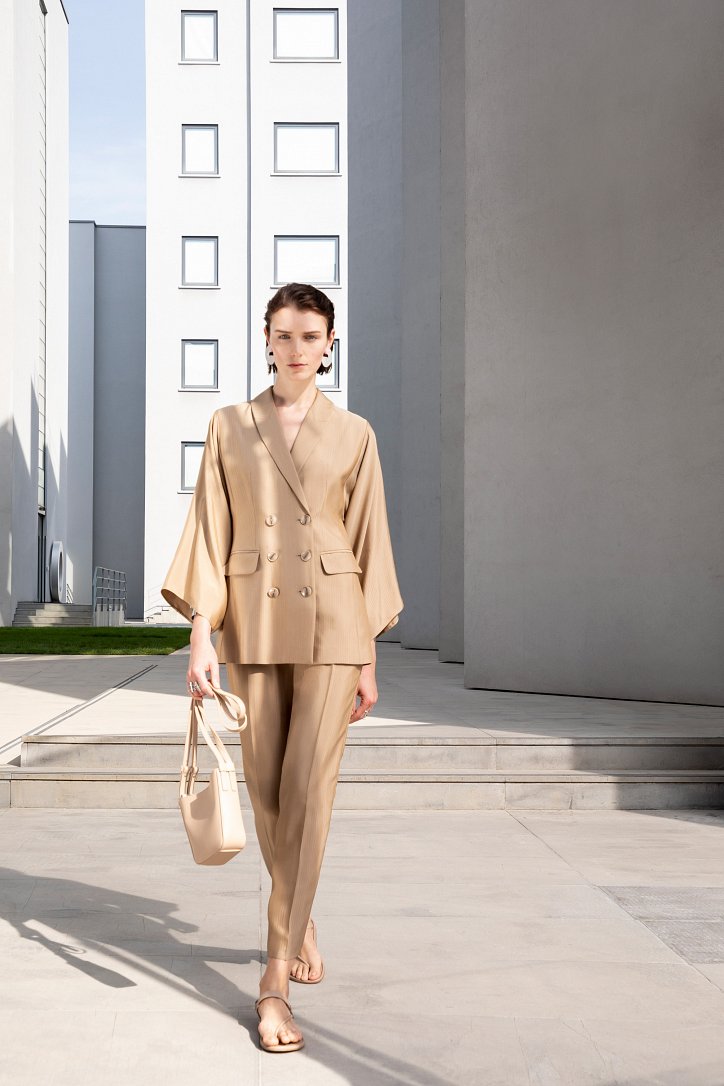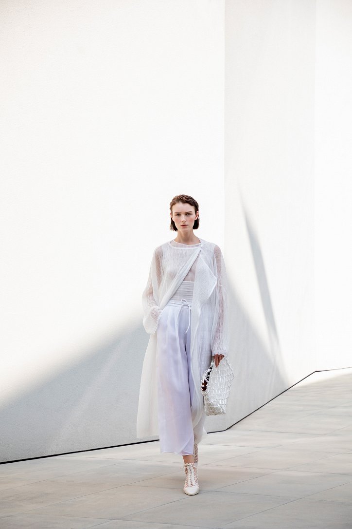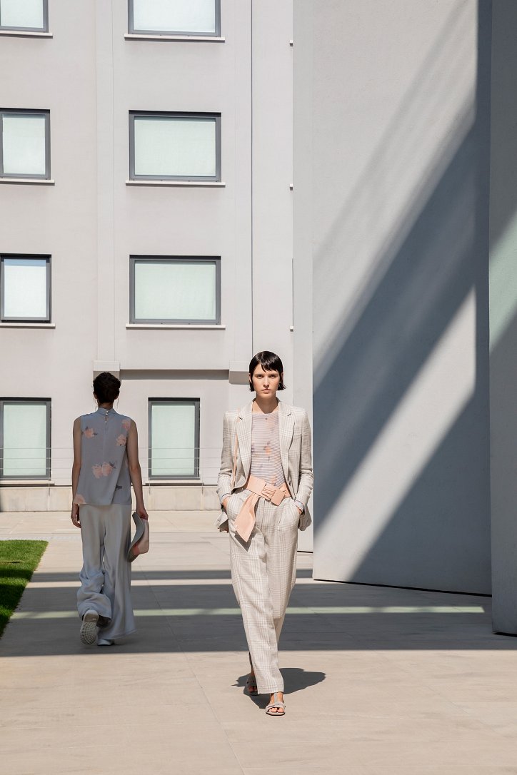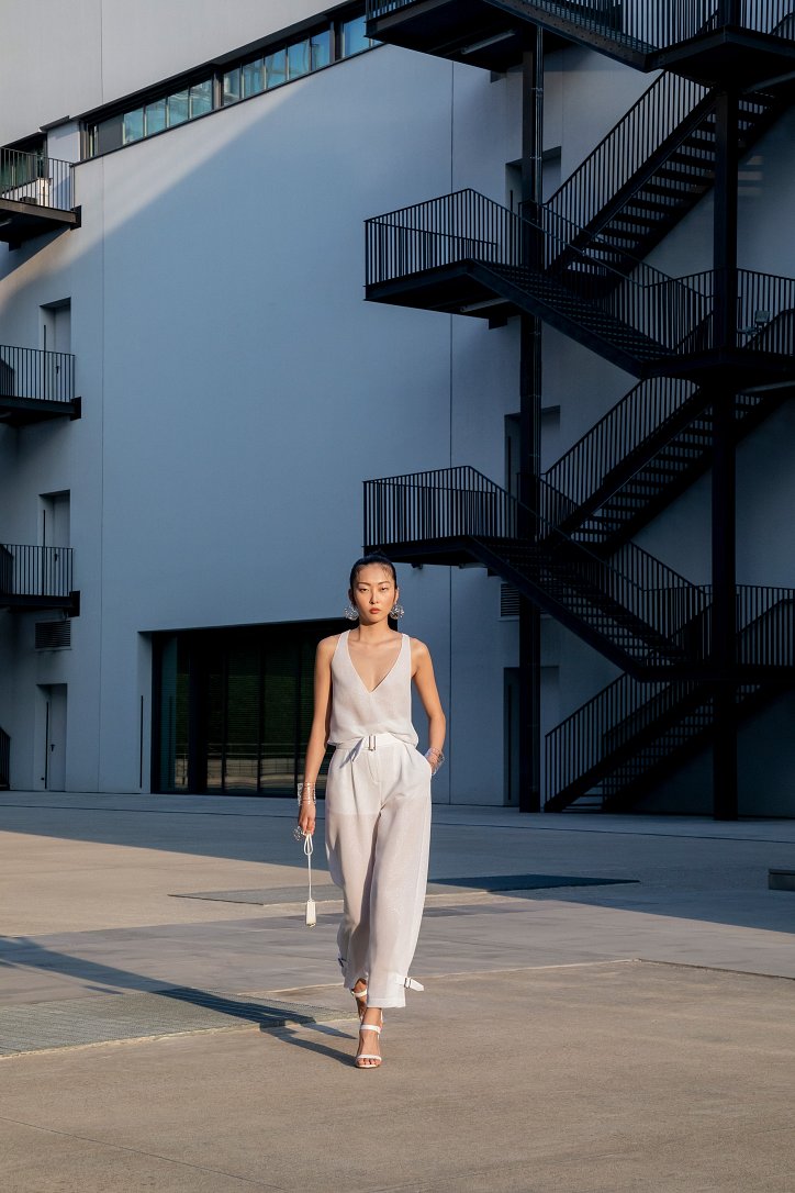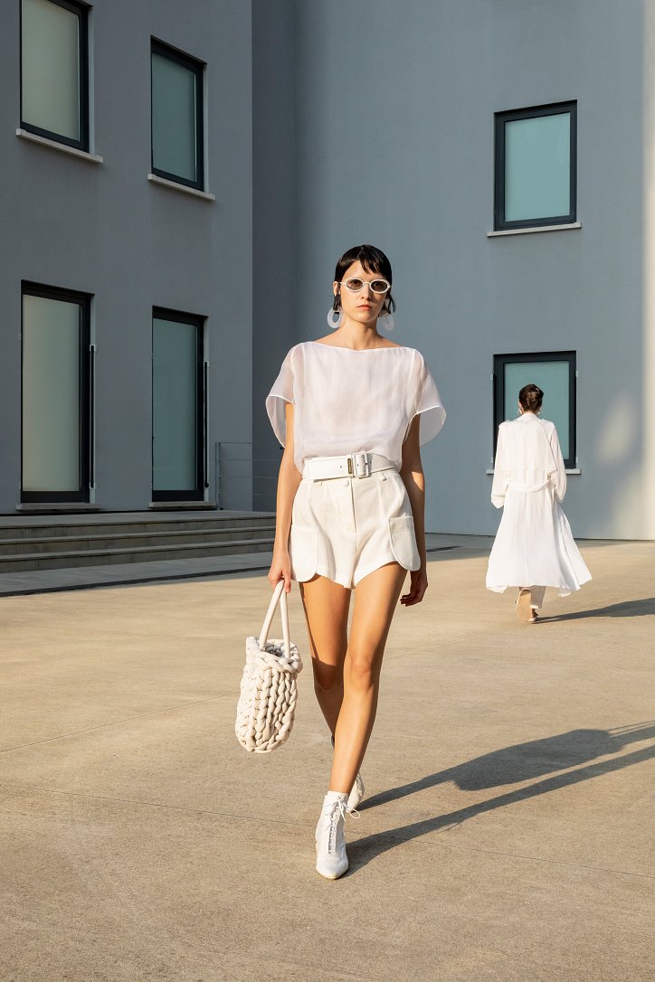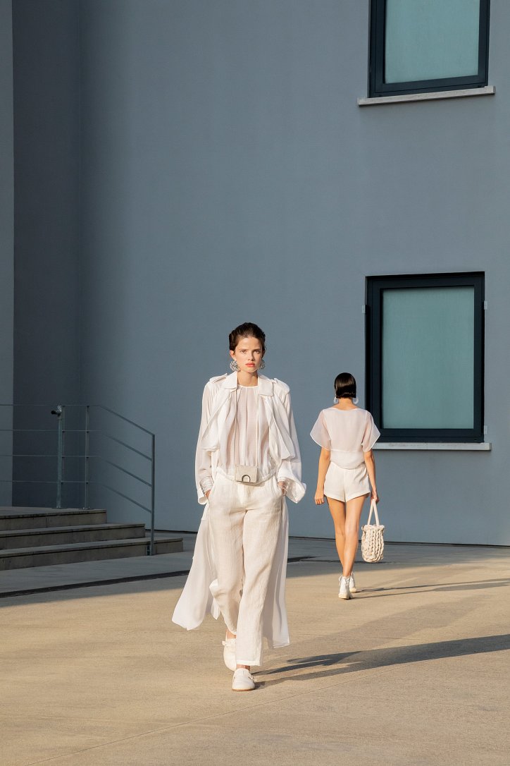 Брючные костюмы и летящие тренчи, широкие брюки на высокой талии и свободные шорты, платья и комбинезоны – все было очень светлое, легкое и свободное.