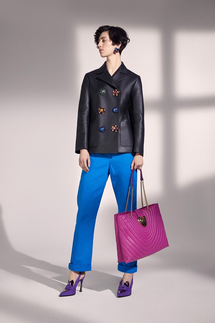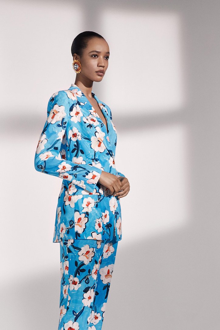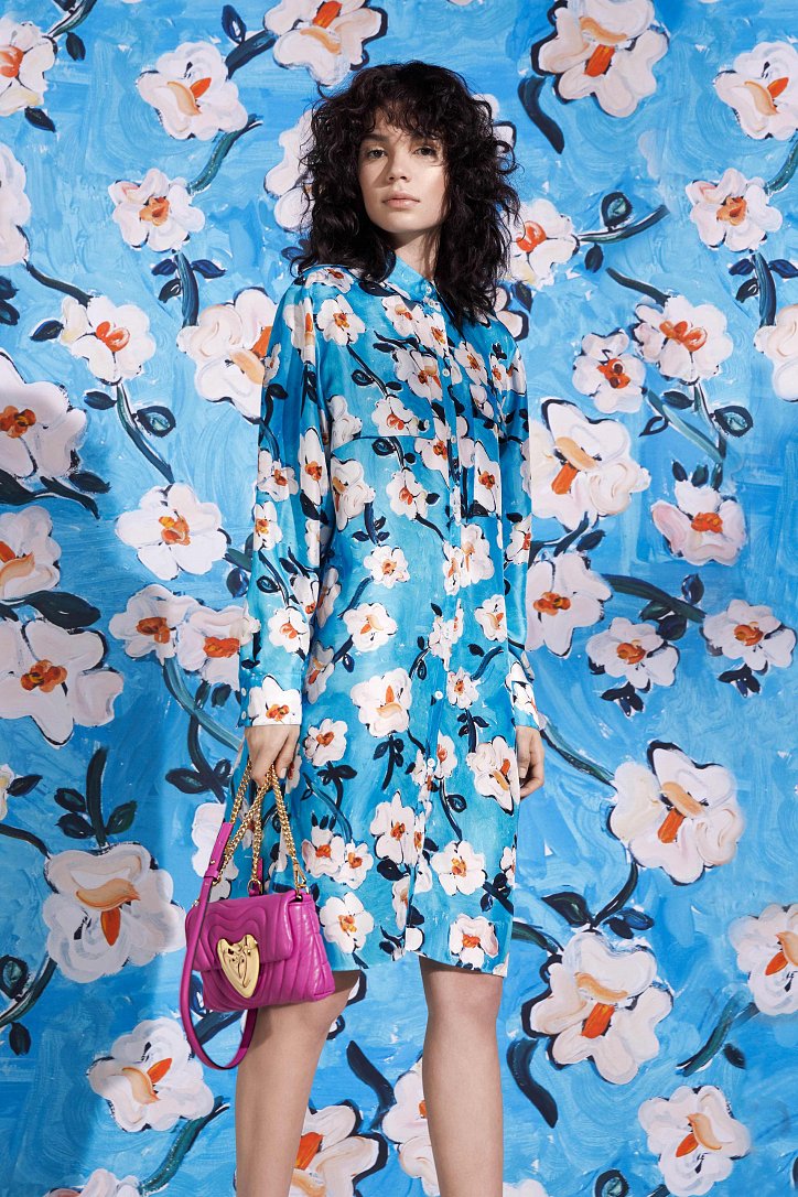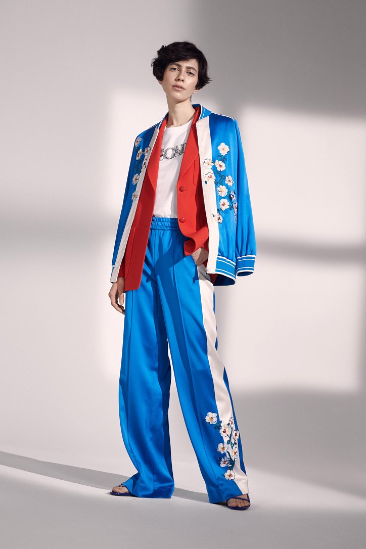 Белые цветы на ярко-голубом и красном фоне рассыпались по платьям и брючным комплектам, жакетам и юбкам; на черном кожаном комплекте из косухи и мини-юбки появились яркие цветочные аппликации и даже спортивный костюм украсился цветочной вышивкой!