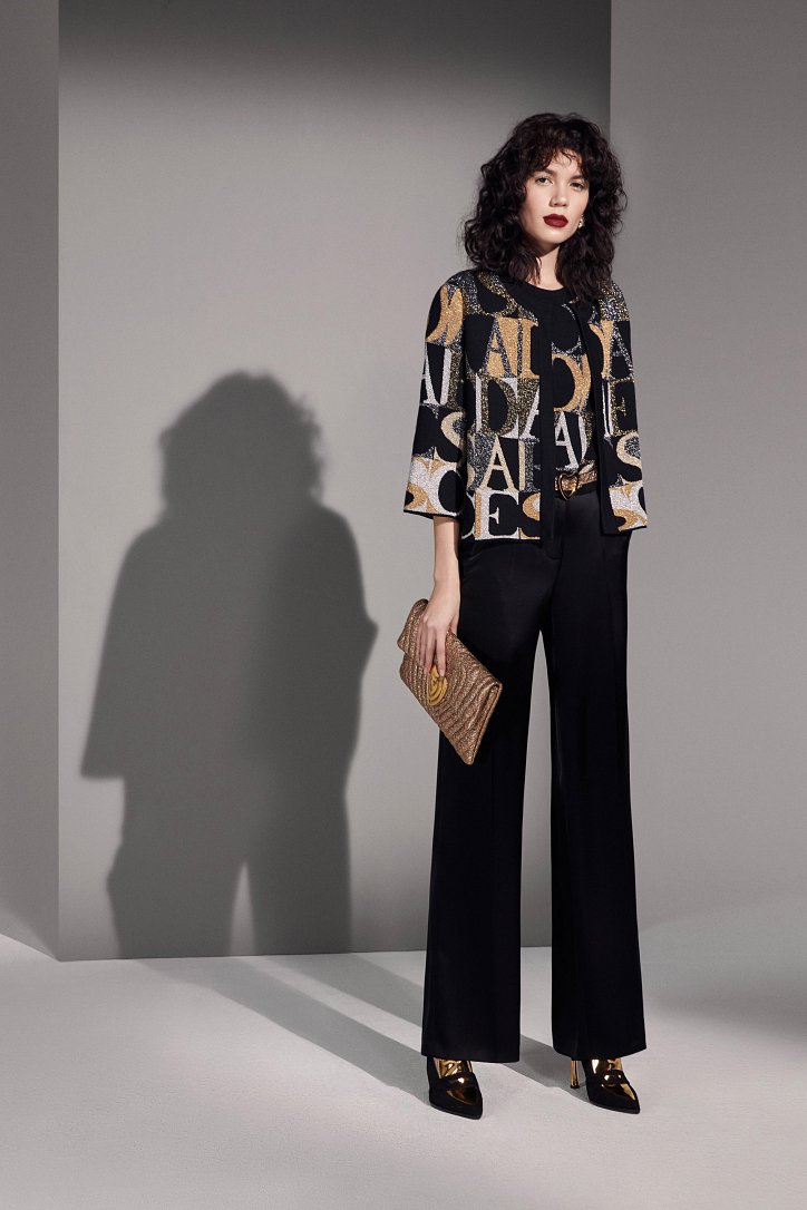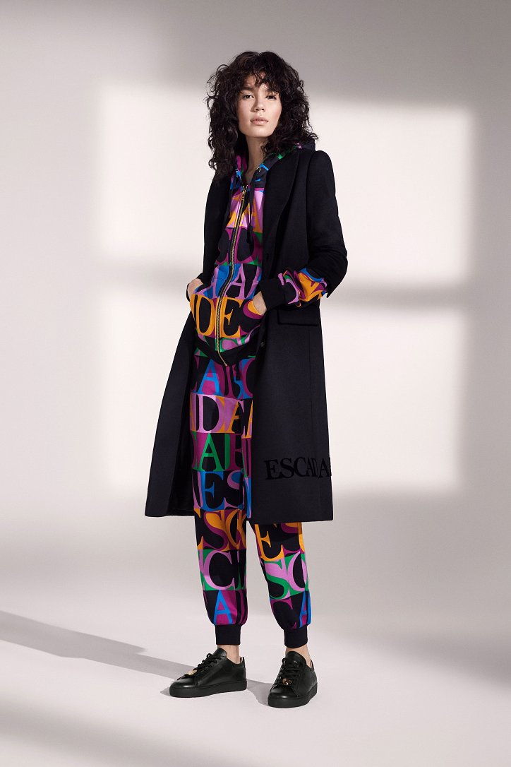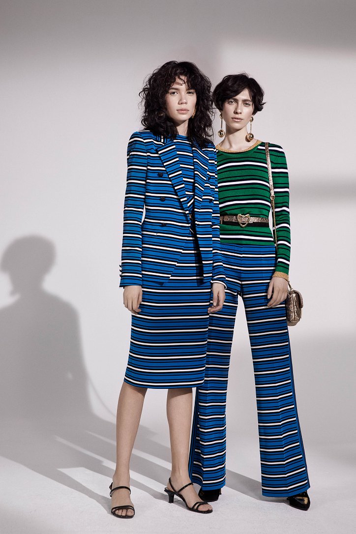 Ярко выглядела и полоска с основой из синего и зеленого цвета. Такие полосатые наряды явно сделают офисные будни менее сдержанными и строгими. А чтобы никто не усомнился, что все это – Escada, некоторые из моделей дизайнер «подписал», используя в качестве принта логотип бренда.