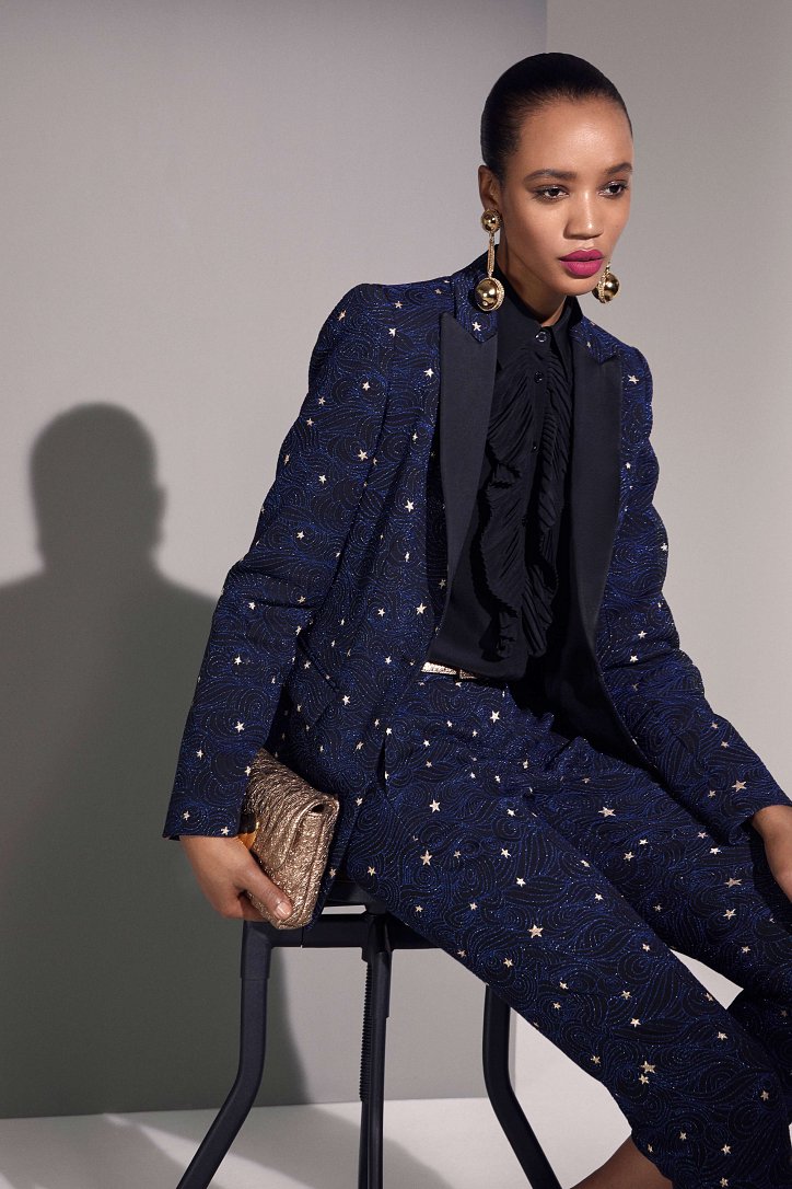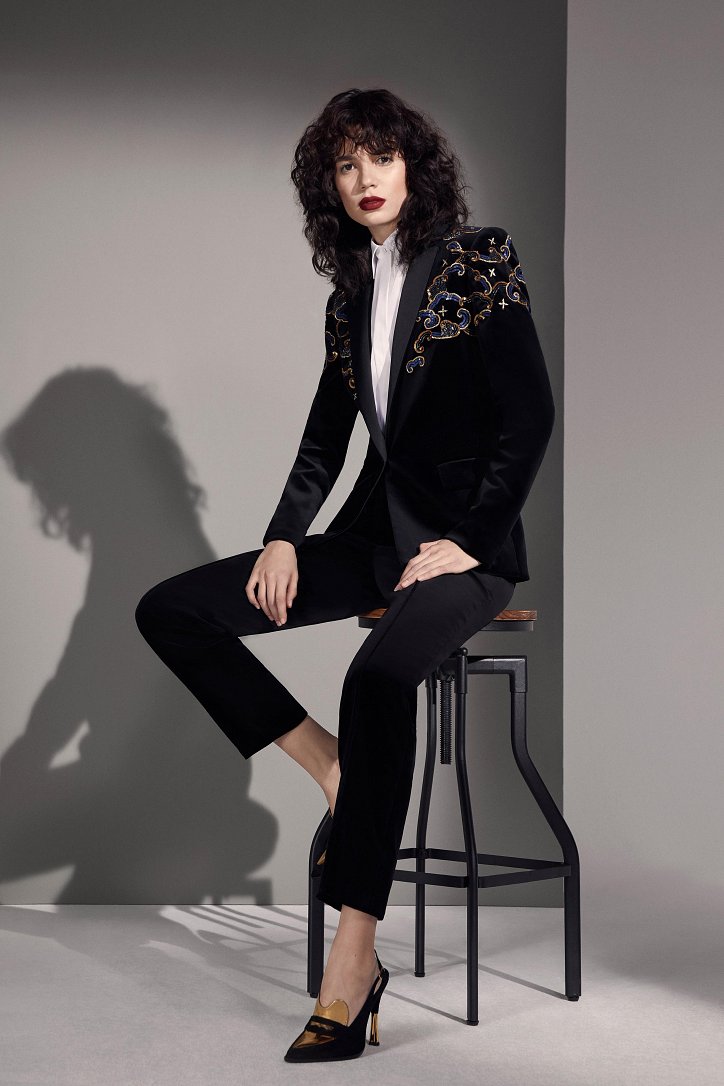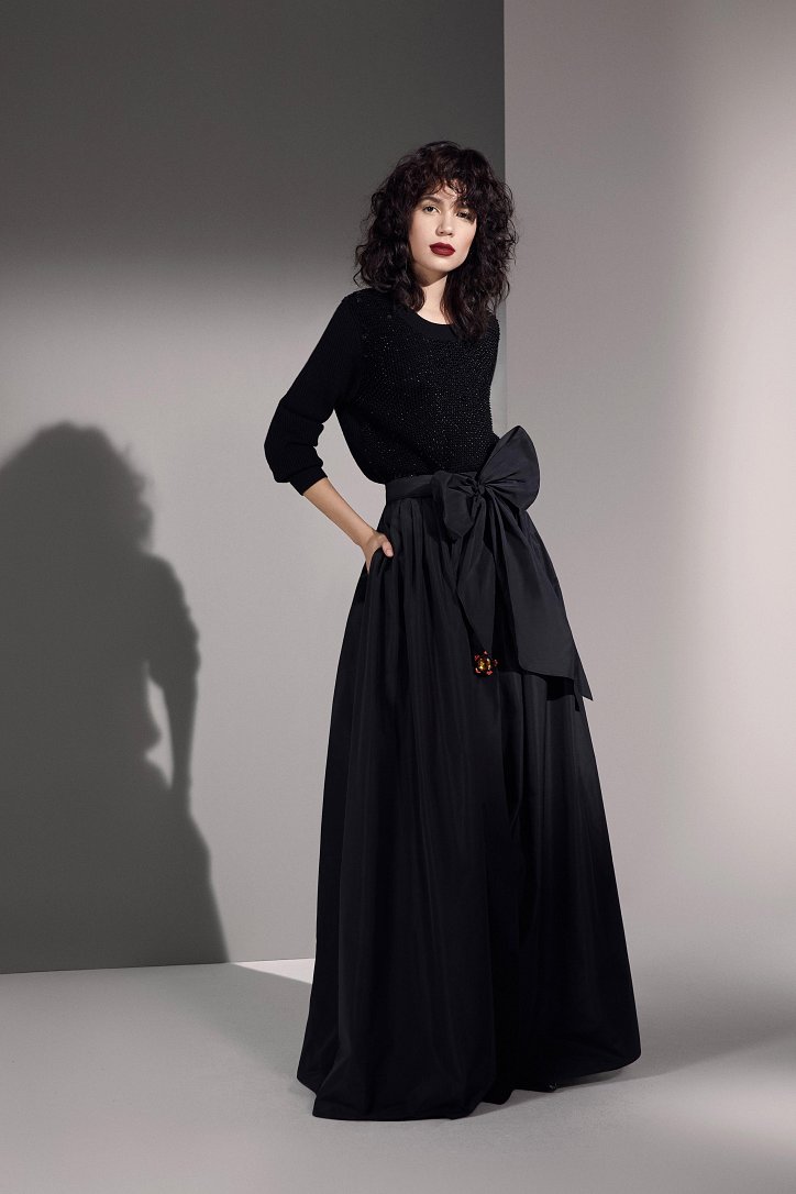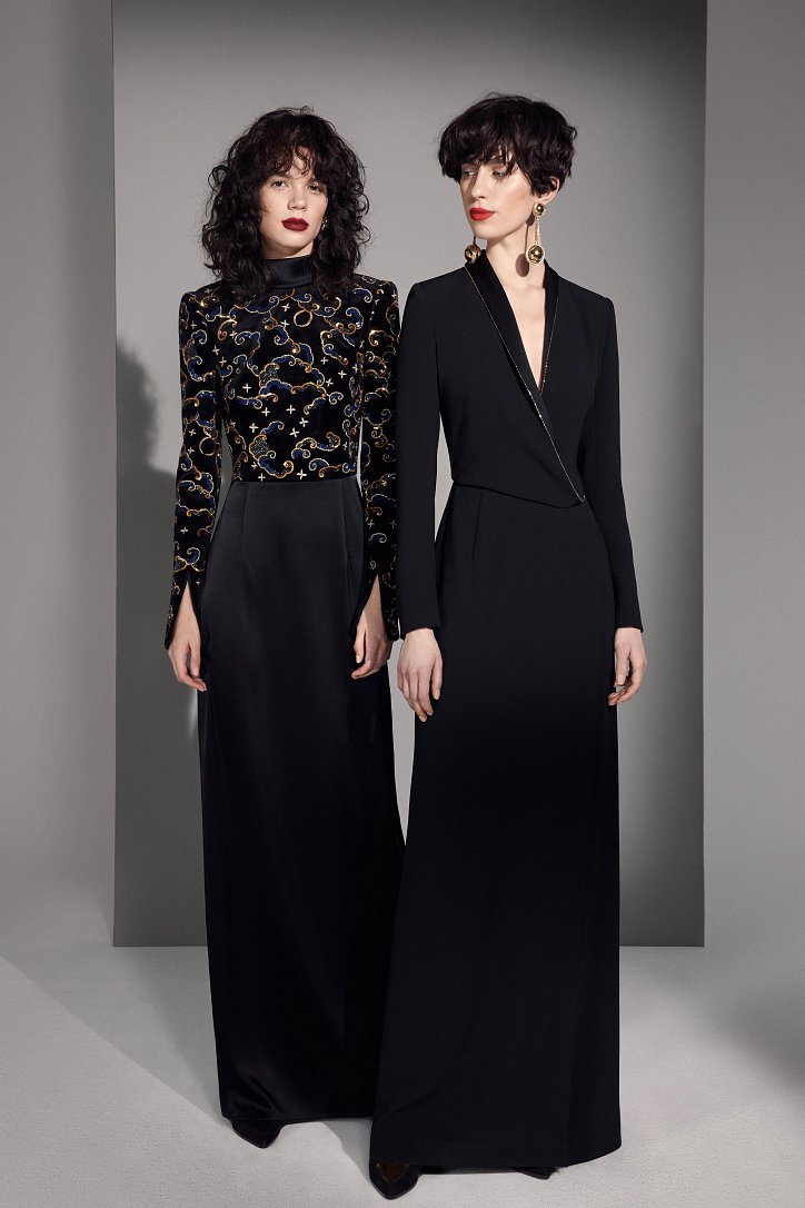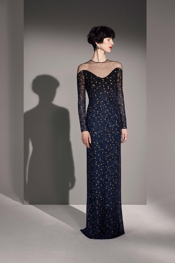 Вечерняя часть коллекции была выполнена в темно-синем, сером и черном цвете и выглядела нарядно, стильно и роскошно.