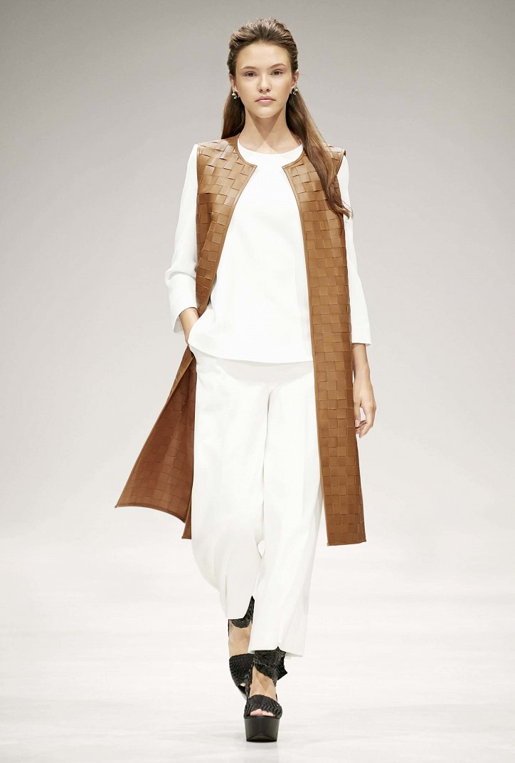 «Изюминками» коллекции стали два кожаных кардигана: светло-коричневый – словно сплетенный из полос – и черный – также с эффектом плетения и бахромой по краям.