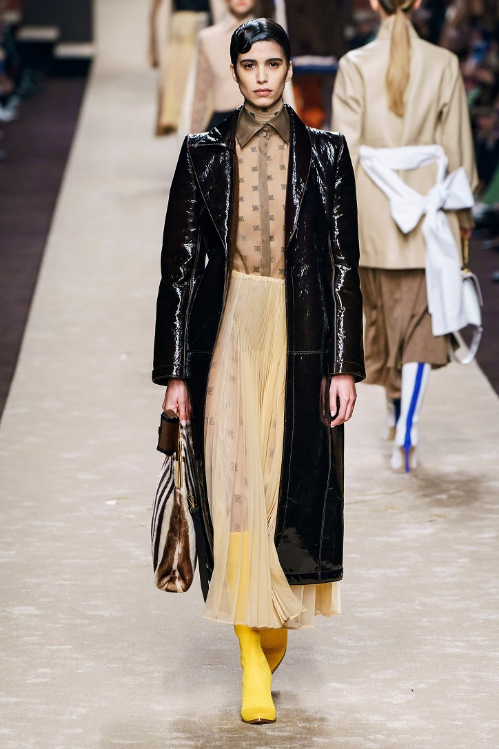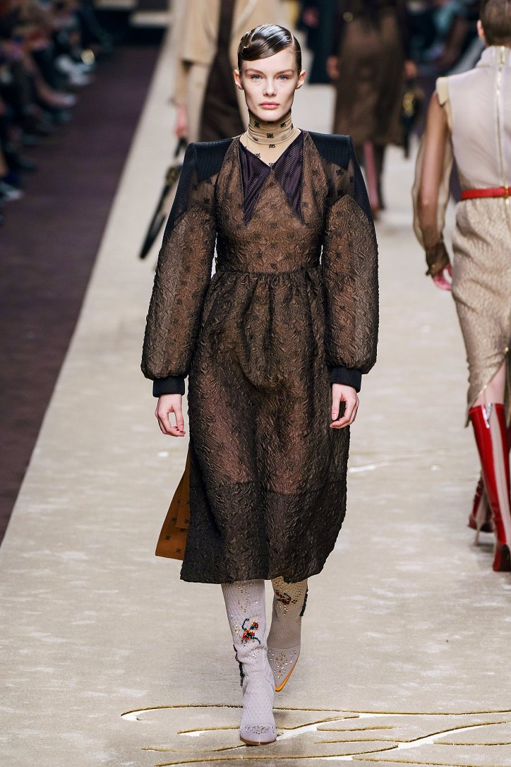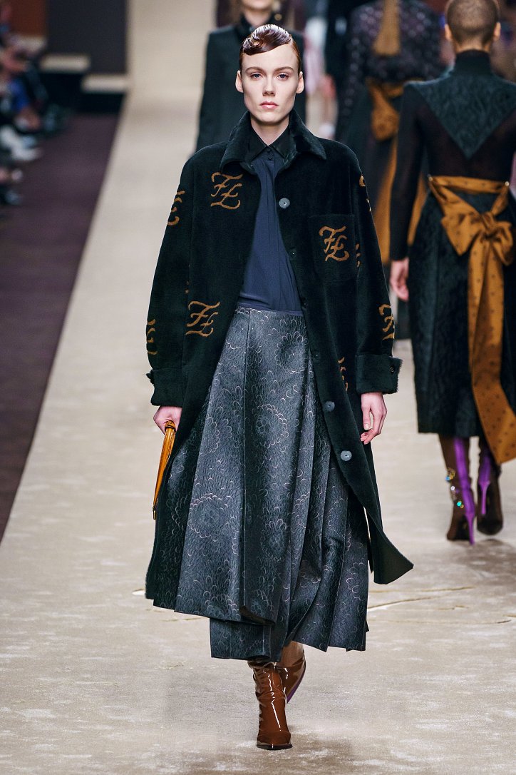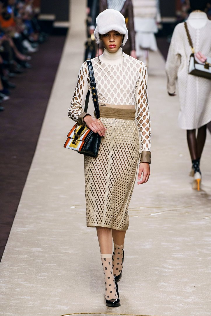 Изюминкой коллекции стали колготки, украшенные мелким принтом из двух F, – на прозрачном фоне логотип выглядел, как тату. И, конечно же, не обошлось без меха – шапки-ушанки стали один из ключевых аксессуаров коллекции.