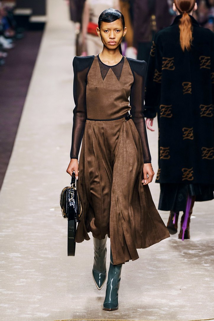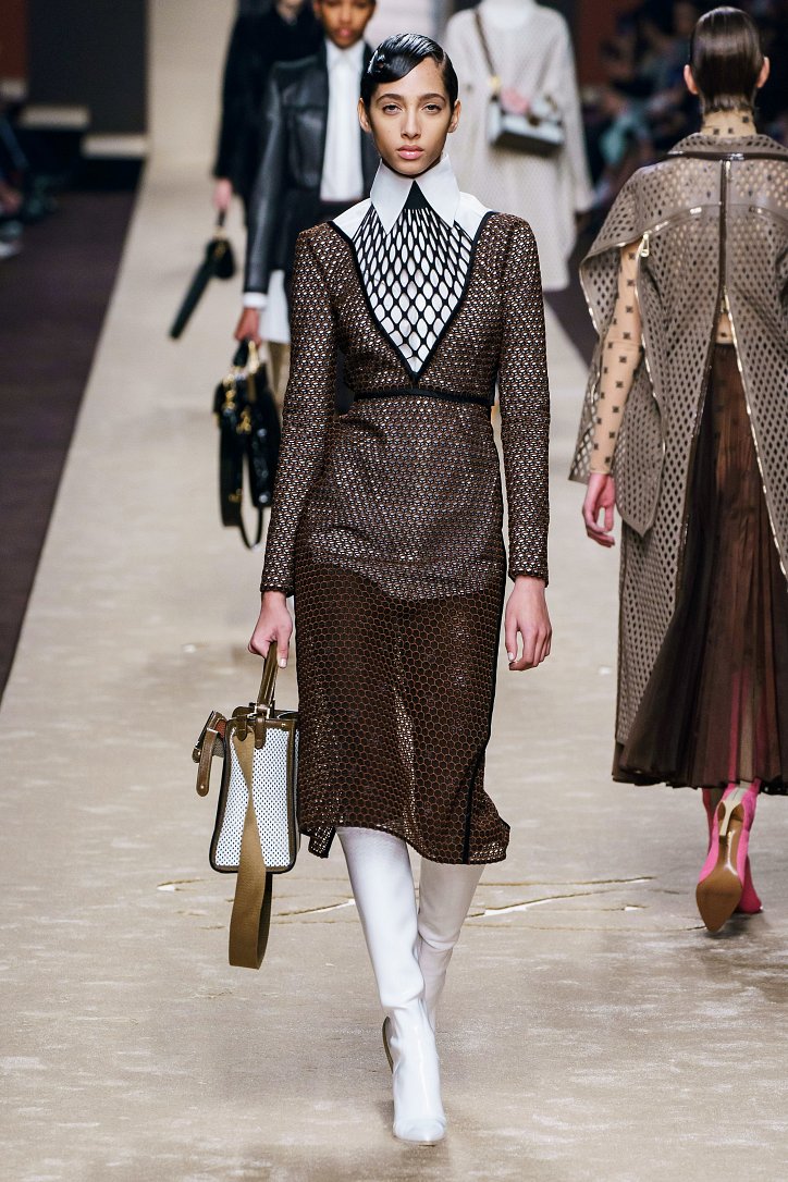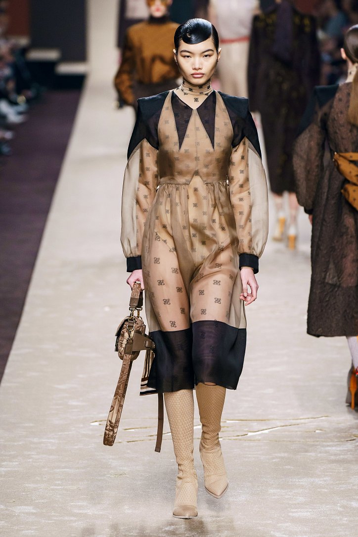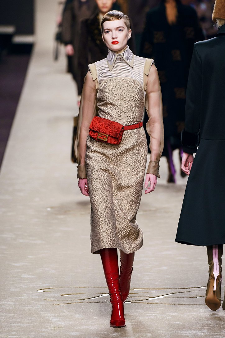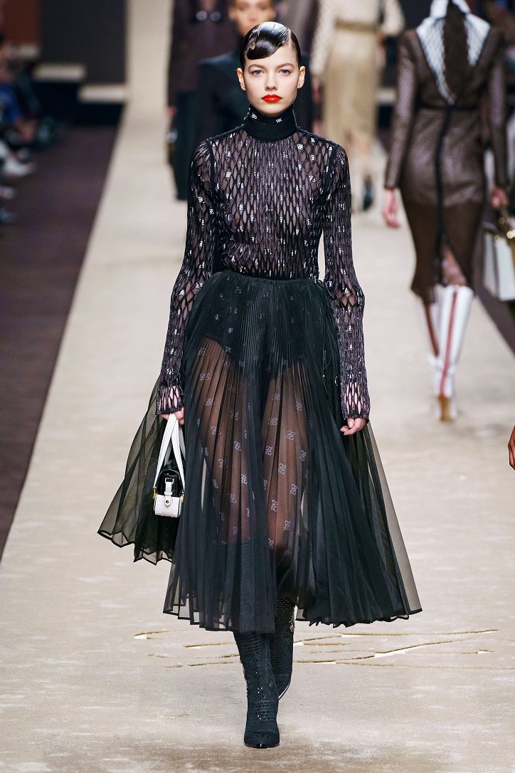 Изюминкой коллекции стали колготки, украшенные мелким принтом из двух F, – на прозрачном фоне логотип выглядел, как тату. И, конечно же, не обошлось без меха – шапки-ушанки стали один из ключевых аксессуаров коллекции.