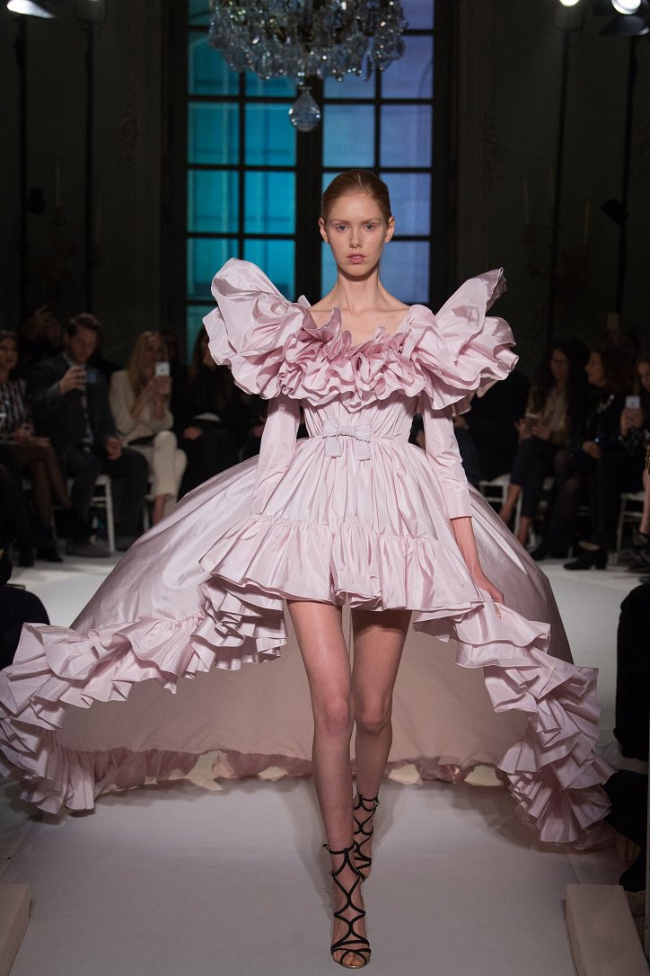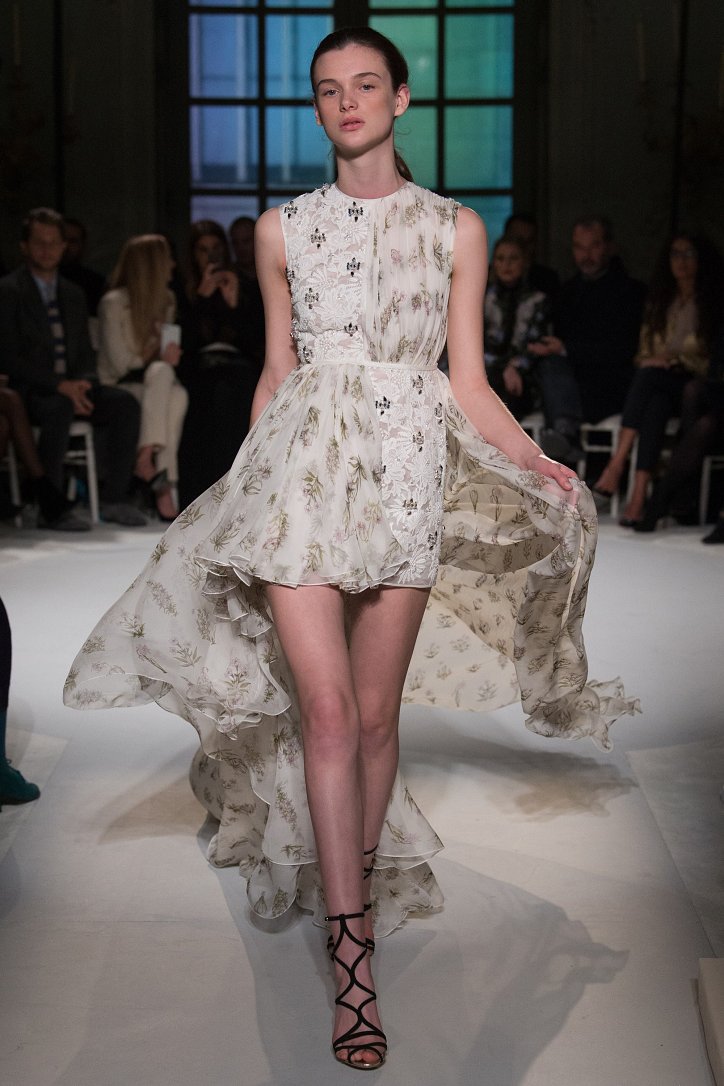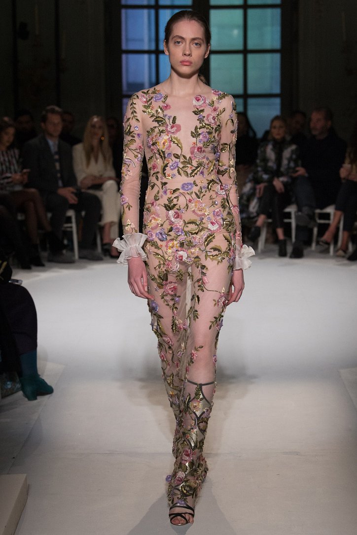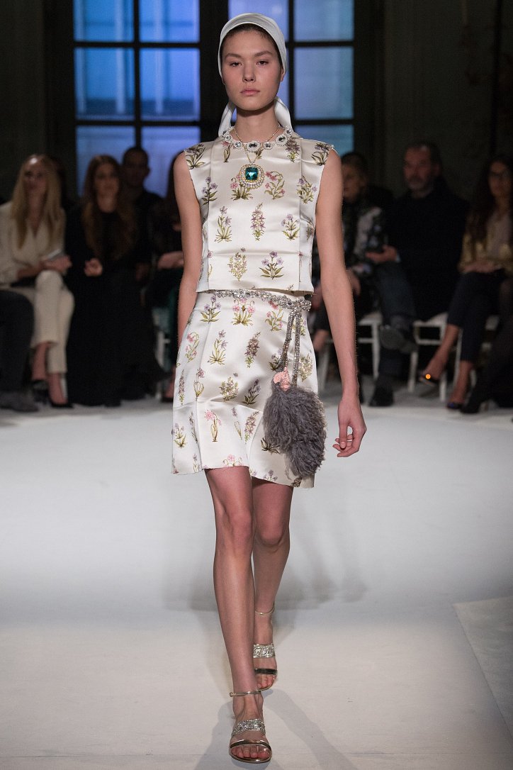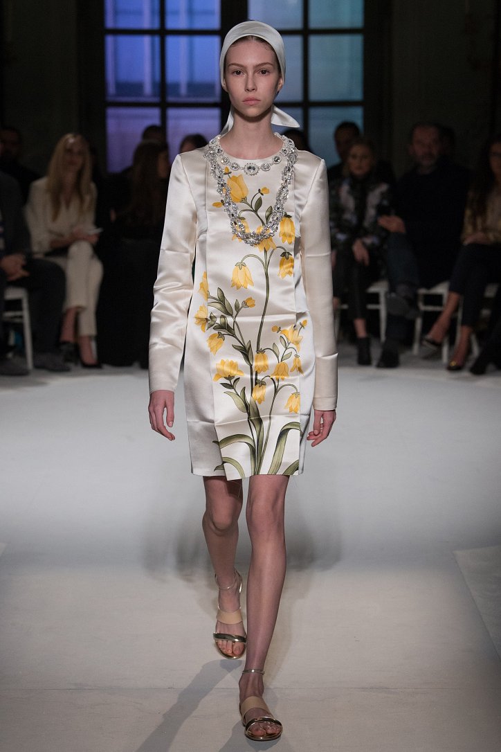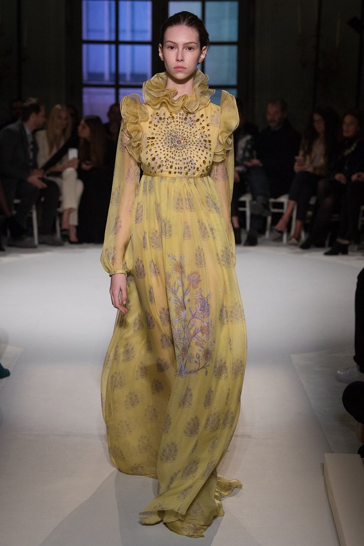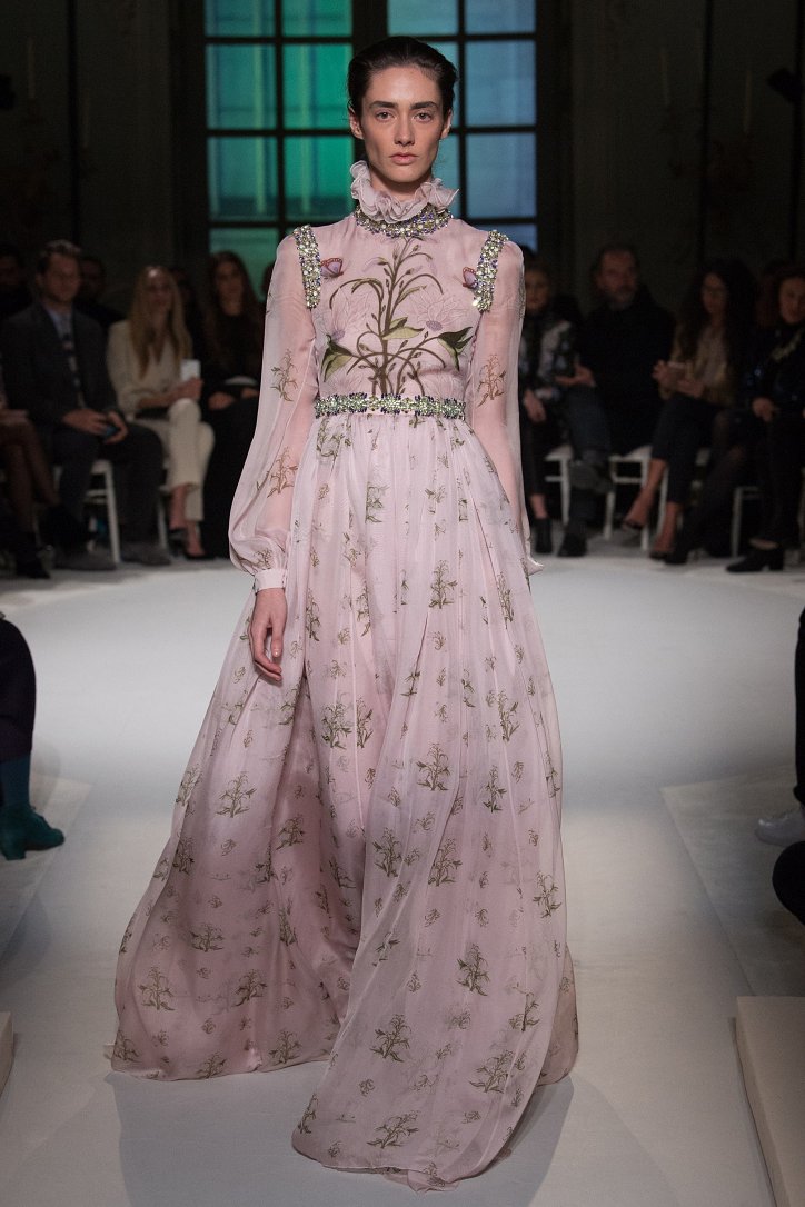 Конечно же, в коллекции Giambattista Valli Haute Couture весна 2017 были цветы! Много цветов – пастельно-нежные и яркие, мелкие и крупные, в виде принтов и объемного декора. «Главный садовник» модного Олимпа остается верен себе. Потрясающие по своей красоте букеты на этот раз распустились на пышных бальных платьях и оригинальных моделях с длинными шлейфами и мини-юбками «в анфас», коротких атласных платьицах с мятыми «заломами» и брючных костюмах в «пижамном» стиле. Там же, где цветов не было, в распустившиеся бутоны превращались сами платья – благодаря огромному количеству рюшей, оборок, воланов, пышным каскадным юбками и «волнистым» воротникам-«стоечкам».