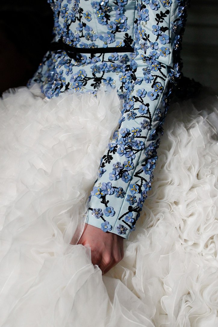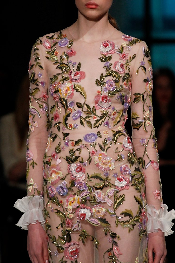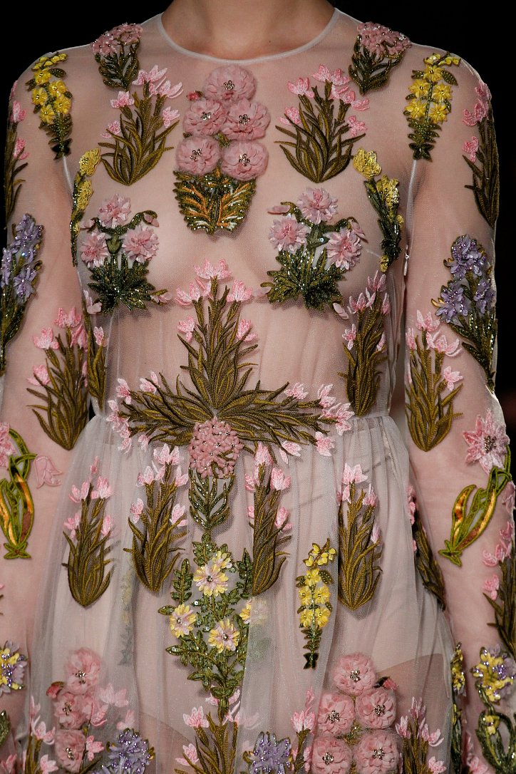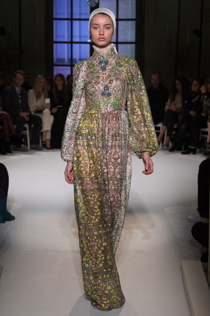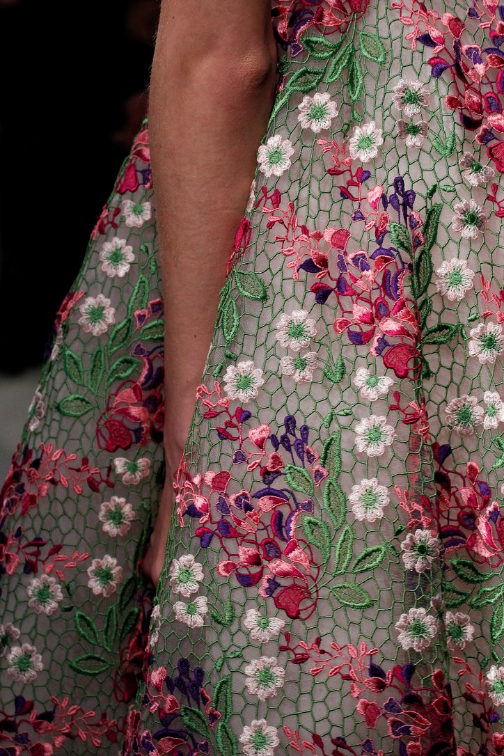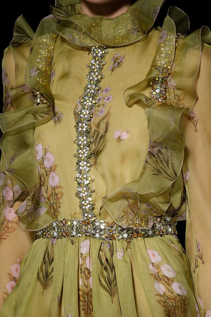Конечно же, в коллекции Giambattista Valli Haute Couture весна 2017 были цветы! Много цветов – пастельно-нежные и яркие, мелкие и крупные, в виде принтов и объемного декора. «Главный садовник» модного Олимпа остается верен себе. Потрясающие по своей красоте букеты на этот раз распустились на пышных бальных платьях и оригинальных моделях с длинными шлейфами и мини-юбками «в анфас», коротких атласных платьицах с мятыми «заломами» и брючных костюмах в «пижамном» стиле. Там же, где цветов не было, в распустившиеся бутоны превращались сами платья – благодаря огромному количеству рюшей, оборок, воланов, пышным каскадным юбками и «волнистым» воротникам-«стоечкам».