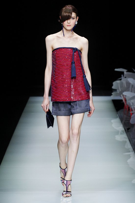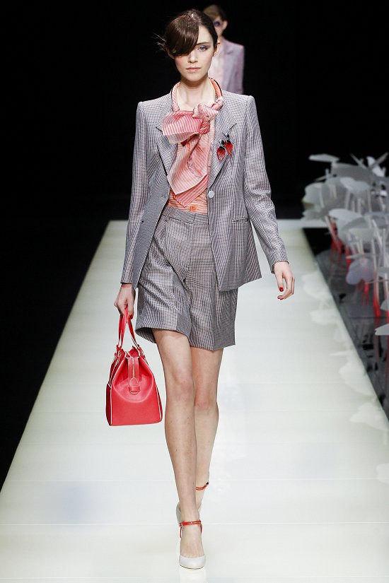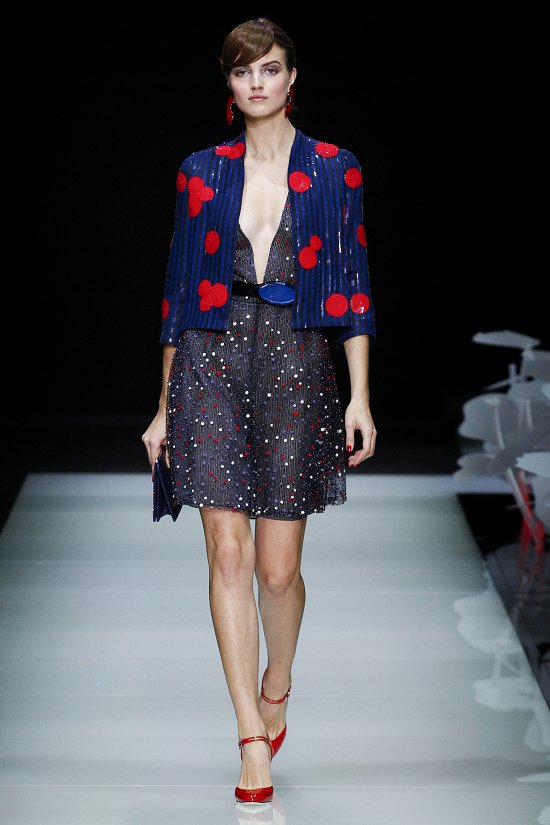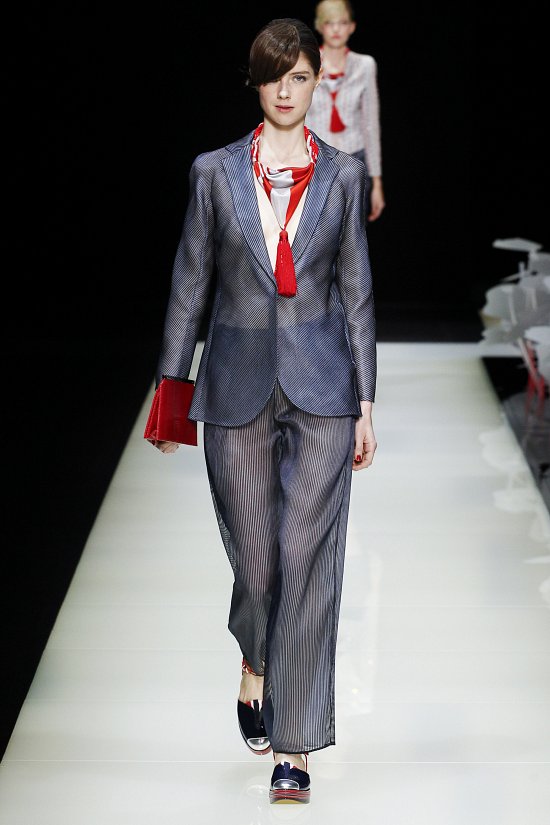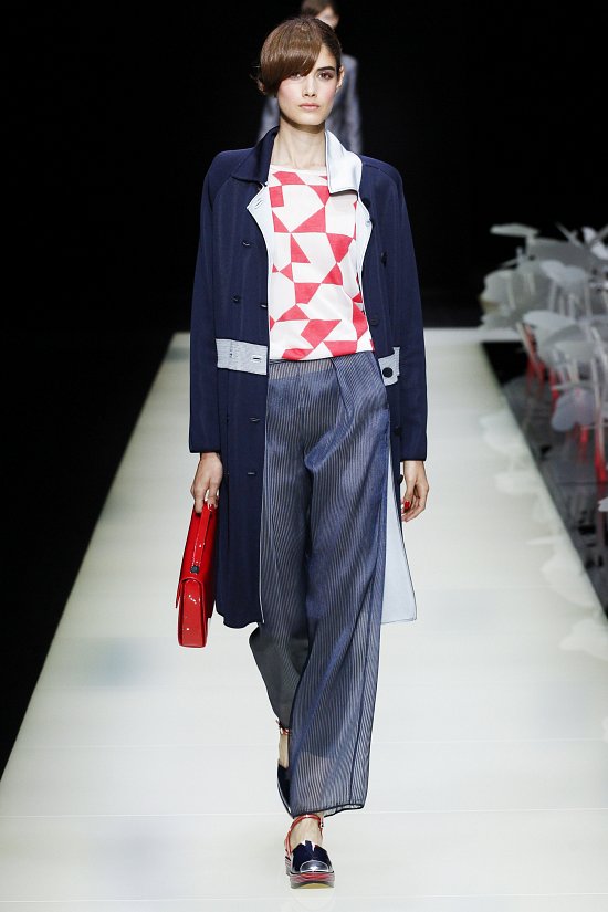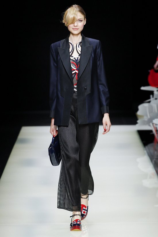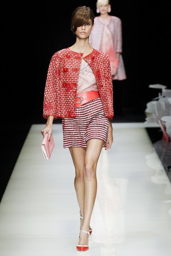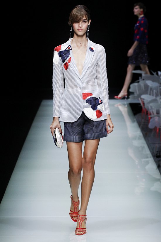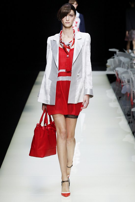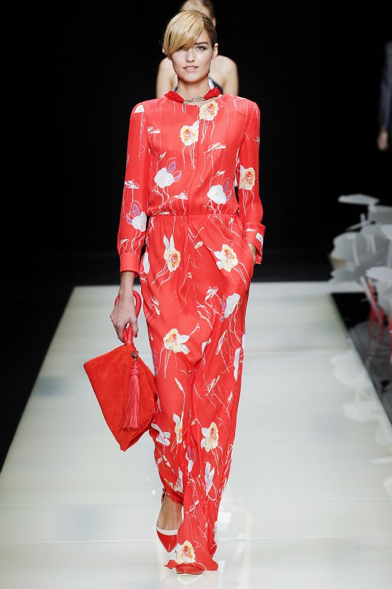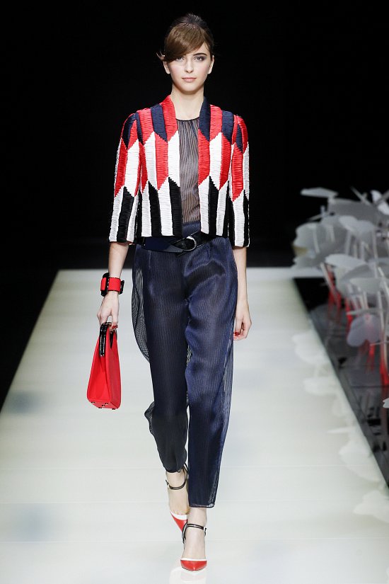 К 40-летнему юбилею бренда мэтр приготовил сюрприз – главным цветом коллекции Giorgio Armani весна-лето 2016 стал красный! Его можно было заметить везде – в скромных полосках принтов и вырывающимся сполохами из-под юбок вечерних платьев, замысловатых переплетениях жакетов и насыщенных тонах аксессуаров. Он был так прекрасен и так многолик – оттенки зари и вина, герани и красной гвоздики, с оранжевым и розовым подтоном… Что же до любимых дизайнером серого и синего, они прекрасно дополнили красную гамму, придав коллекции изящества, легкости и функциональности, чем и славится Giorgio Armani. Сама же коллекция не была революционной: костюмы с шортами, летние пальто, брюки-палаццо, блузы, короткие комбинезоны, коктейльные и вечерние платья.