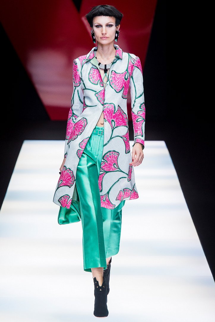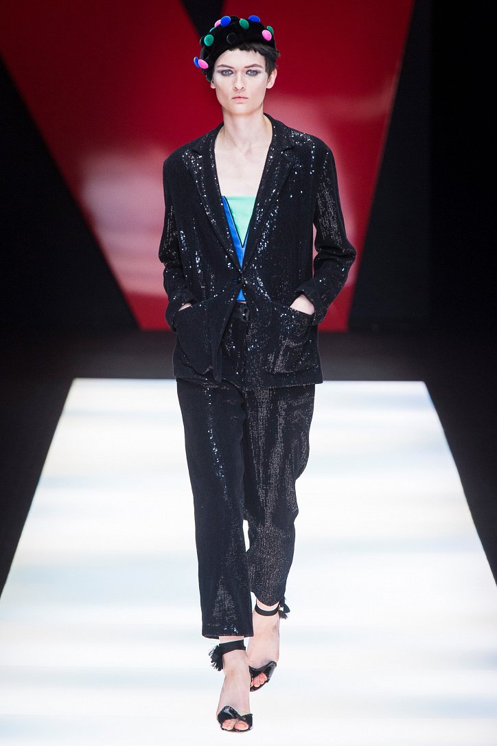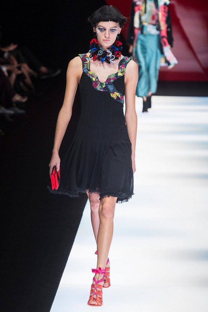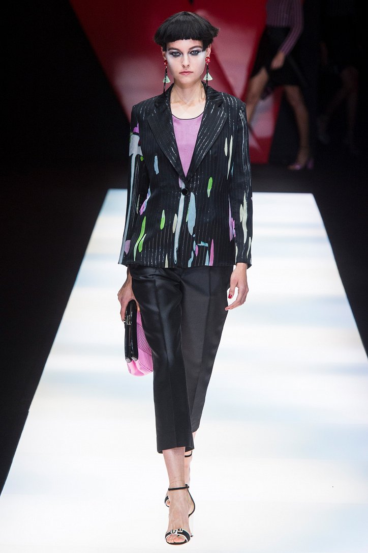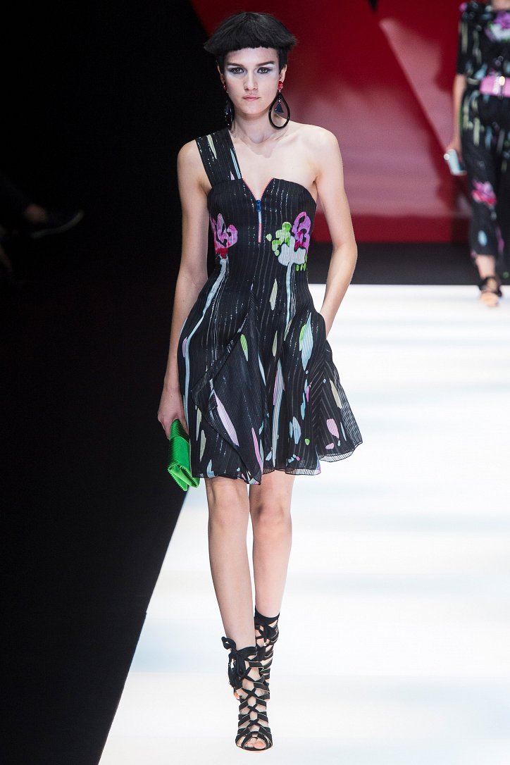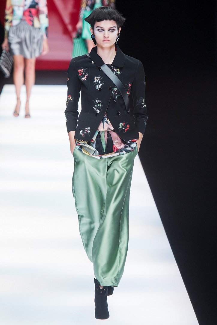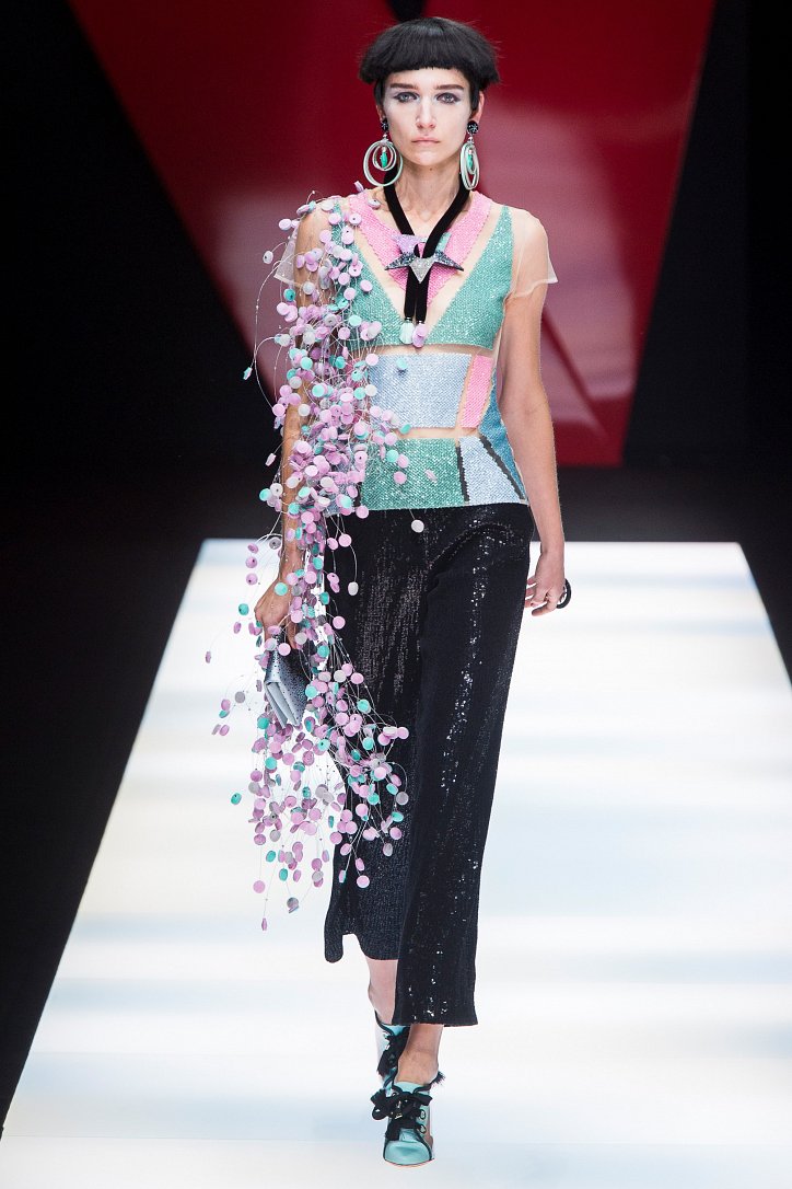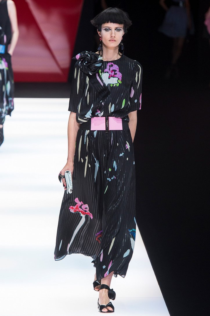 Наиболее эффектно яркие цветы смотрятся на черном фоне. Об этом еще раз напомнил нам маэстро Джорджио Армани. Впрочем, вся коллекция Giorgio Armani весна-лето 2018 – это игра на контрастах. Строгий крой перемежается с легкомысленными рюшиками, полупрозрачные модели из шифона – с плотными жакетами с асимметричной застежкой. Объединяло коллекцию одно – ощущение праздника. Яркая цветочная палитра в сочетании с черным цветом напоминала фейерверк в ночном небе. Мерцающий атлас и металлизированные ткани, усыпанные блесками брюки, топы и удивительной красоты черные брючные костюмы, шарфики и боа, похожие на новогодние гирлянды, и берет с помпонами-конфетти – все в лучших традициях Армани!
